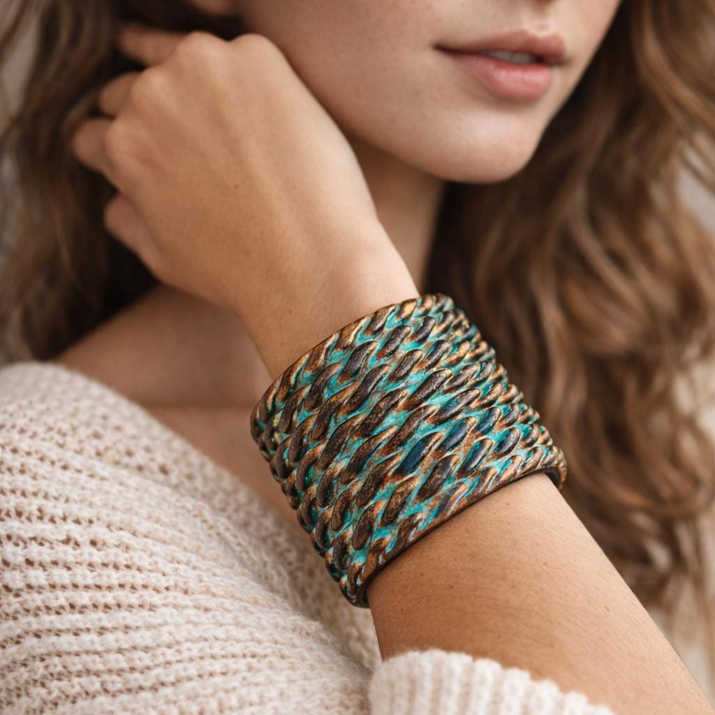 This handcrafted polymer clay cuff features layered bronze, copper, and patina tones that create a richly weathered, metal-inspired finish — without the weight of metal.