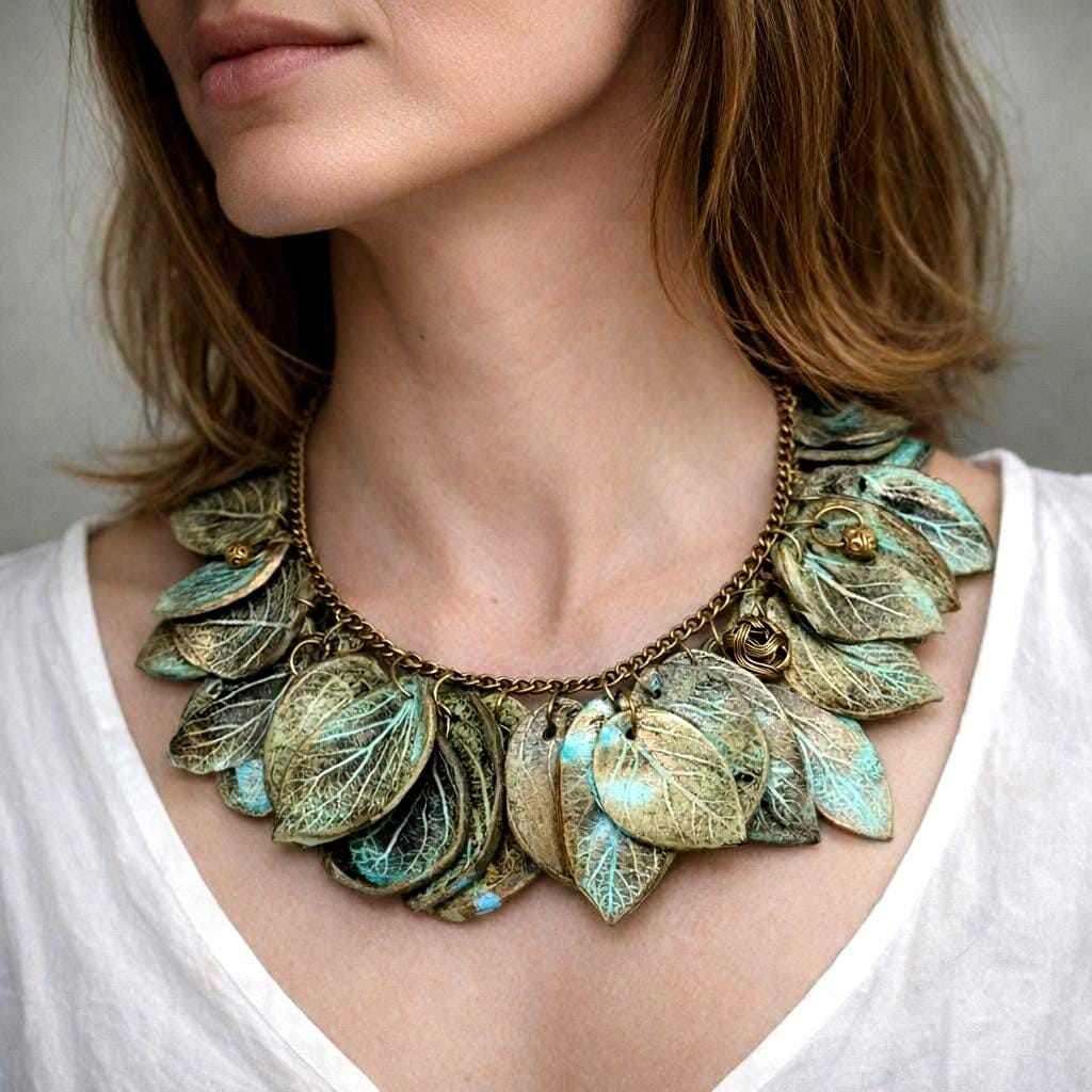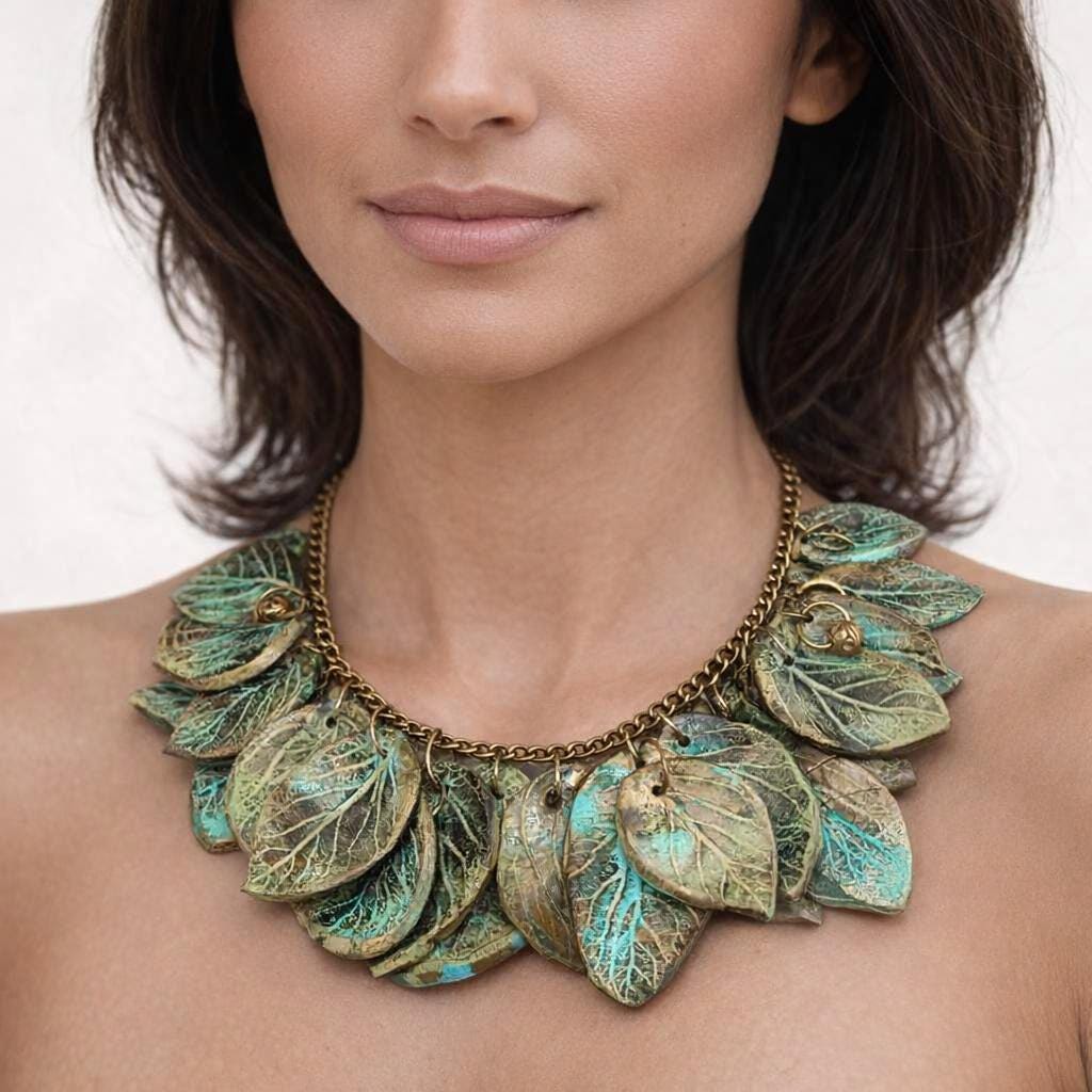 This is one of my signature necklaces. It features an array of antiquated, distressed old gold leaves covered by a layer of patina. The leaves are very detailed and realistic. They were made out of polymer clay, which is why the necklace is very light and comfortable to wear as opposed to one made of metal. Yet there would be no discernible difference between the two.
