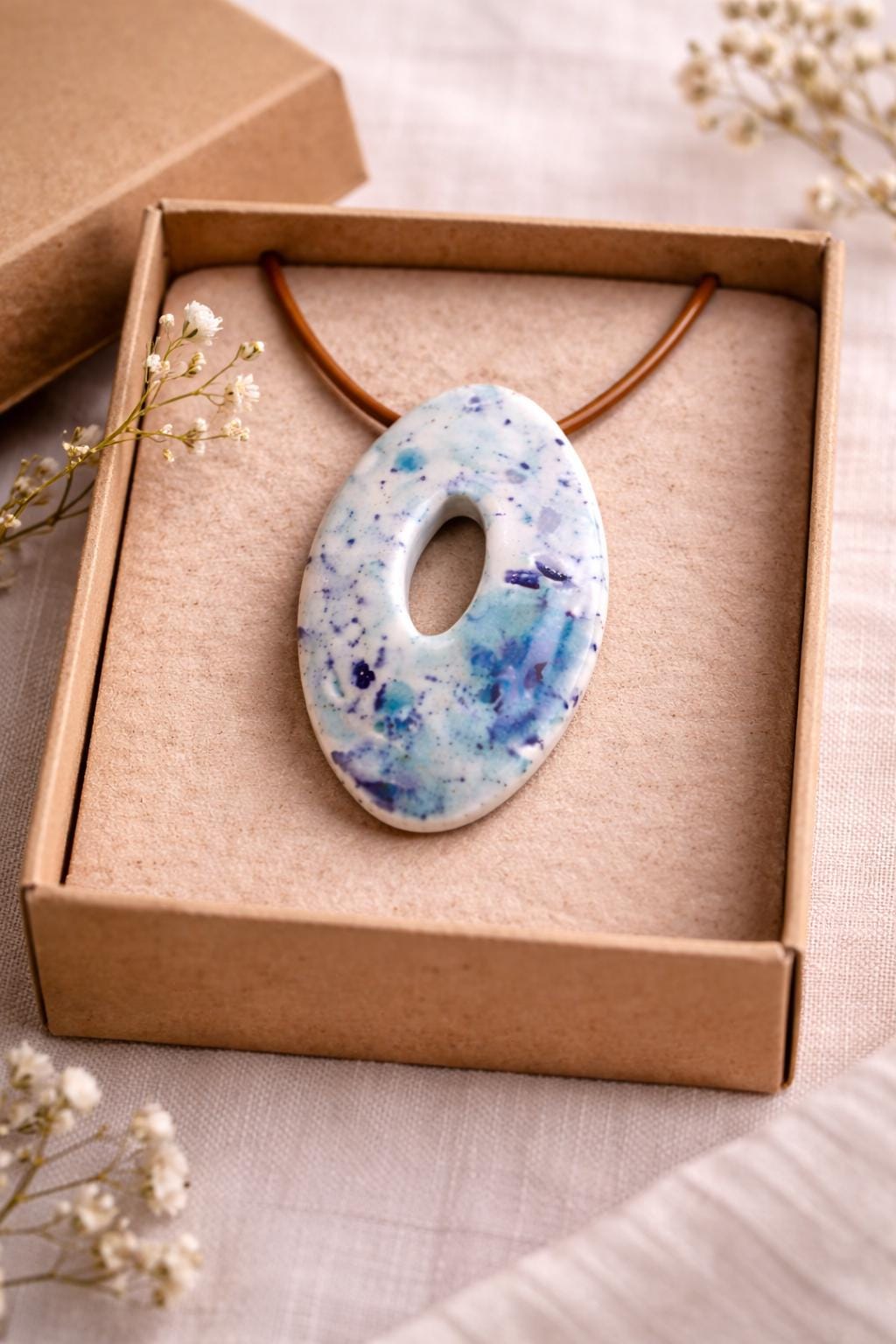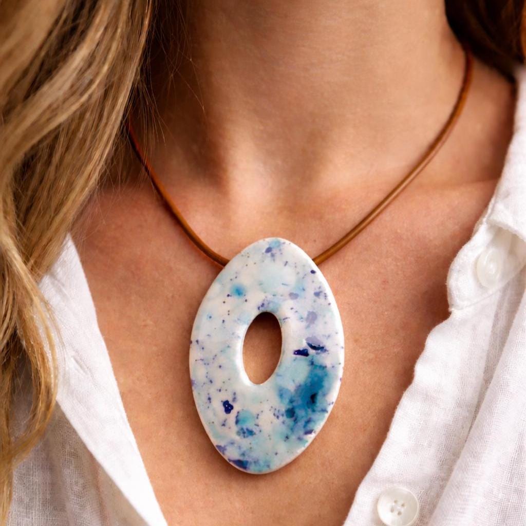 A sculpted ceramic pendant with a gently convex front and hollowed back, shaped like a small spoon or shell. Hand-glazed in ocean blues and soft whites, each piece has natural variations that make it quietly unique. Finished on a leather cord for an organic, wearable feel.