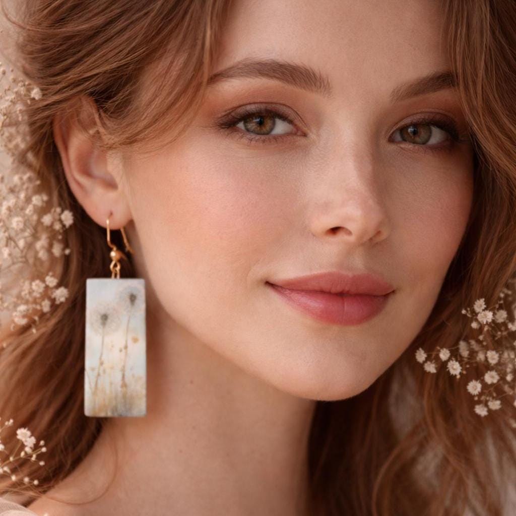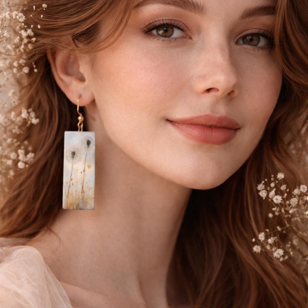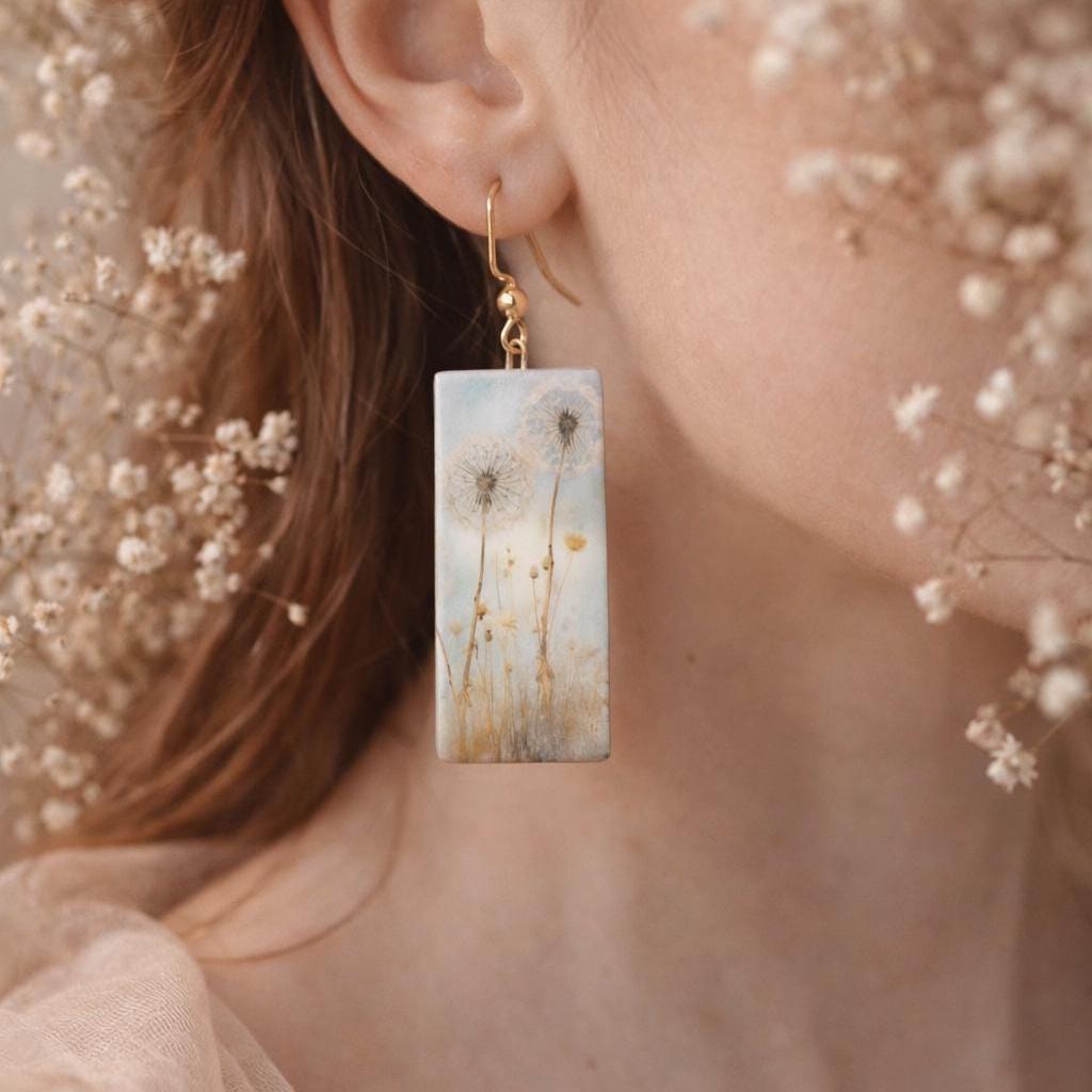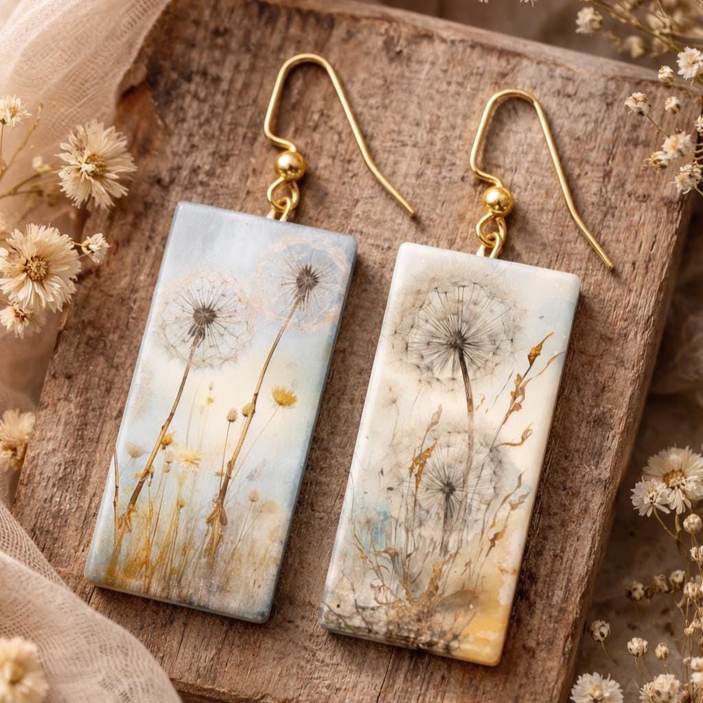 These are handmade earrings featuring a fantasy image of dandelions. They are made from polymer clay using my image transfer technique.