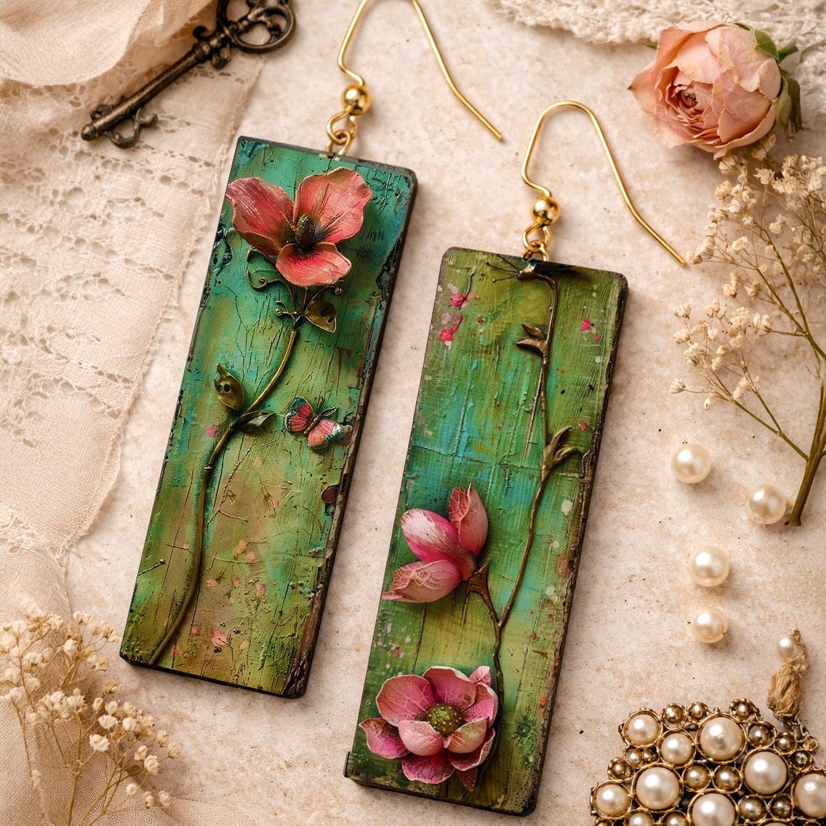 The floral design is created using a specialized image-transfer process developed and refined by me over many years. The artwork is carefully transferred onto polymer clay, then sealed and hand-finished to create a durable, wearable surface with a softly aged, romantic finish.