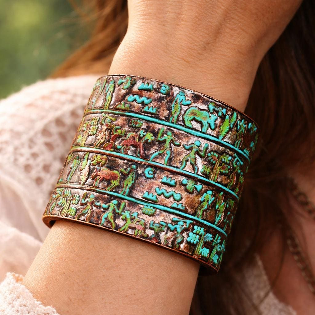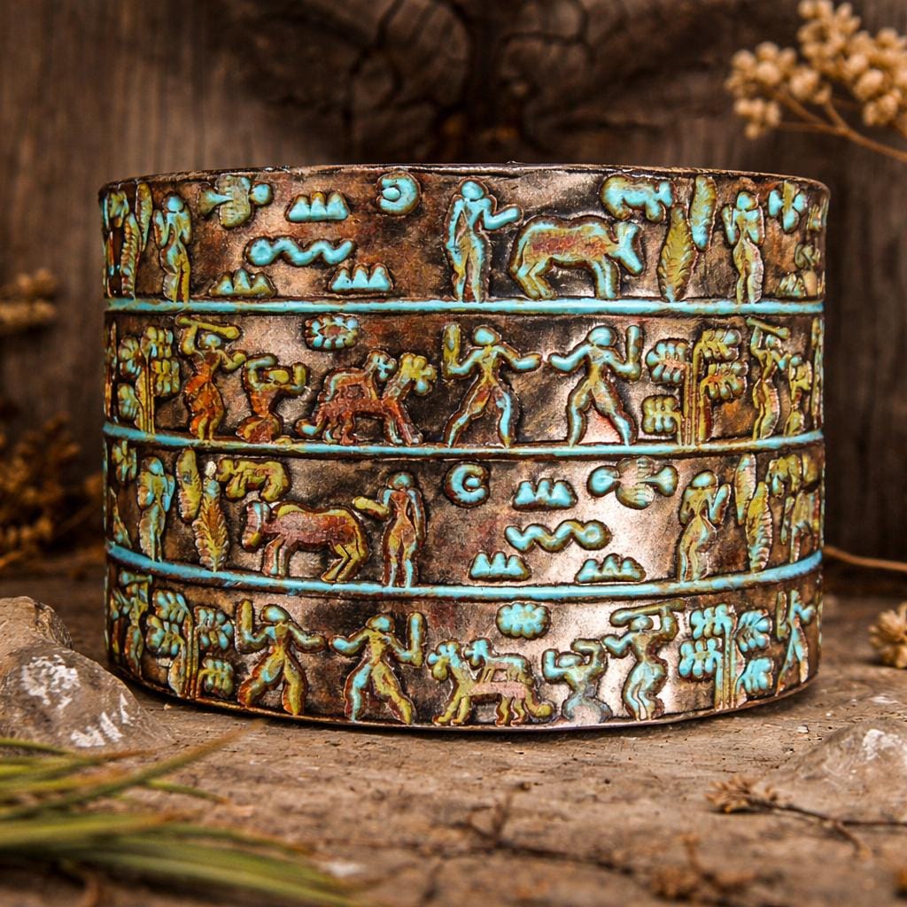 This cuff bracelet feels like a fragment of an ancient story — symbols, figures, and animals moving in quiet rhythm around the wrist.