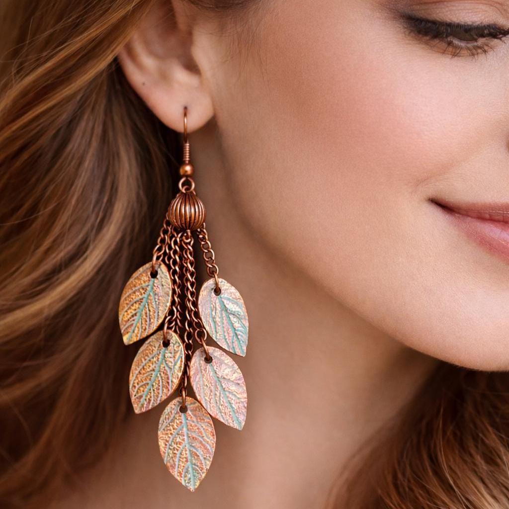These made to order dangle earrings are handcrafted from polymer clay. They feature each 5 small leaves in copper and patina, a small matching bead reminiscent of a bud, all suspended on a matching nickel-free copper earring hook.