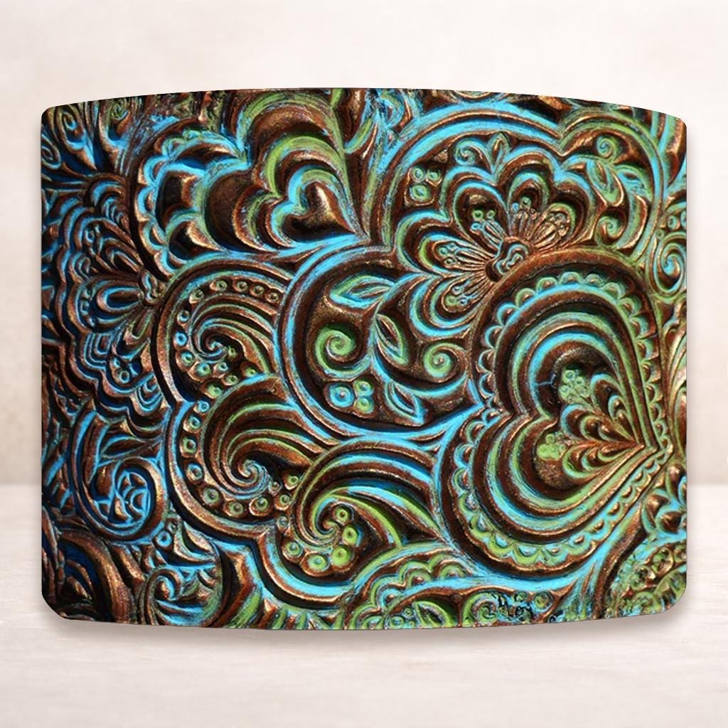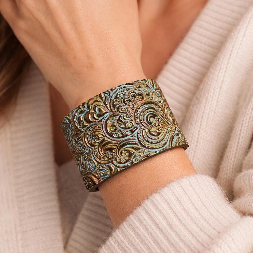 A sculptural polymer clay cuff bracelet featuring intricate zentangle heart detailing over a layered patina surface. Designed as wearable art, this wide cuff bracelet is inspired by aged bronze and oxidized copper tones.