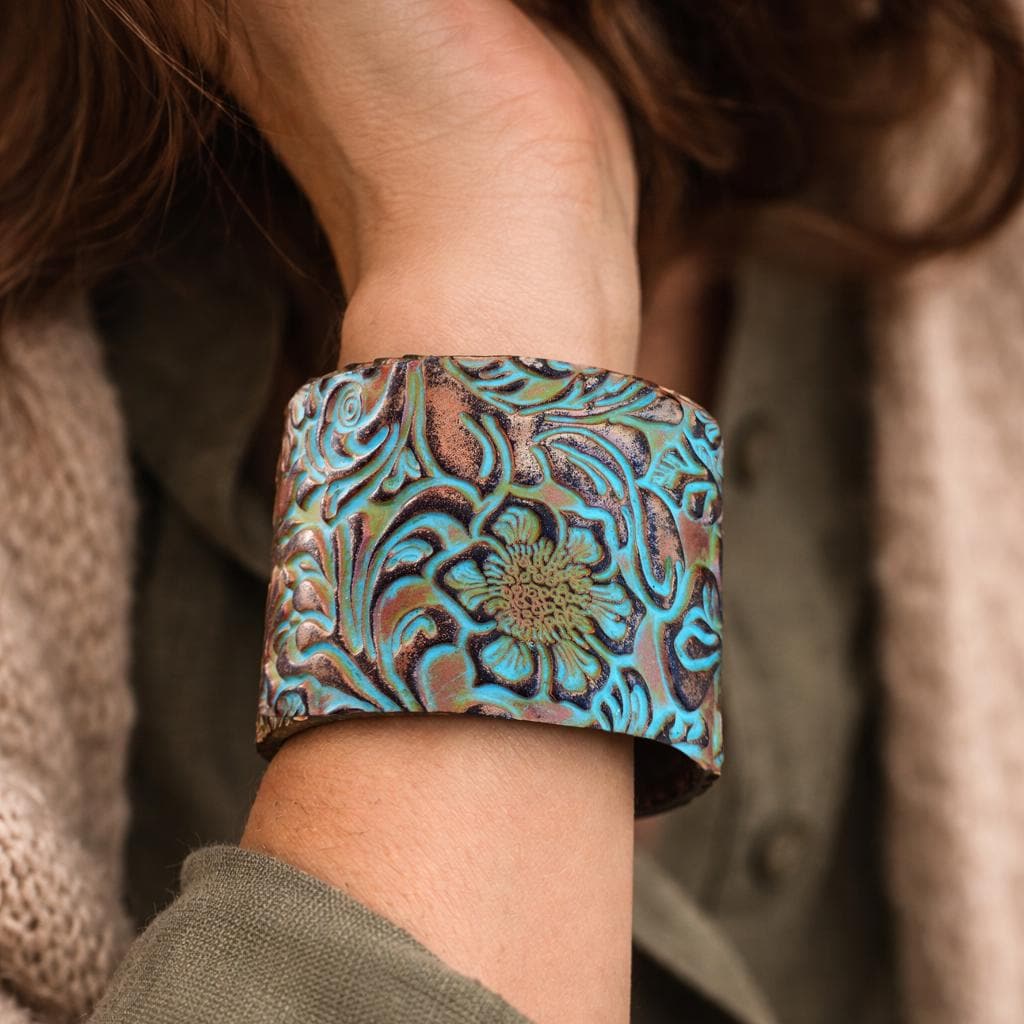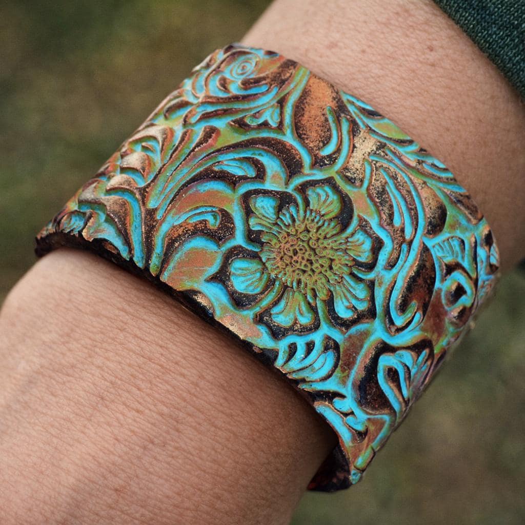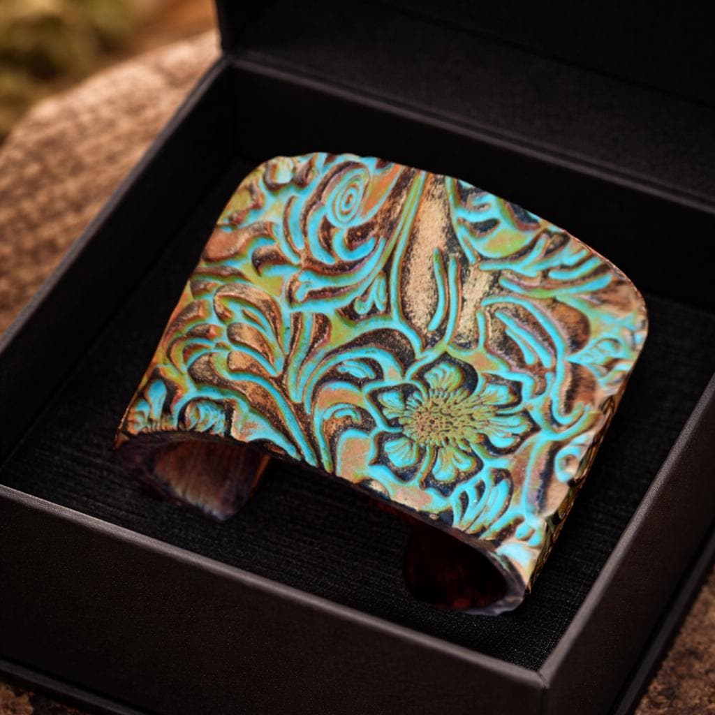 This handcrafted cuff bracelet is a wearable piece of art, created entirely by hand in my studio. Sculpted from polymer clay and carefully finished to achieve rich texture and depth, each cuff features an intricate floral motif inspired by organic forms and aged surfaces.