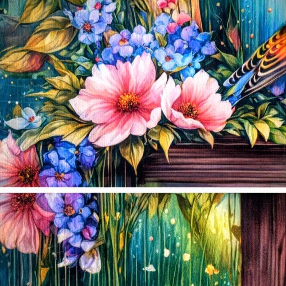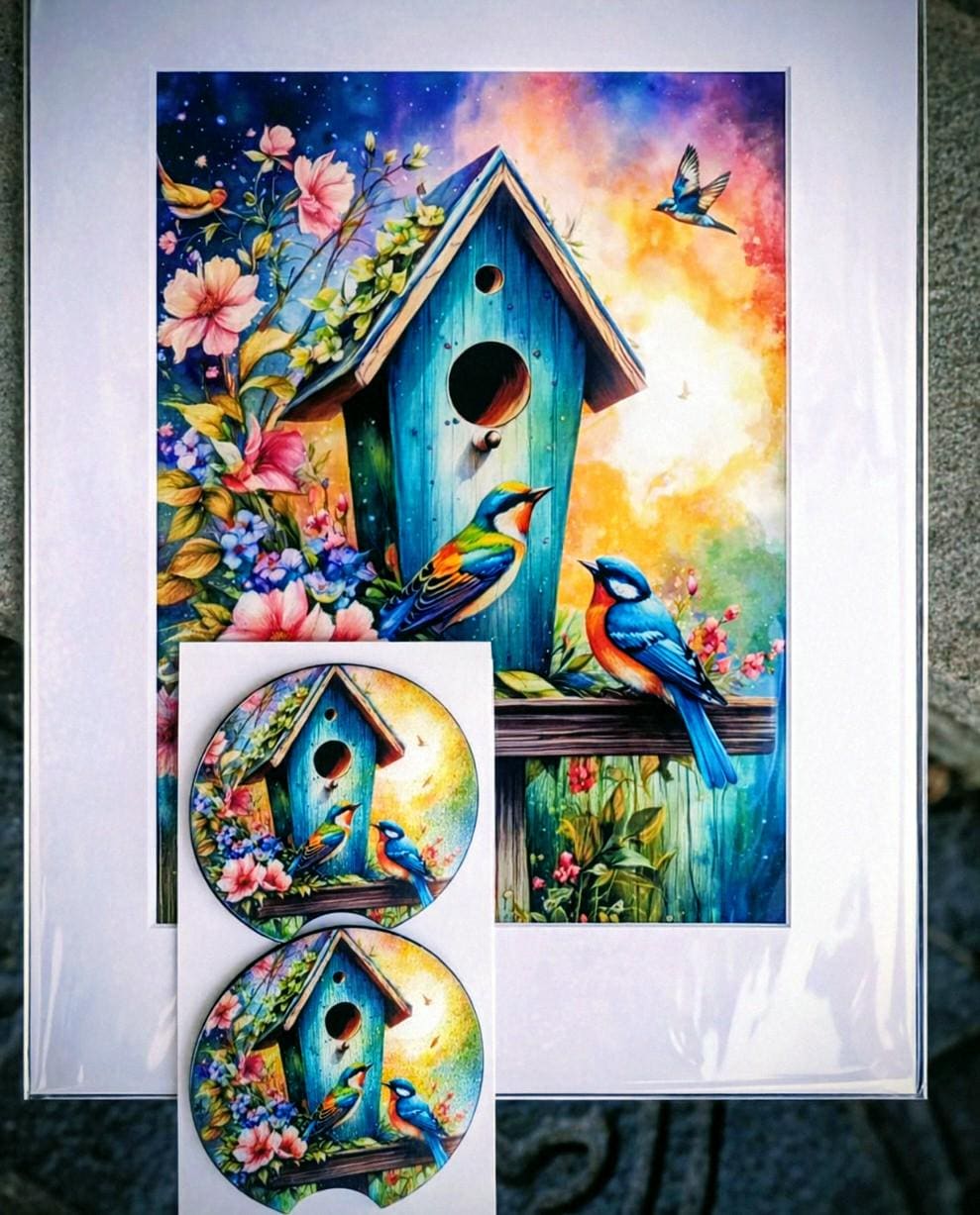 Bring a burst of nature’s beauty into your home or on the go with this stunning, vividly detailed artwork of two colorful birds perched by a rustic birdhouse, surrounded by lush flowers under a dreamy sunset sky. Perfect for bird lovers, garden enthusiasts, and anyone who wants to add a touch of joy to their space or style.