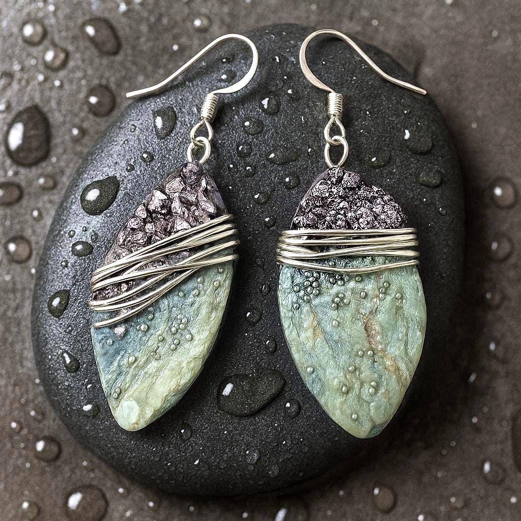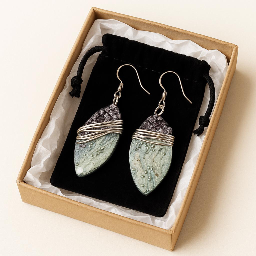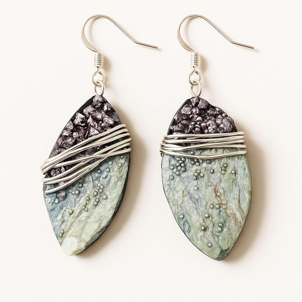 Step into the wild beauty of nature with these one-of-a-kind handcrafted earrings. Featuring sculpted leaf-shaped forms with a rich, earthy texture, these earrings are adorned with raw crystal accents and silver-tone wire wrapping. The surface shimmers in natural tones of sage green, stone gray, and deep amethyst-like purple, creating a moody, organic palette.
