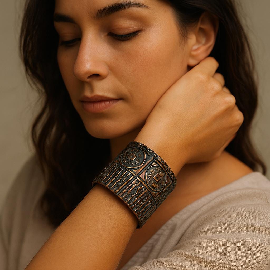 Each cuff is individually sculpted, textured, and painted by hand, creating a realistic metal-like finish with rich shades of bronze, green, and blue iridescence. Though it looks like aged metal, this piece is lightweight and comfortable, making it perfect for all-day wear.