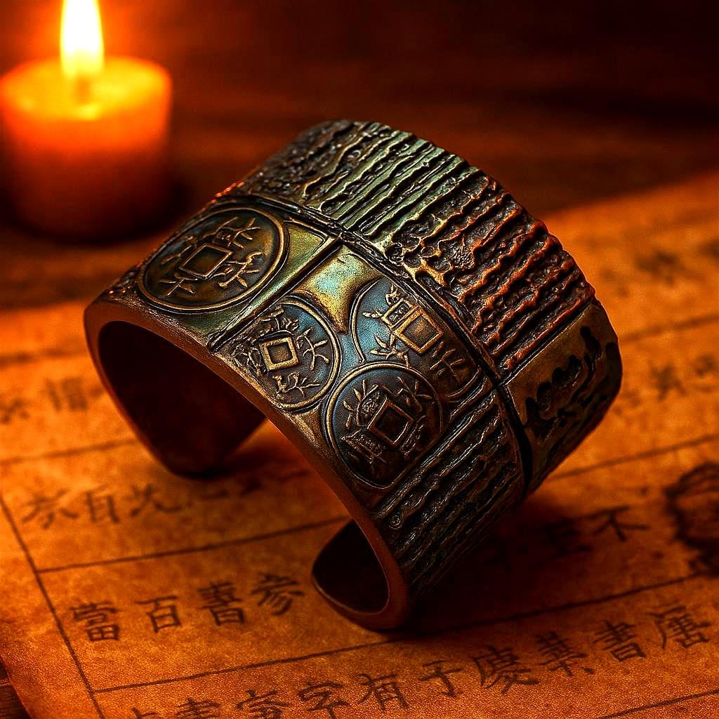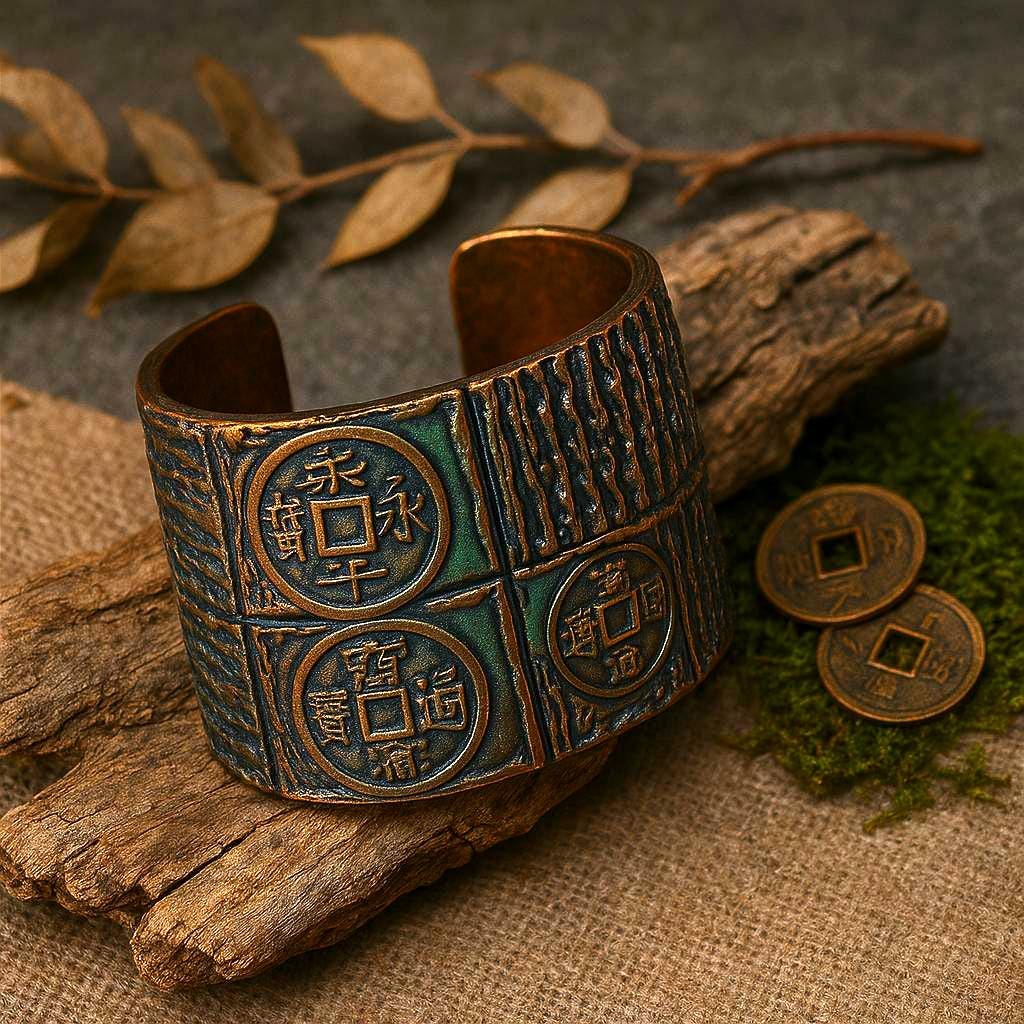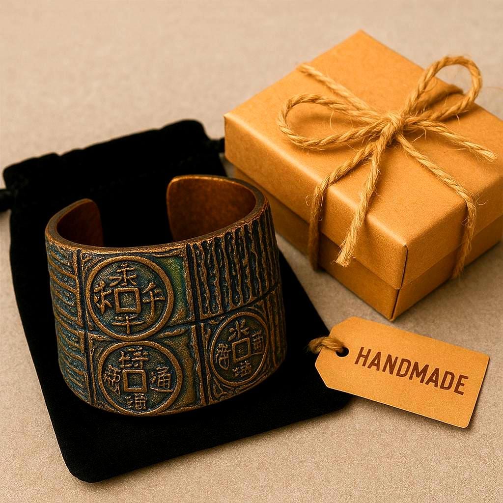 Step into history with this one-of-a-kind artisan cuff bracelet, handcrafted from polymer clay and finished with a mesmerizing oxidized bronze patina. Inspired by ancient Chinese coins, this design captures the mystery of antiquity and the beauty of timeless craftsmanship.