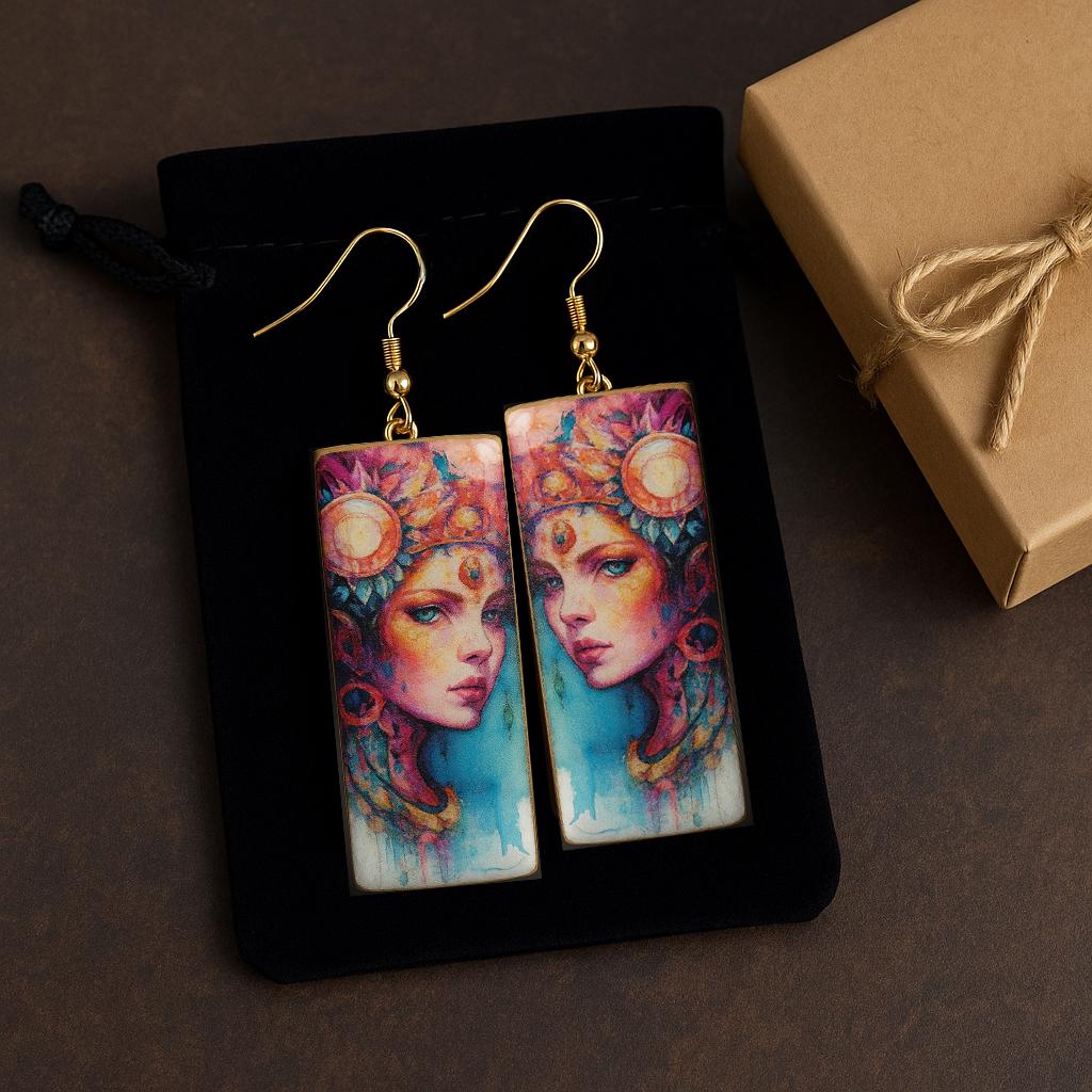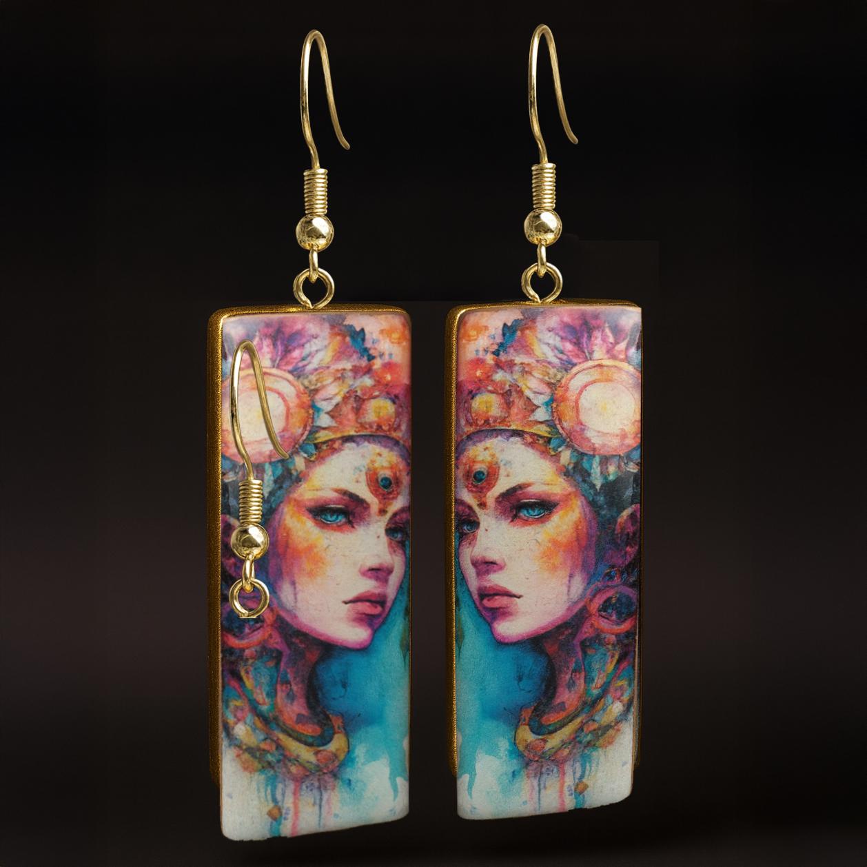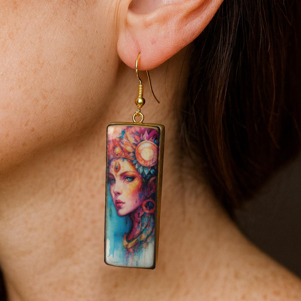 Elevate your style with these one-of-a-kind handmade earrings, featuring a vibrant goddess portrait in rich watercolor tones. Each piece is lovingly crafted from polymer clay and sealed with a glossy resin layer for lasting beauty and shine.