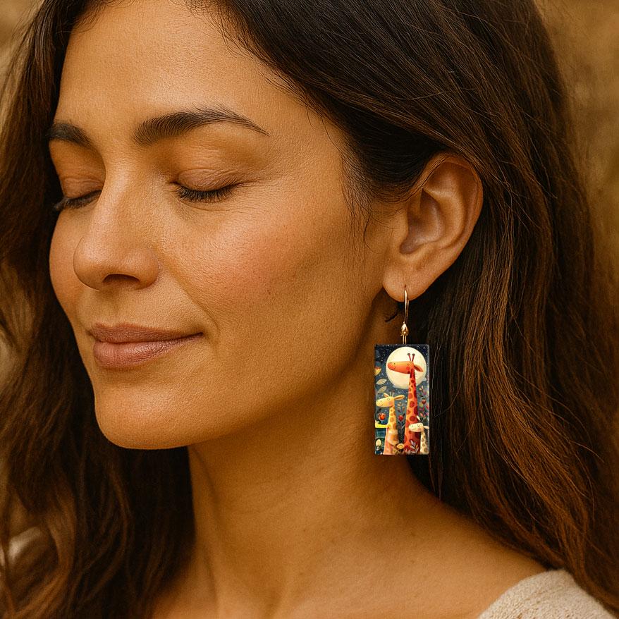 Bring a touch of playful charm to your look with these Whimsical Giraffe Family Earrings, featuring an adorable giraffe family basking under a glowing moon. Each earring is handmade from high-quality polymer clay.