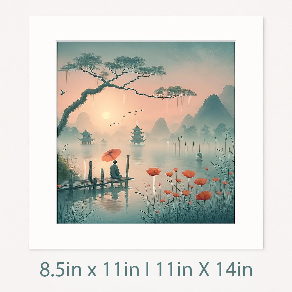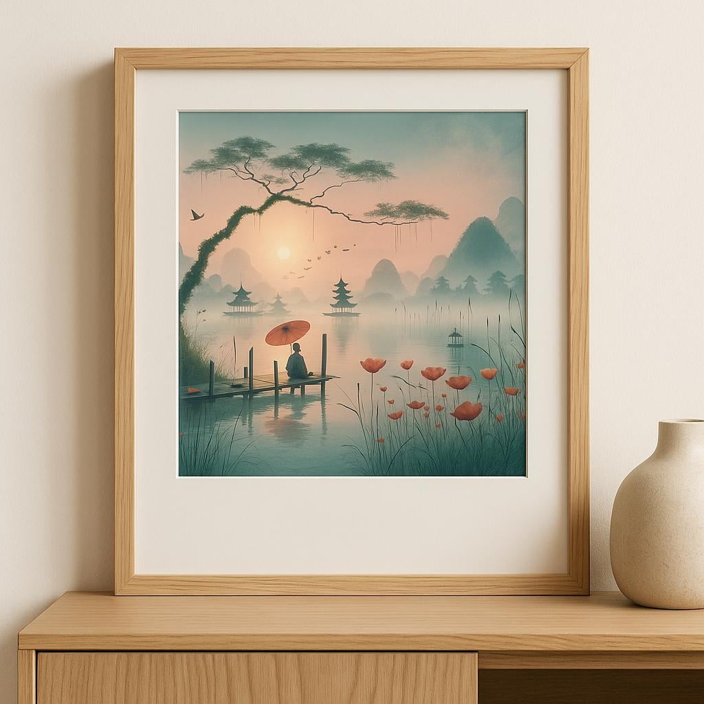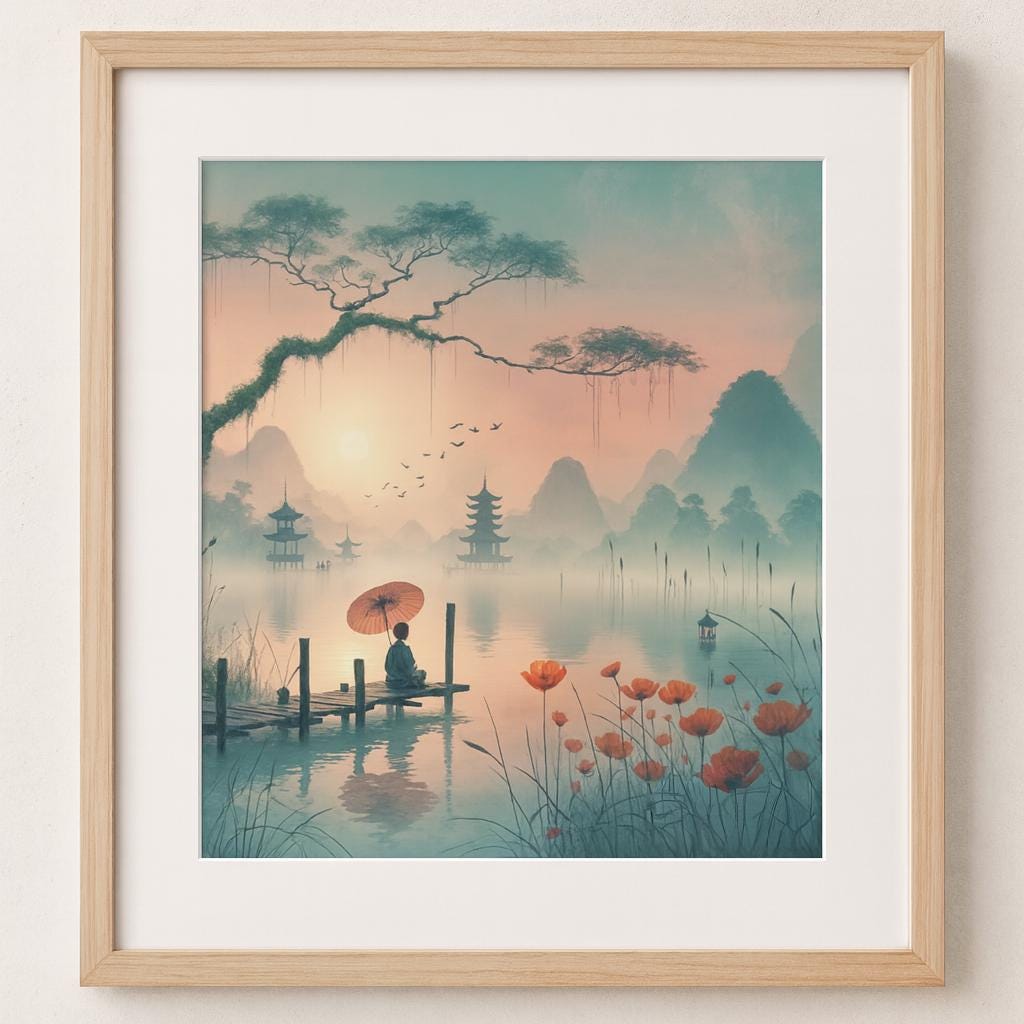 Bring tranquility and quiet beauty into your home with this serene East Asian–inspired landscape art print. A lone figure rests on a wooden pier beneath a parasol, watching dawn rise across the still water and distant pagodas. The mist, soft morning light, and peaceful composition make this a calming piece for any space that invites reflection or stillness.