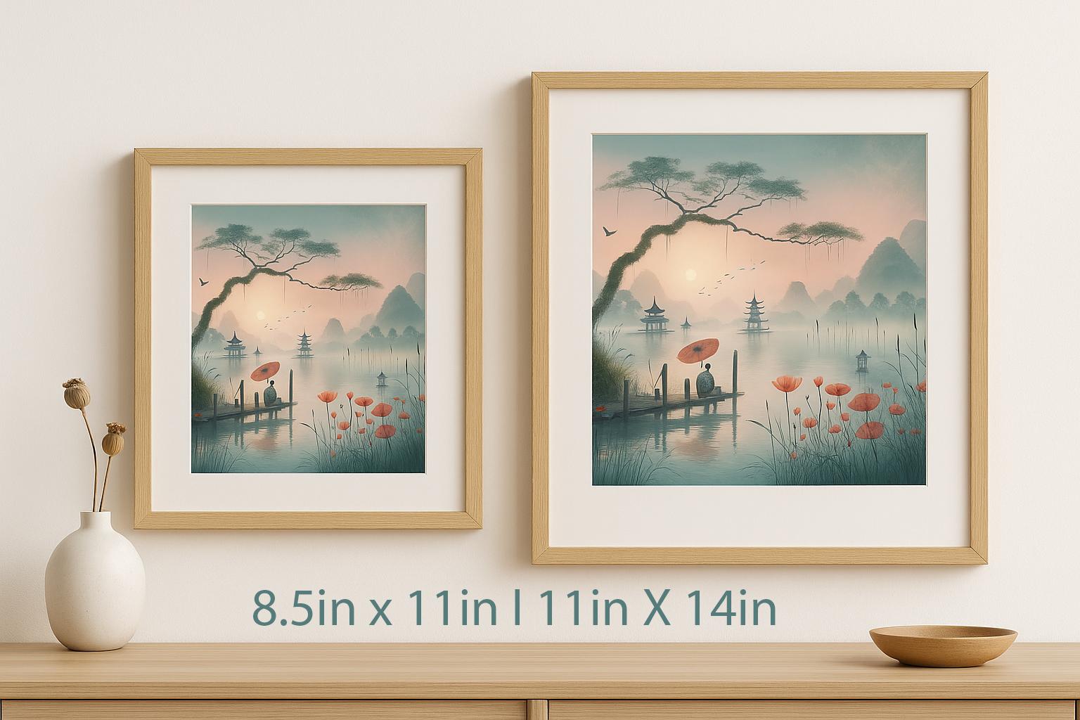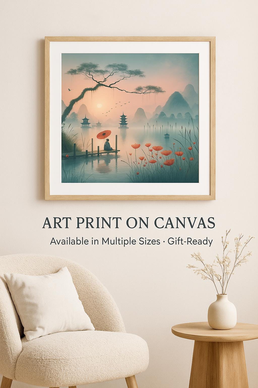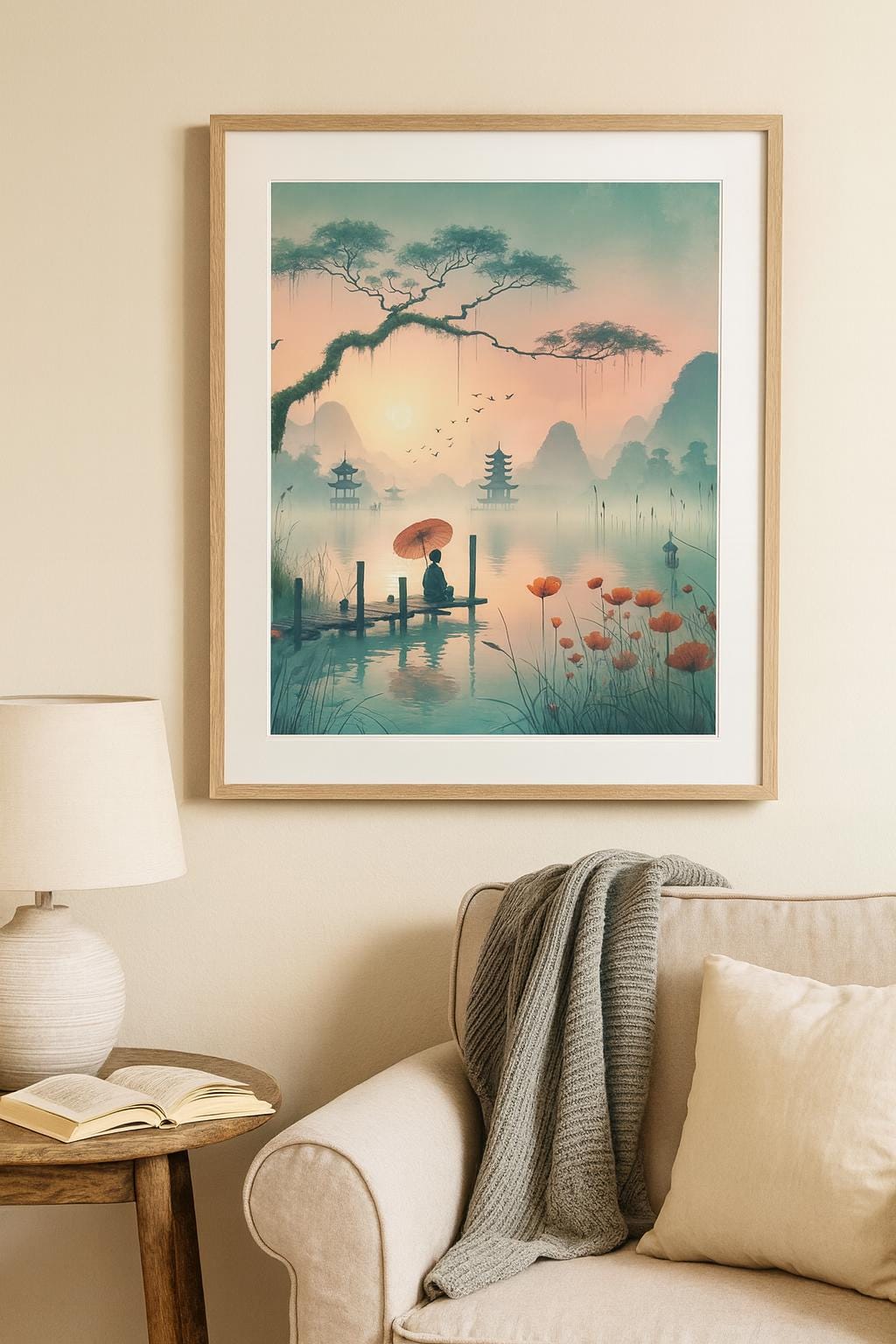 Bring tranquility and quiet beauty into your home with this serene East Asian–inspired landscape art print. A lone figure rests on a wooden pier beneath a parasol, watching dawn rise across the still water and distant pagodas. The mist, soft morning light, and peaceful composition make this a calming piece for any space that invites reflection or stillness.