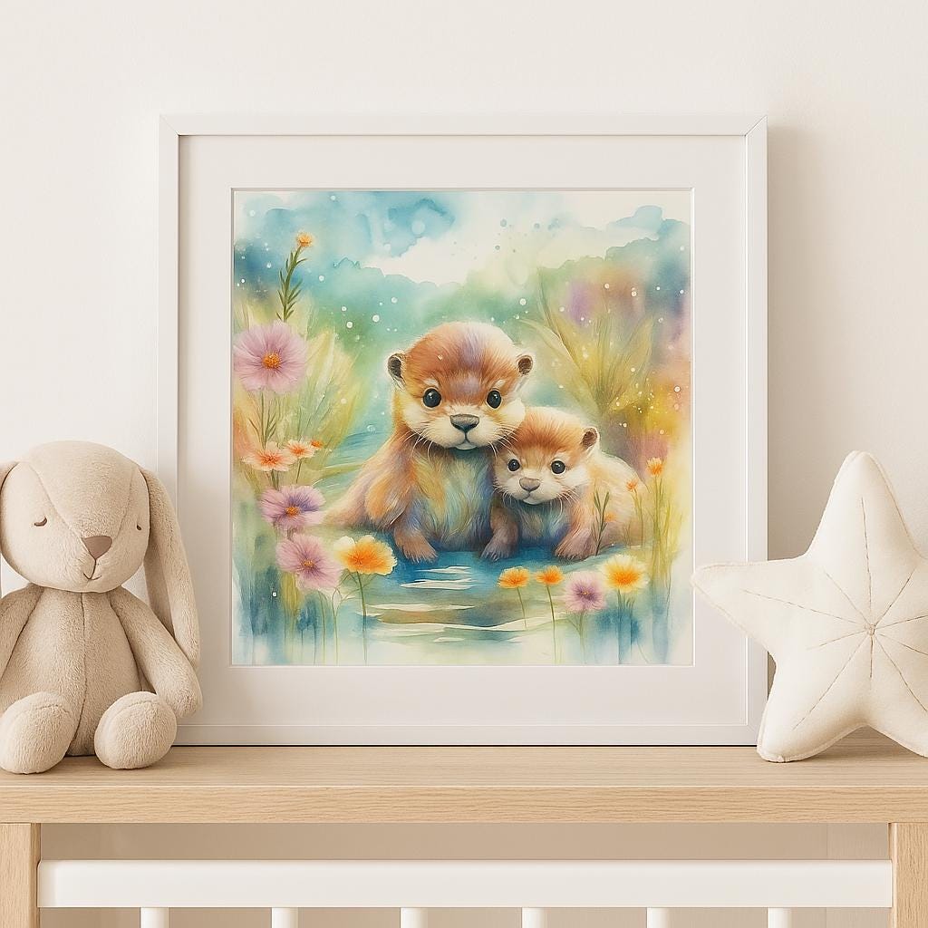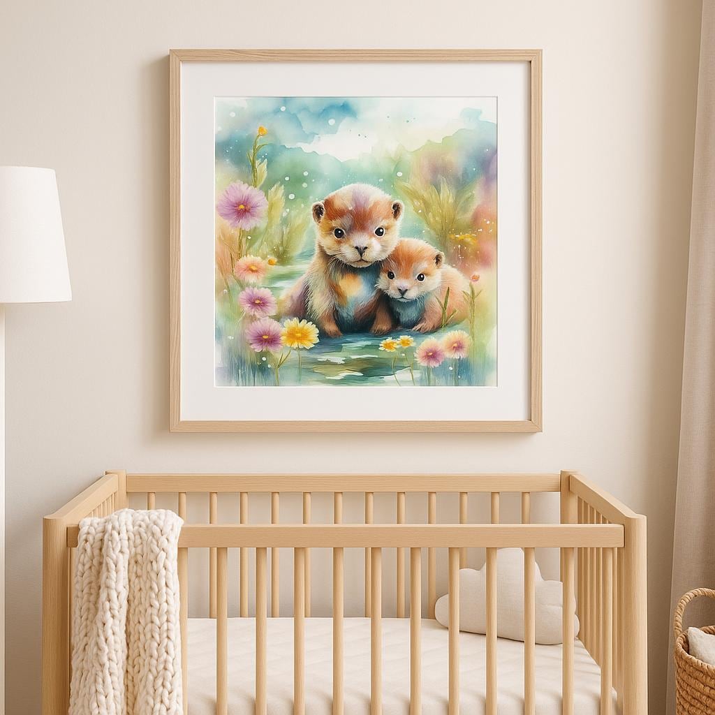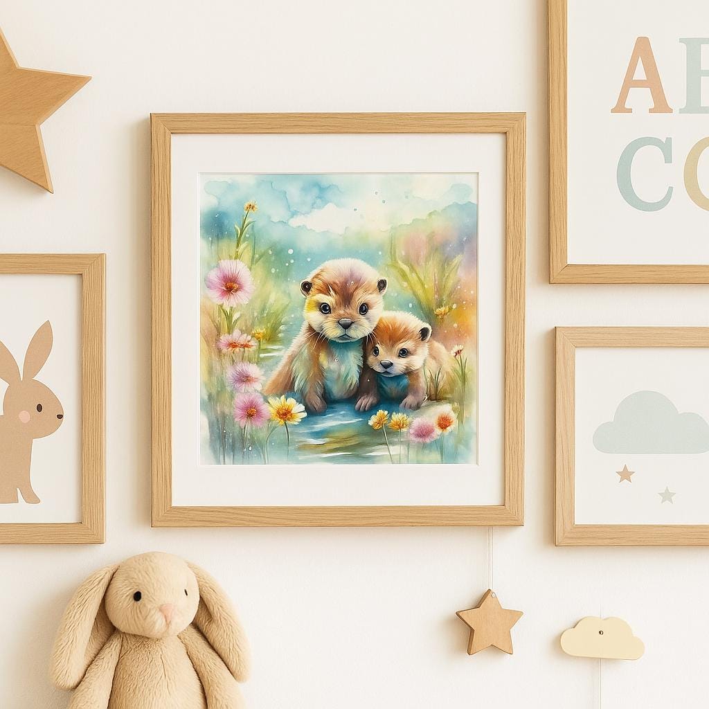 This sweet watercolor-style illustration features two adorable otters nestled together by a sparkling stream, surrounded by soft wildflowers and gentle pastel greenery. Their curious eyes and gentle expressions capture a feeling of love, comfort, and togetherness — making this piece a heartwarming addition to a nursery, child’s room, playroom, or whimsical nature-themed space.