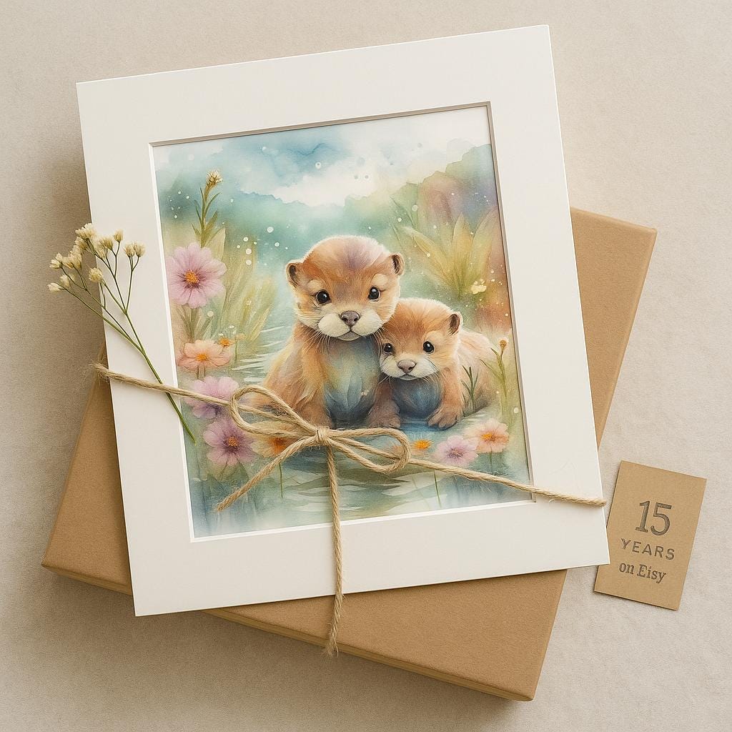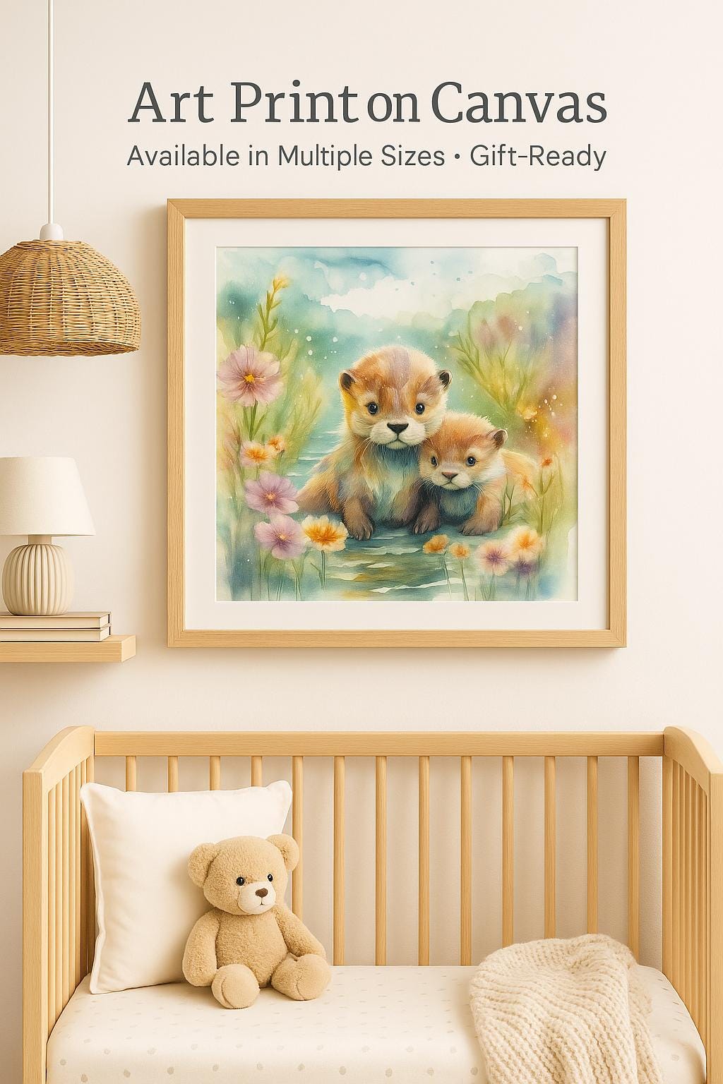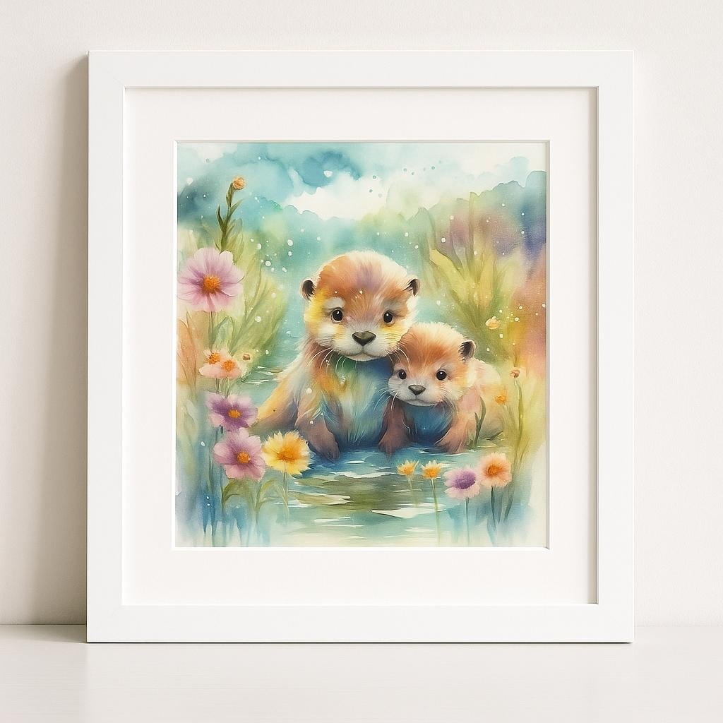This sweet watercolor-style illustration features two adorable otters nestled together by a sparkling stream, surrounded by soft wildflowers and gentle pastel greenery. Their curious eyes and gentle expressions capture a feeling of love, comfort, and togetherness — making this piece a heartwarming addition to a nursery, child’s room, playroom, or whimsical nature-themed space.