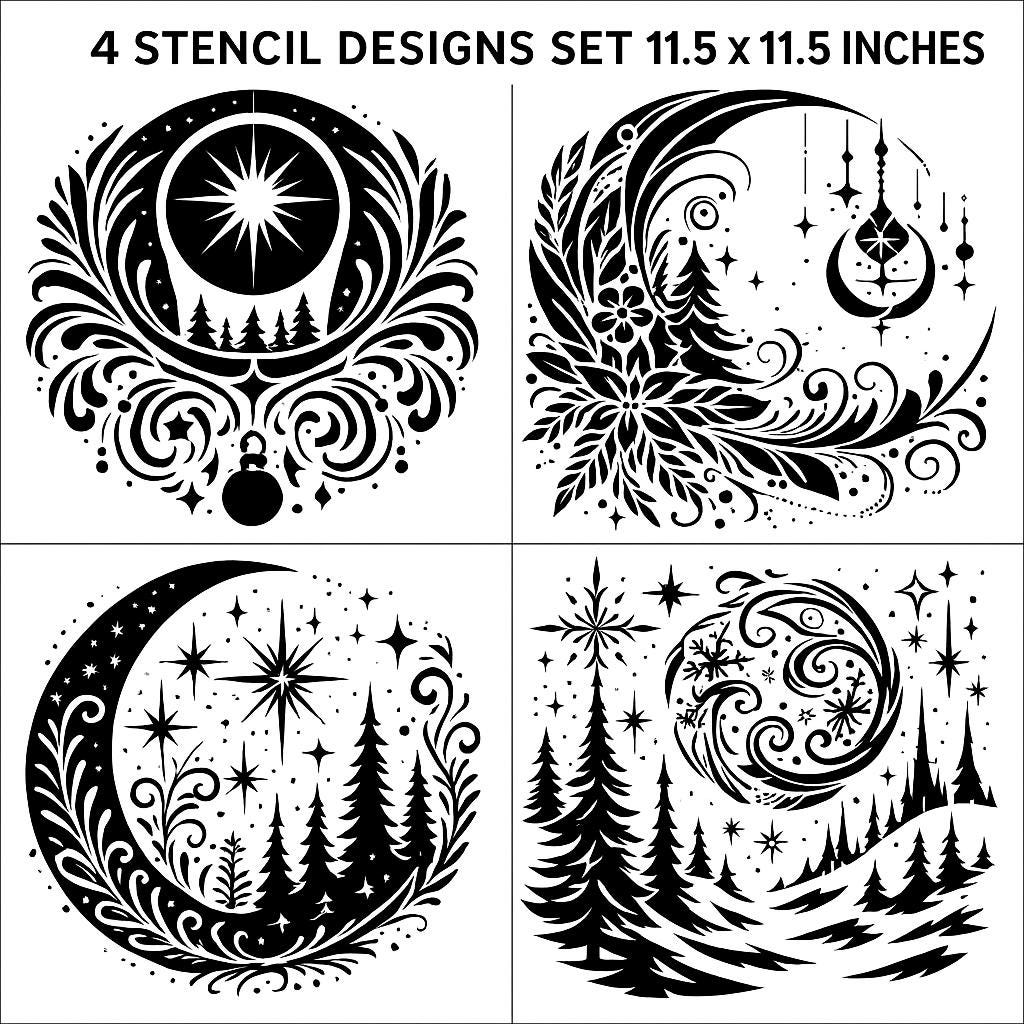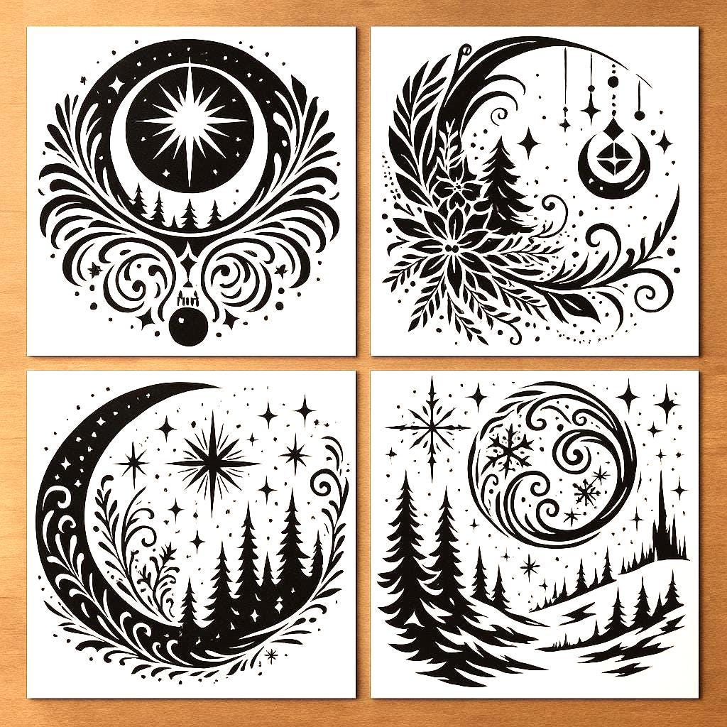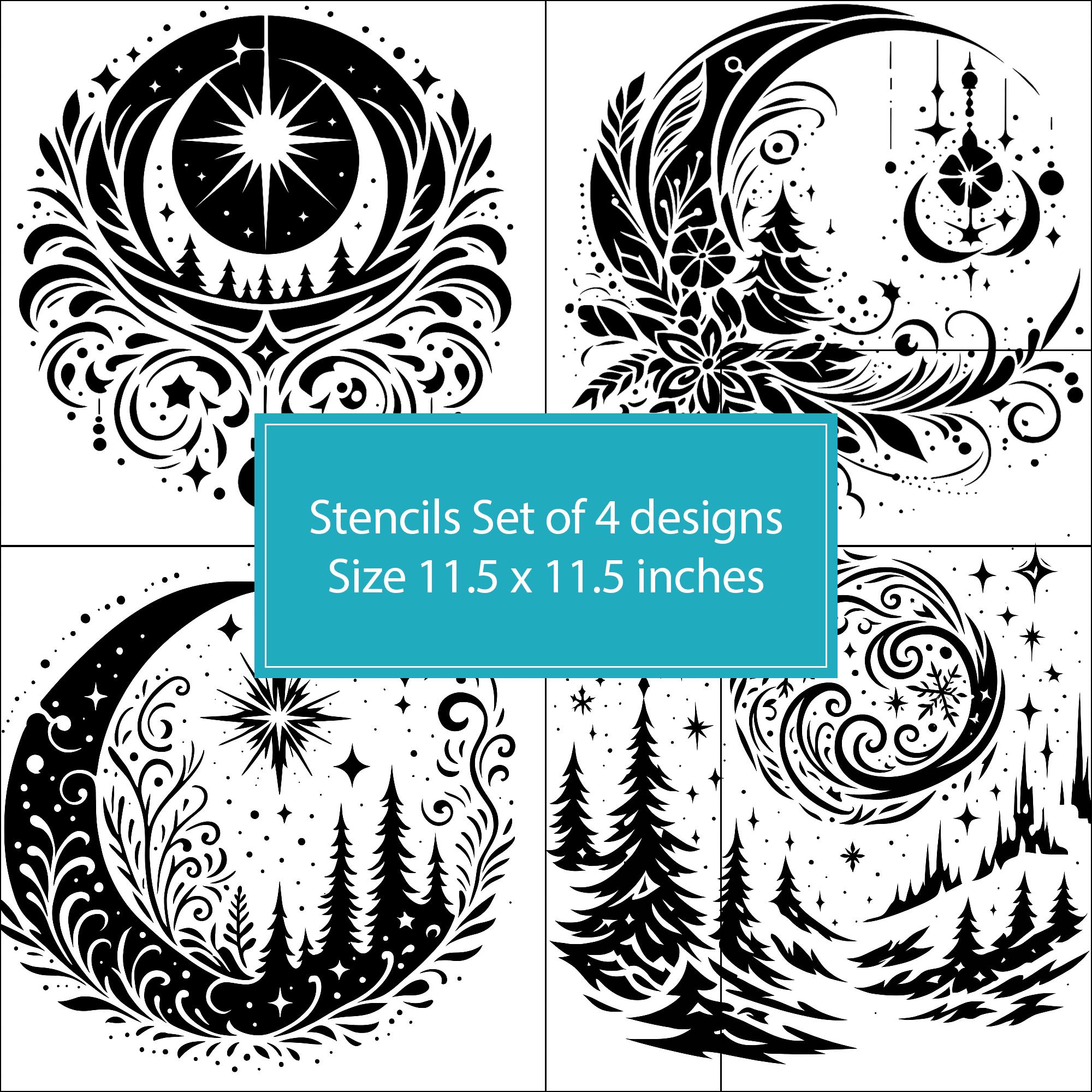 Transform your winter projects into works of art with this 4-piece Winter Celestial Stencil Set. Each design blends botanical elegance, lunar motifs, and Nordic-inspired geometry, perfect for painting, wall décor, card-making, furniture art, or festive gift wrapping.