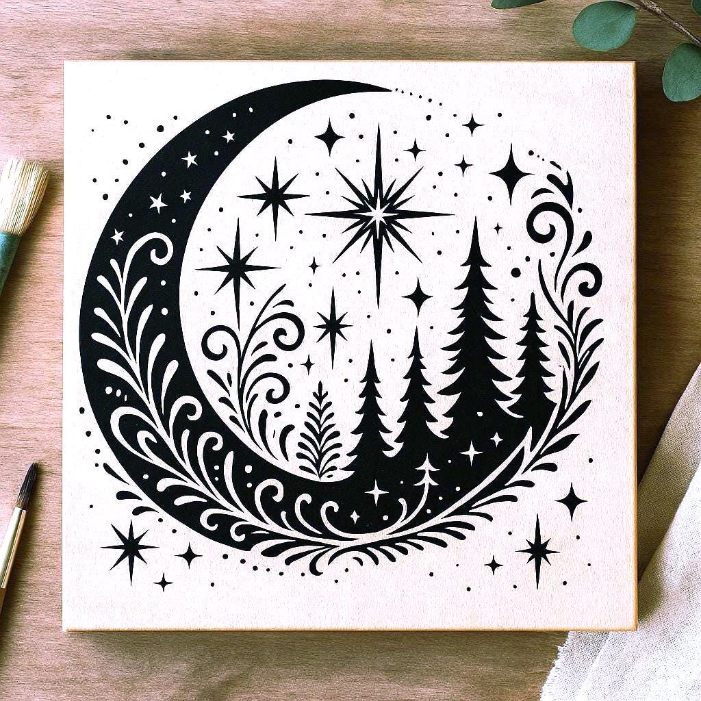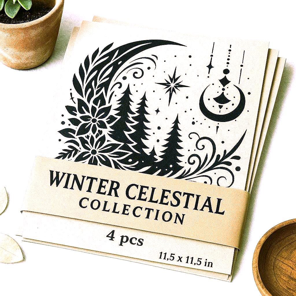 Each stencil captures the calm beauty of winter nights — twinkling stars, snowy pines, and swirling frost patterns — designed to bring a touch of handmade magic to your projects.