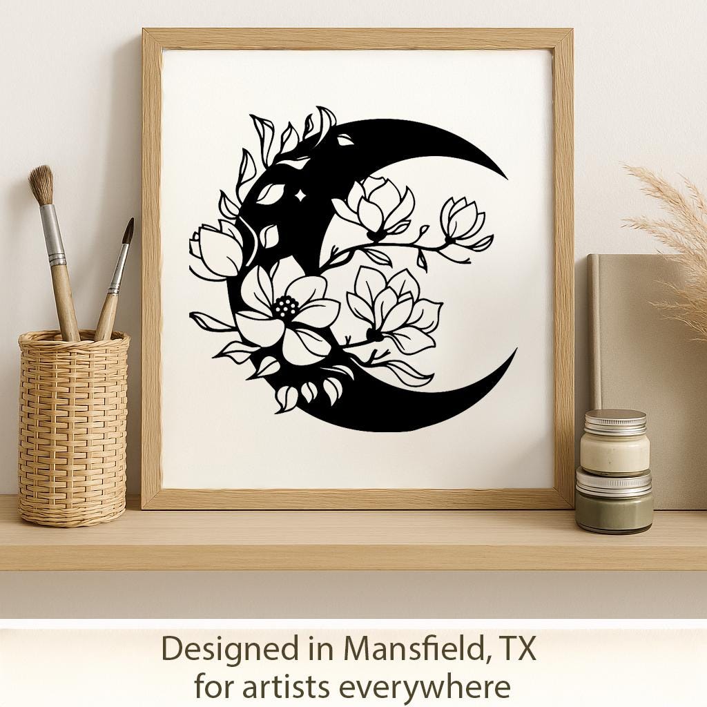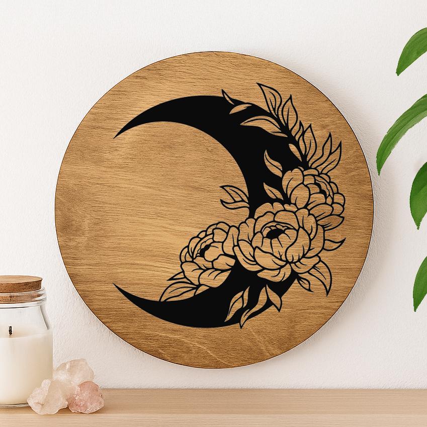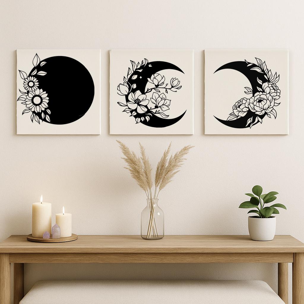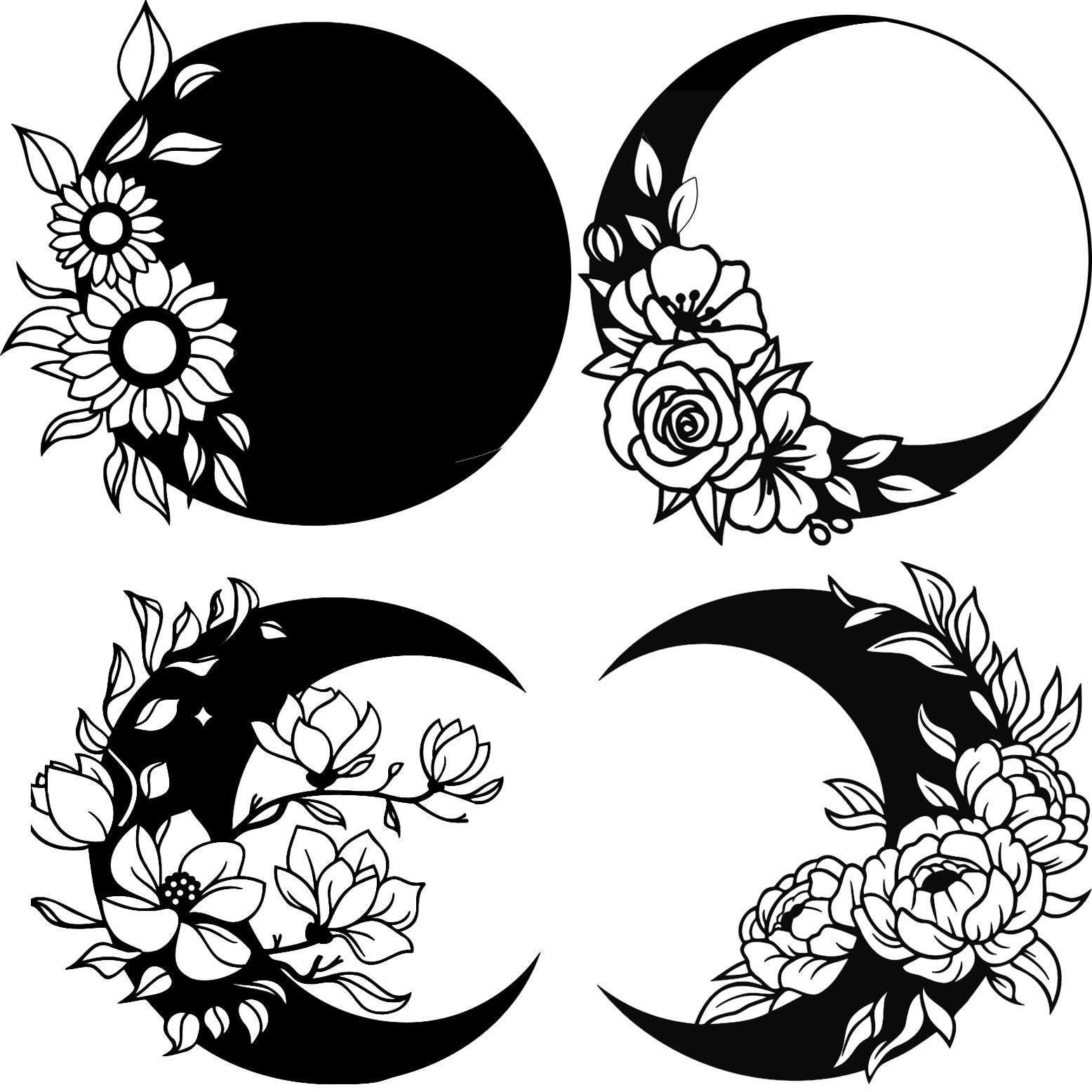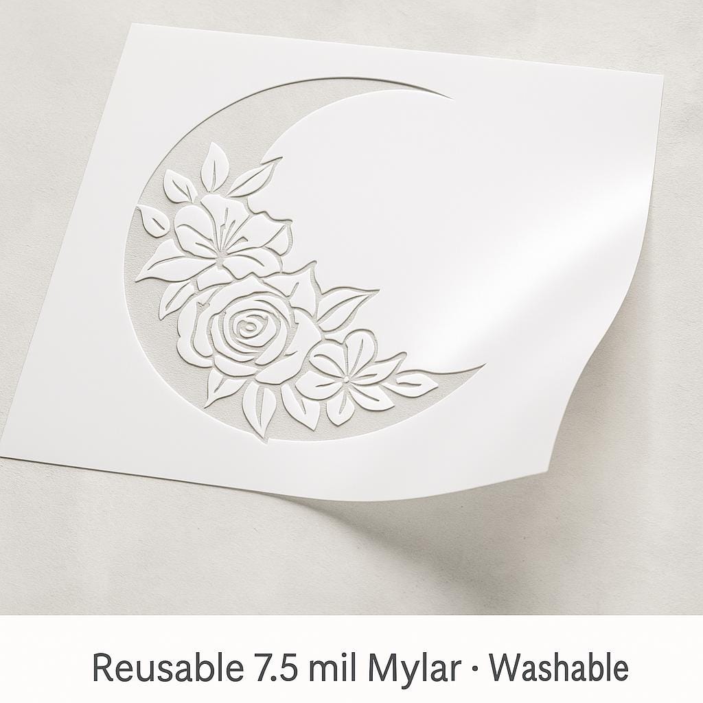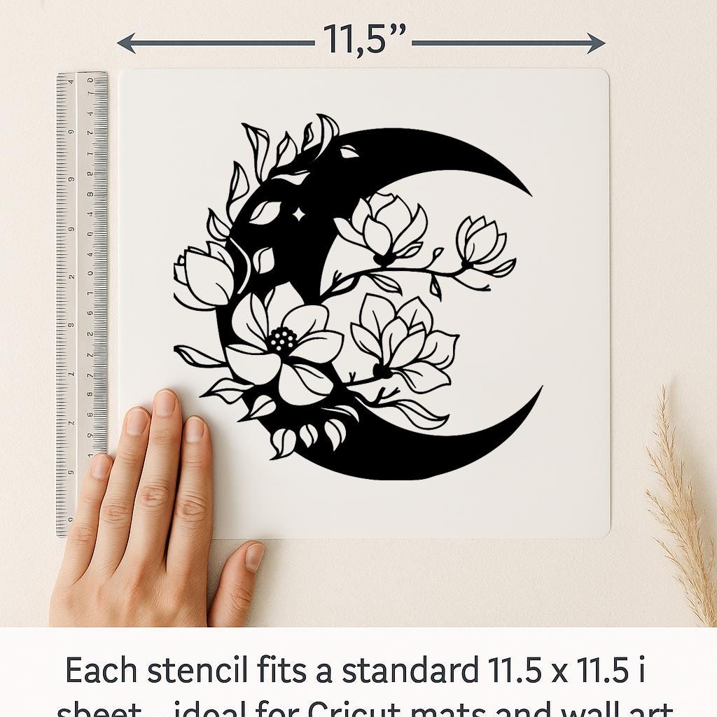 Bring the elegance of the night sky into your creative space with this original floral moon stencil set, featuring four unique moon phases adorned with intricate flowers — sunflowers, roses, magnolias, and peonies.