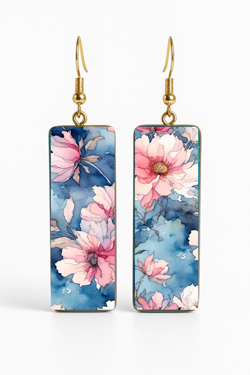 The artwork is protected beneath a glass-like resin dome that enhances the watercolor effect of the pink blossoms and rich blue background. Lightweight and comfortable, these earrings are perfect for everyday wear or as a standout accessory for special occasions.