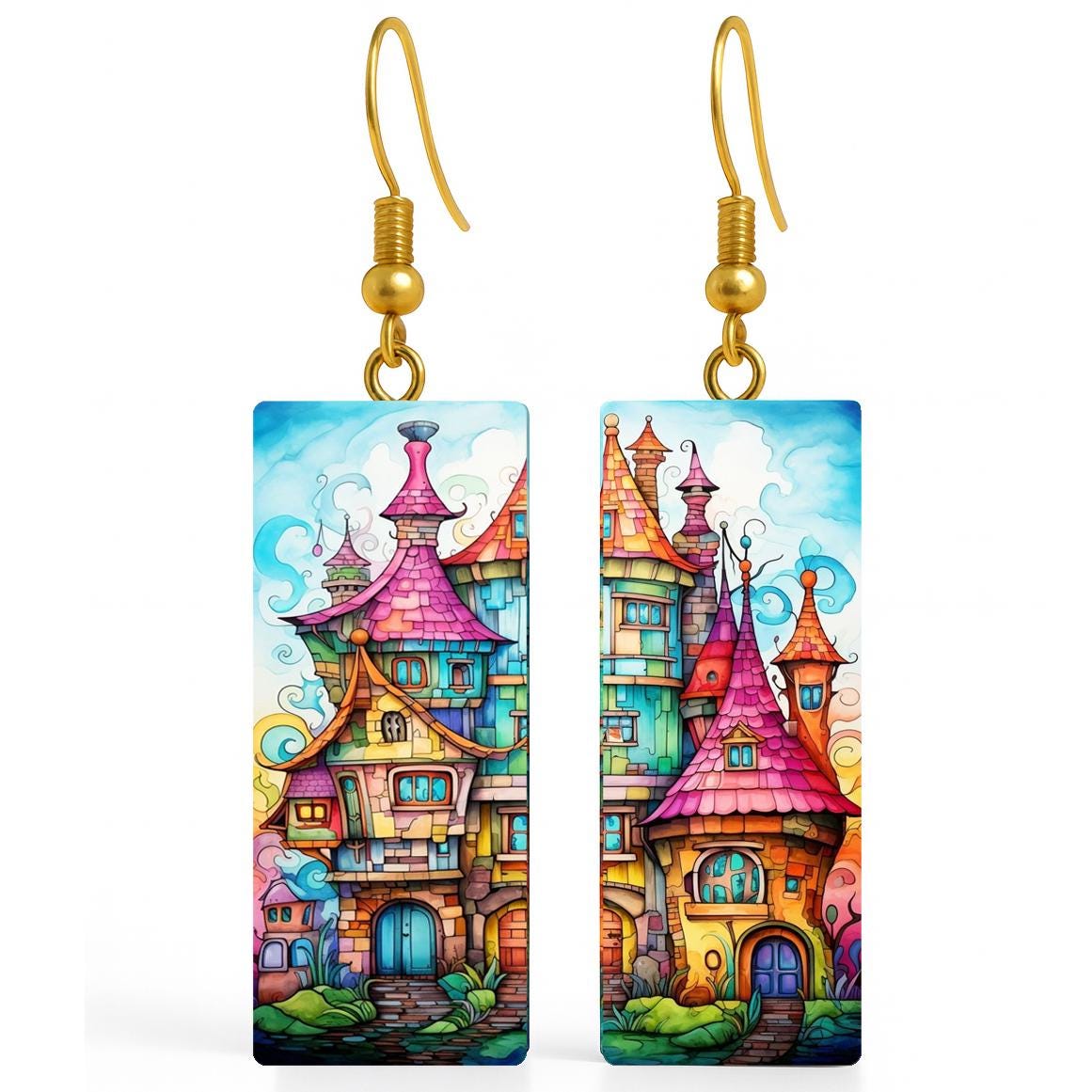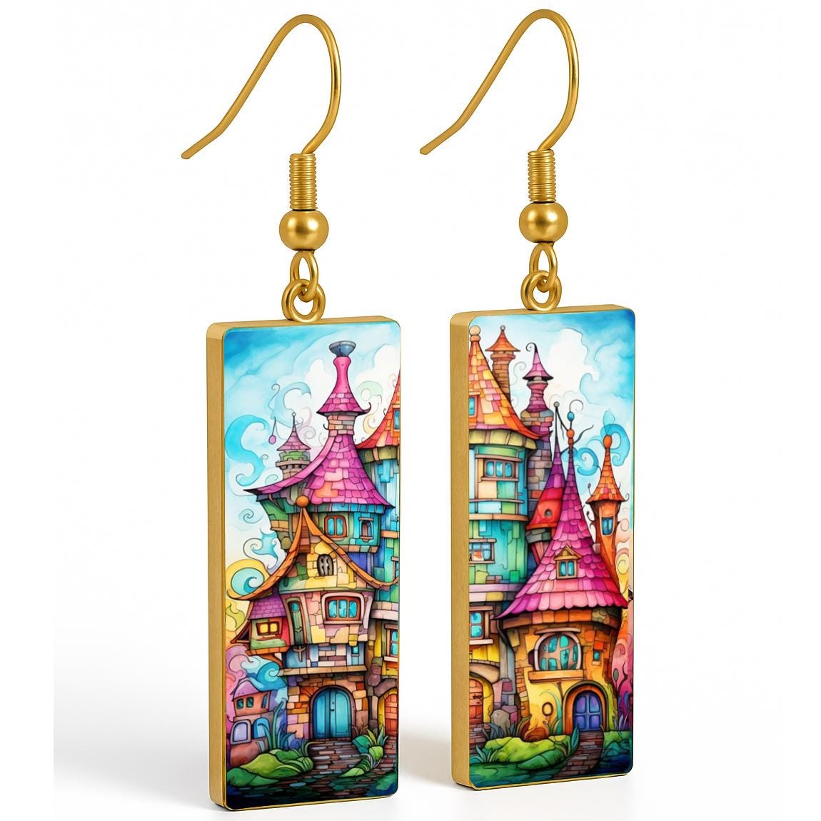 These whimsical earrings are handcrafted from polymer clay and feature a vibrant, storybook village illustration inspired by fairytale architecture and colorful dreamscapes. Each earring showcases a different section of the artwork, creating a harmonious yet unique mirrored pair.