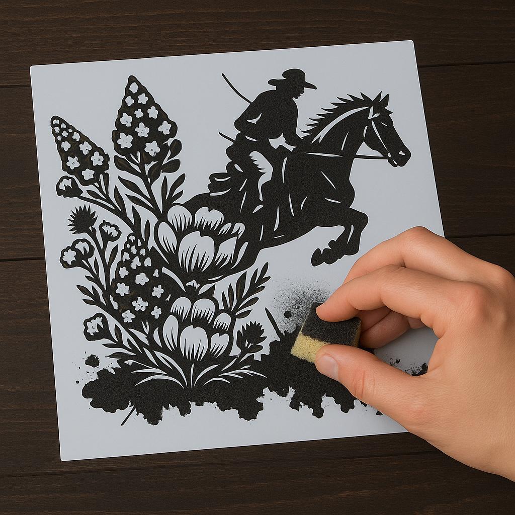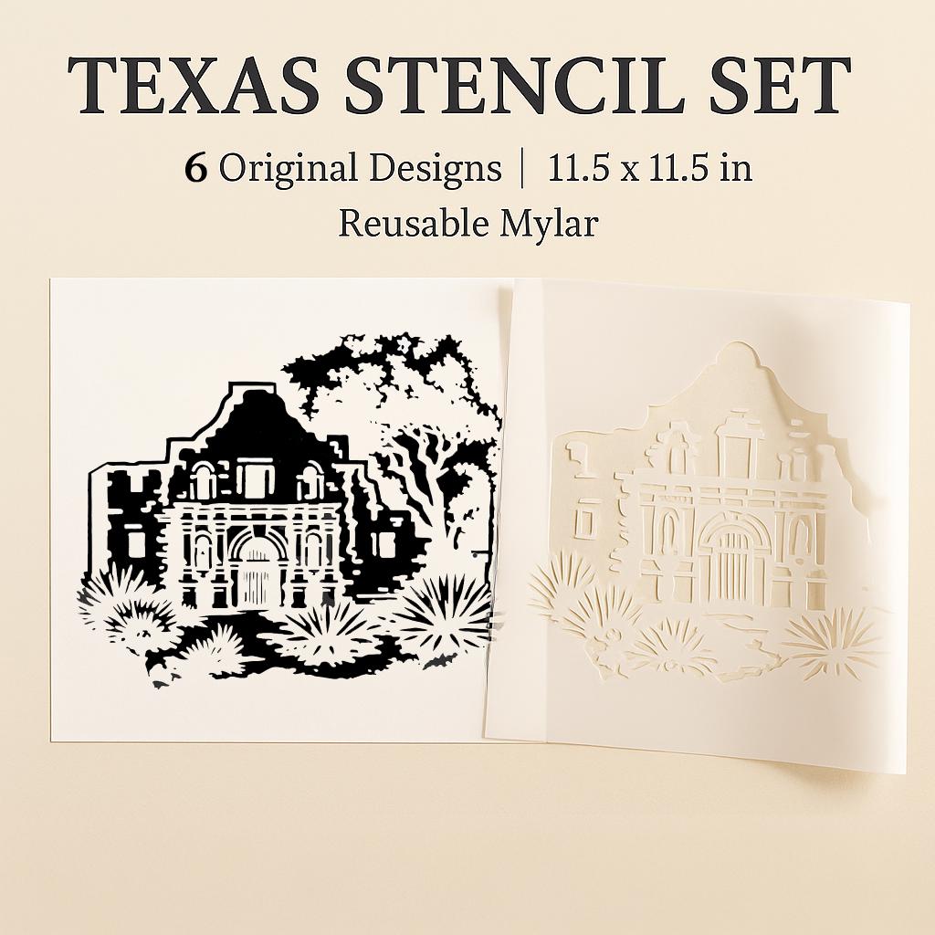 This collection features 7 original Texas-inspired designs, including the Alamo, Longhorn, Bull Rider, Cowboy + Bluebonnets, Texas Star, State Outline + Skyline, Armadillo, and more. Each stencil is 11.5 x 11.5 inches and designed for smooth application with brushes, rollers, or sponges.