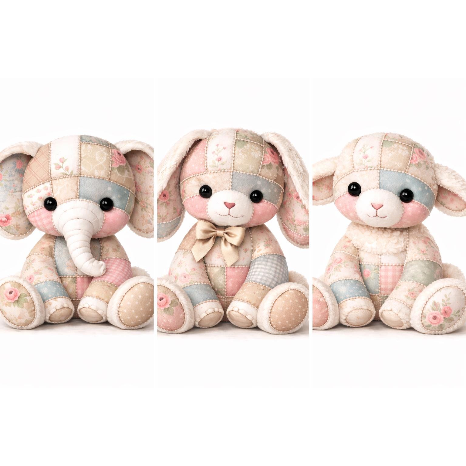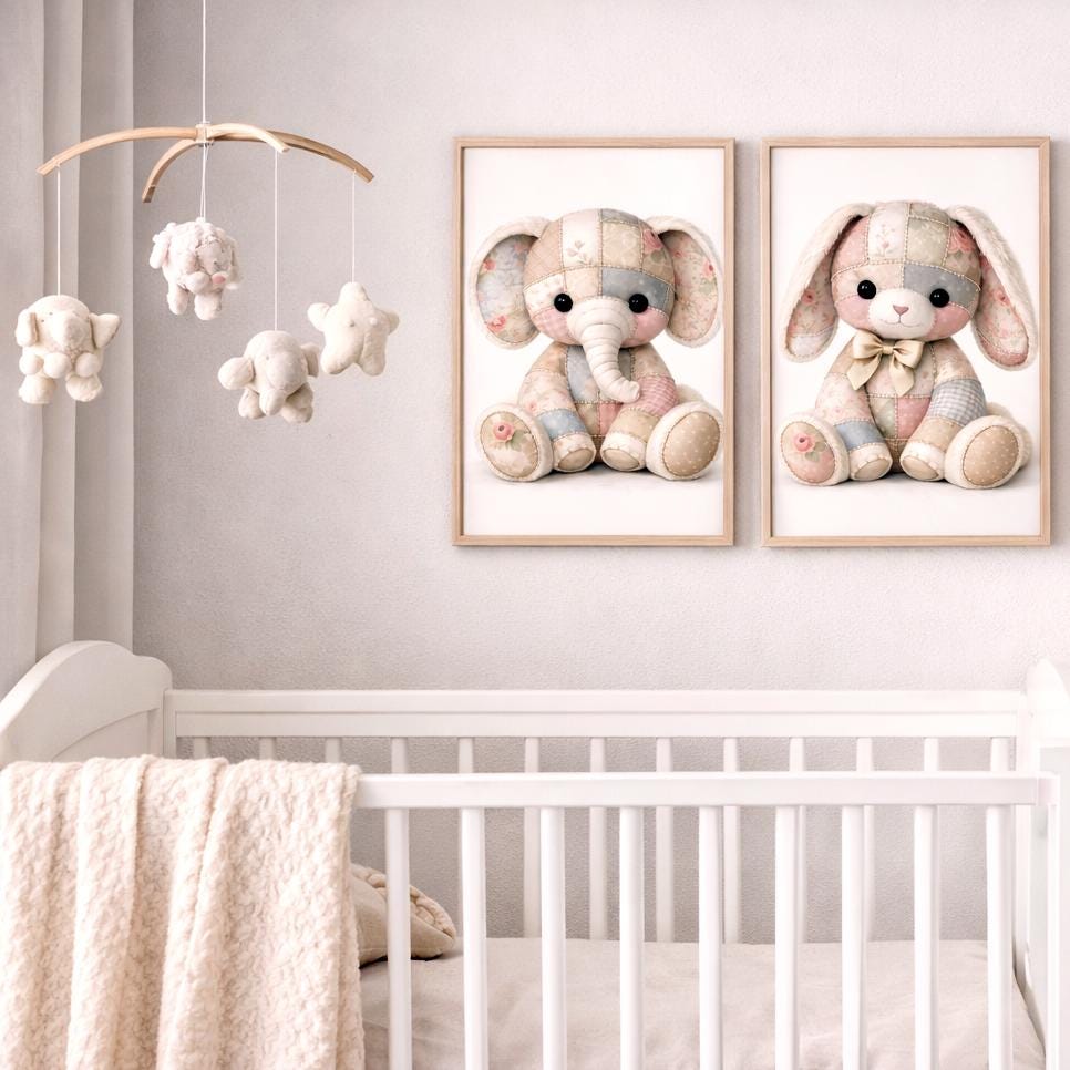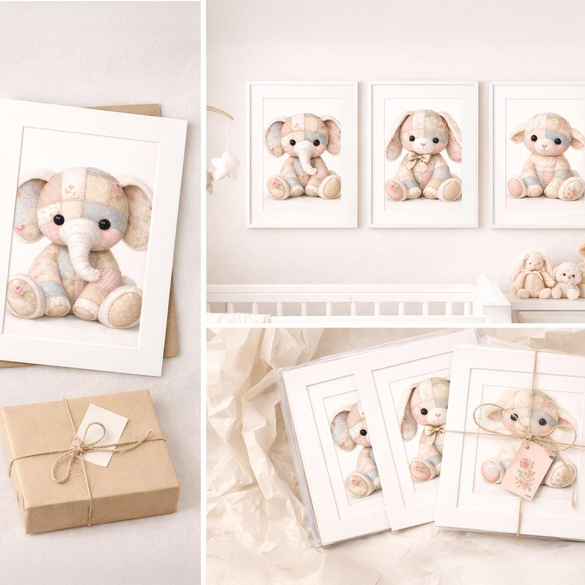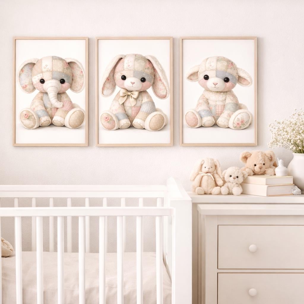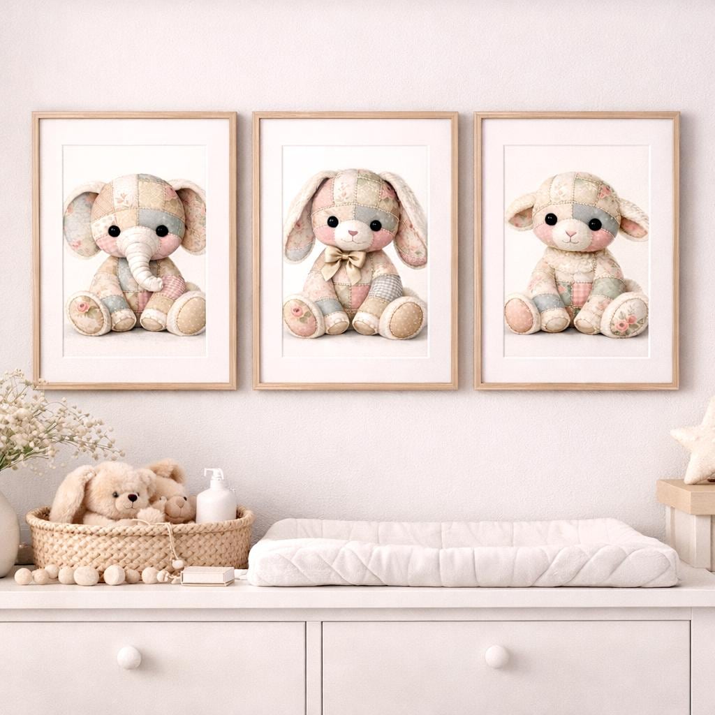 Create a calm, storybook nursery with this coordinated set of three patchwork animal art prints, featuring a sweet elephant, floppy-eared bunny, and gentle lamb. Soft pastel tones, stitched patchwork details, and a timeless heirloom style make this set perfect for nurseries, children’s rooms, and baby shower gifts.