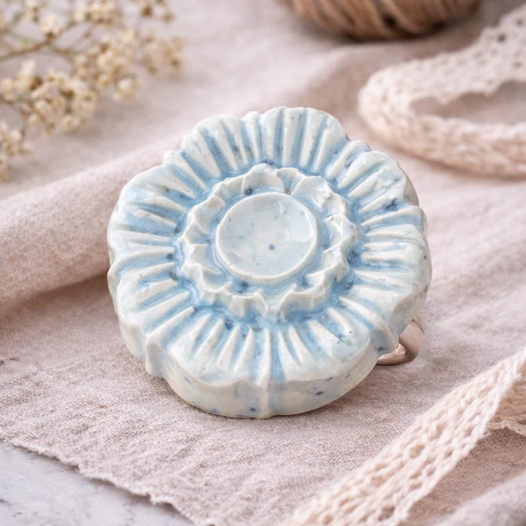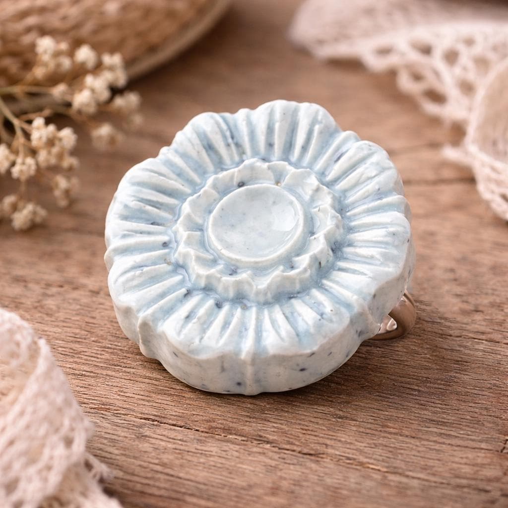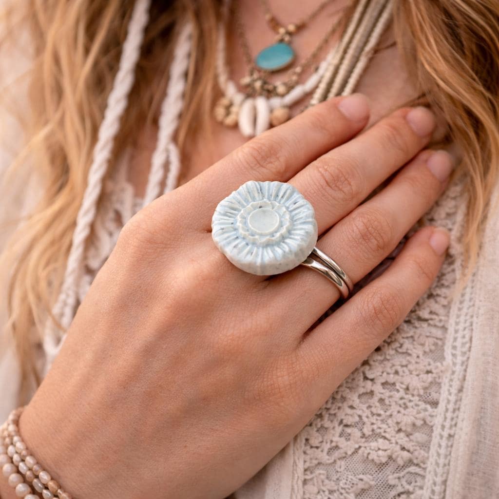 Soft blue ceramic statement rings, hand-glazed and sculpted one by one.