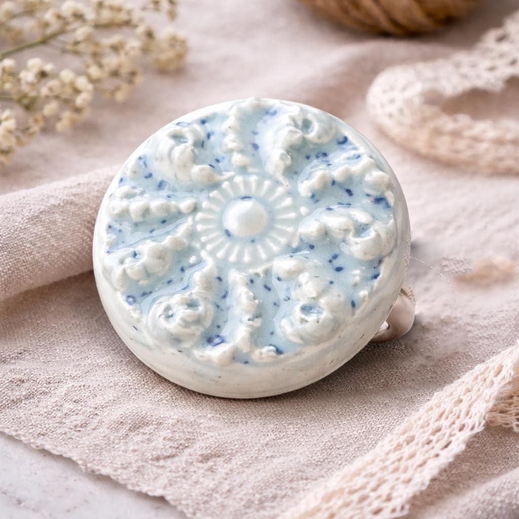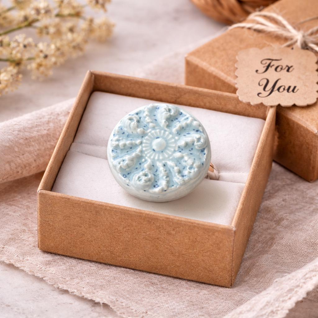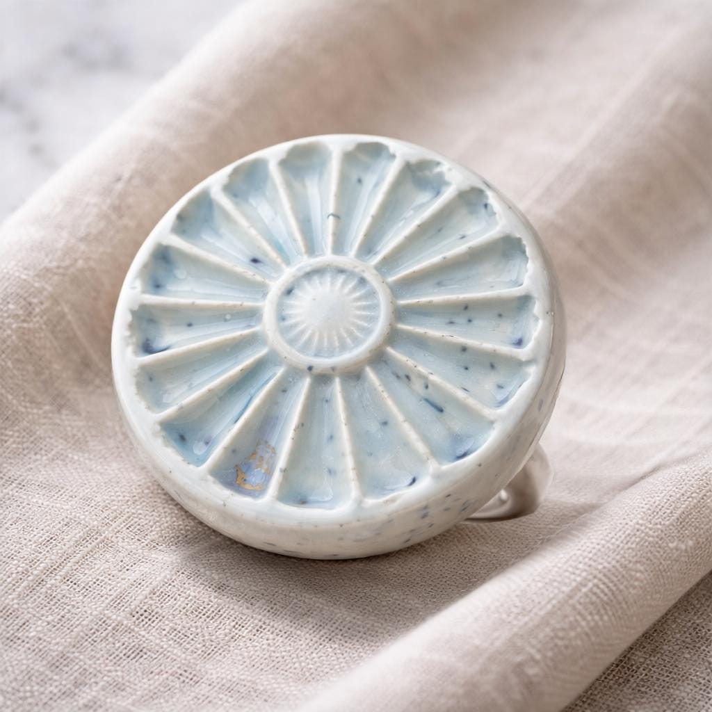 Soft blue ceramic statement rings, hand-glazed and sculpted one by one.