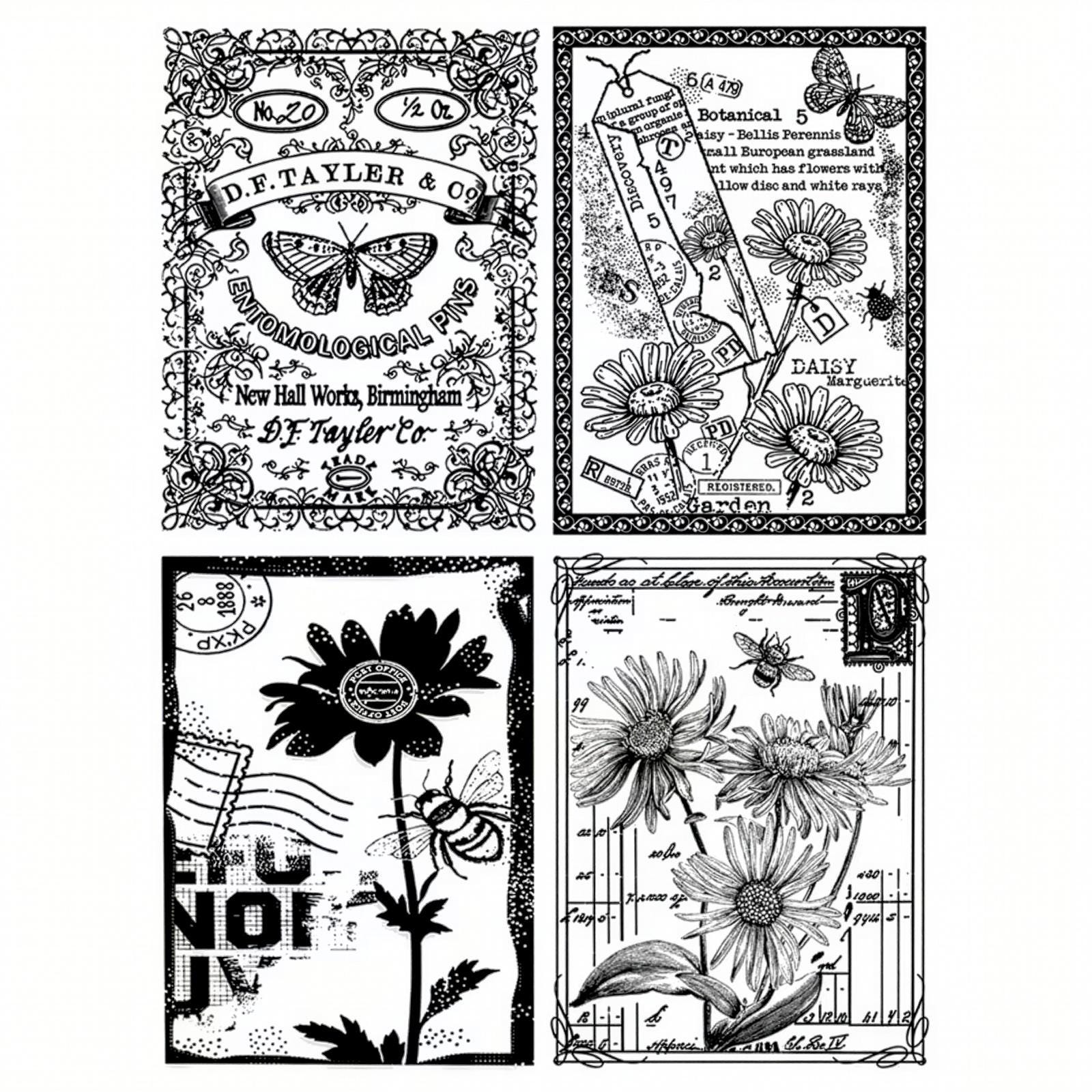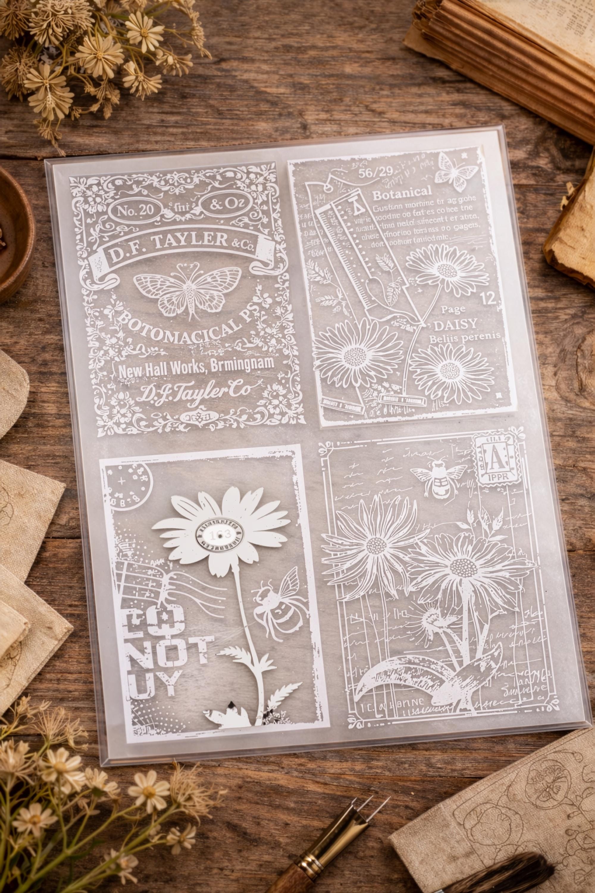 Create beautifully layered artwork with this large-format clear silicone stamp featuring antique botanical illustrations, vintage labels, butterflies, postal marks, and handwritten ephemera. Designed for artists who love old-world charm and expressive texture.