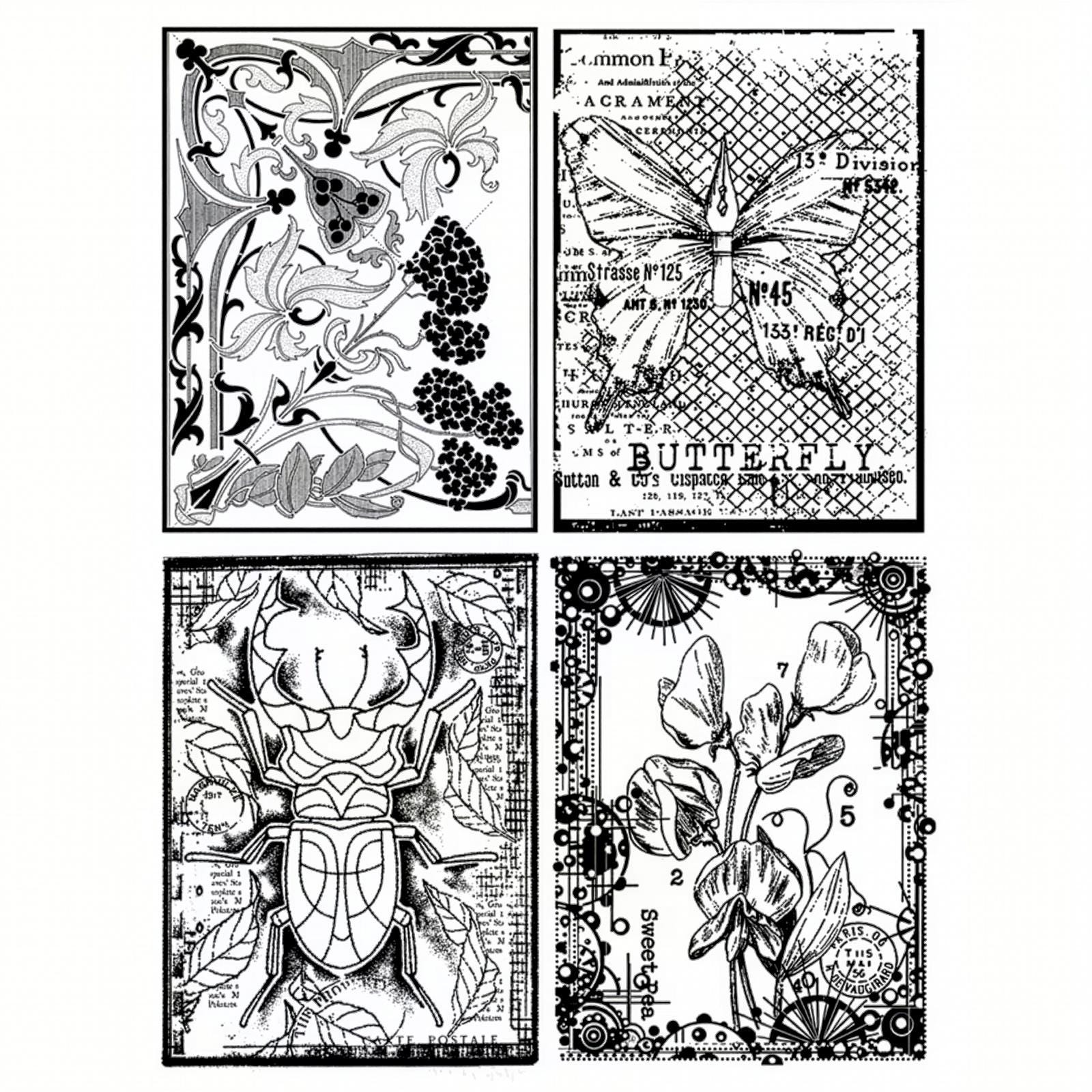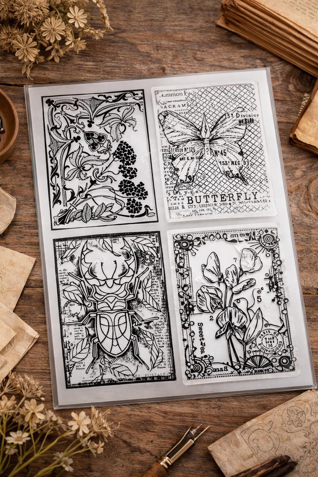 Create beautifully layered artwork with this large-format clear silicone stamp featuring antique botanical illustrations, vintage labels, butterflies, postal marks, and handwritten ephemera. Designed for artists who love old-world charm and expressive texture.