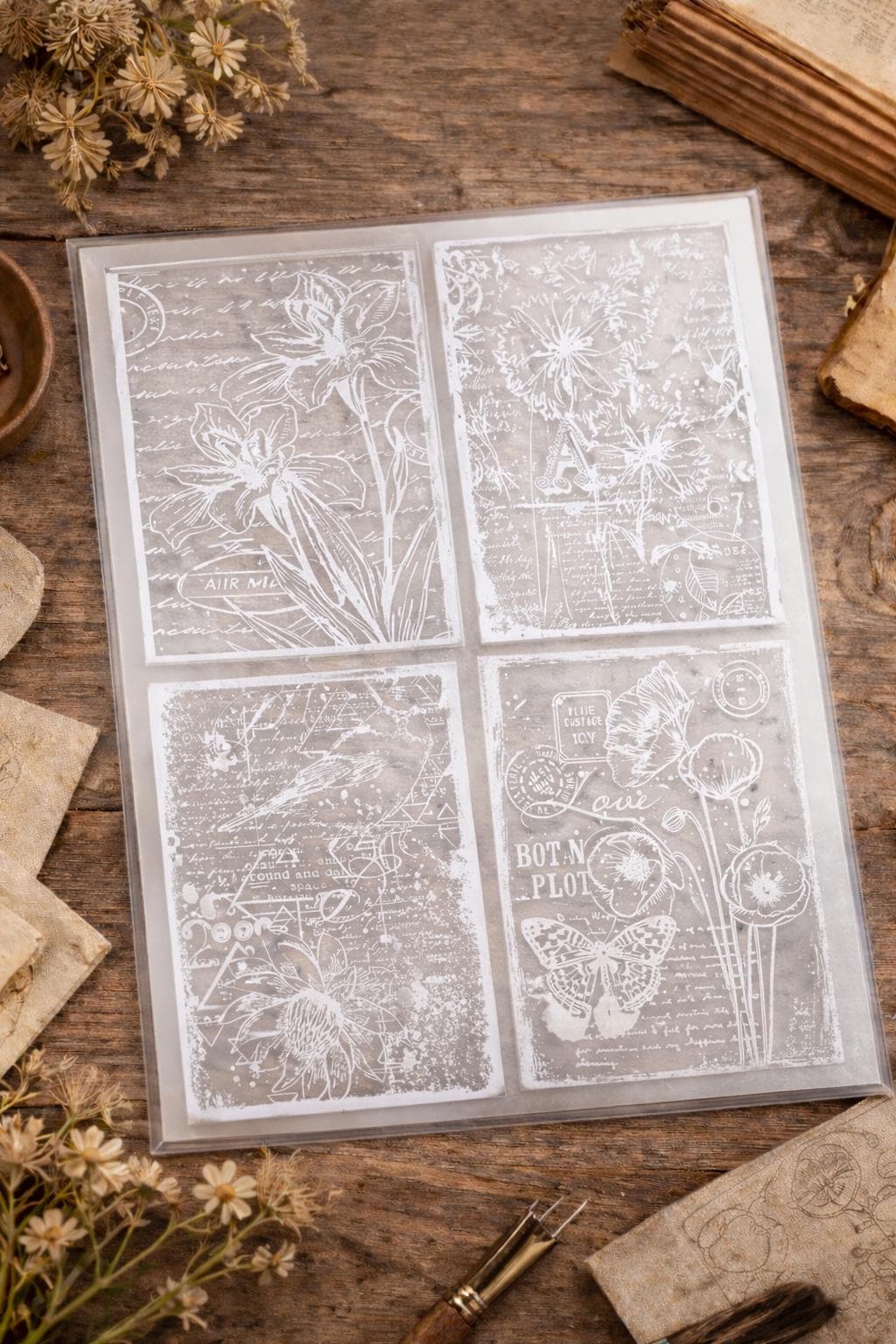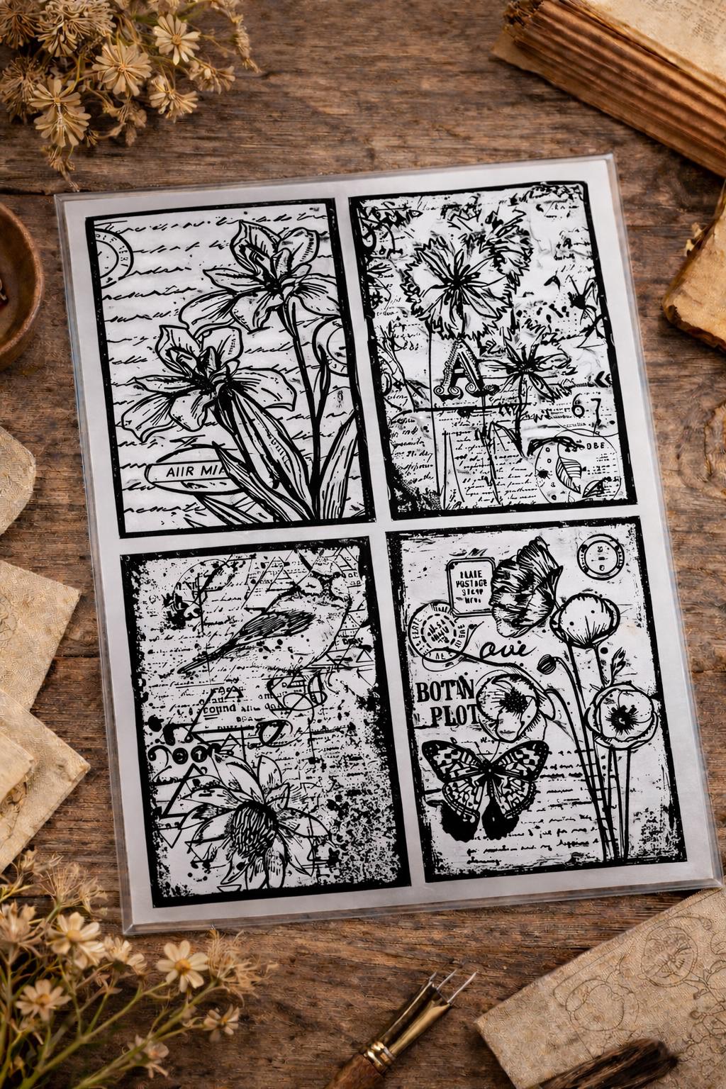 Create beautifully layered artwork with this large-format clear silicone stamp featuring antique botanical illustrations, vintage labels, butterflies, postal marks, and handwritten ephemera. Designed for artists who love old-world charm and expressive texture.