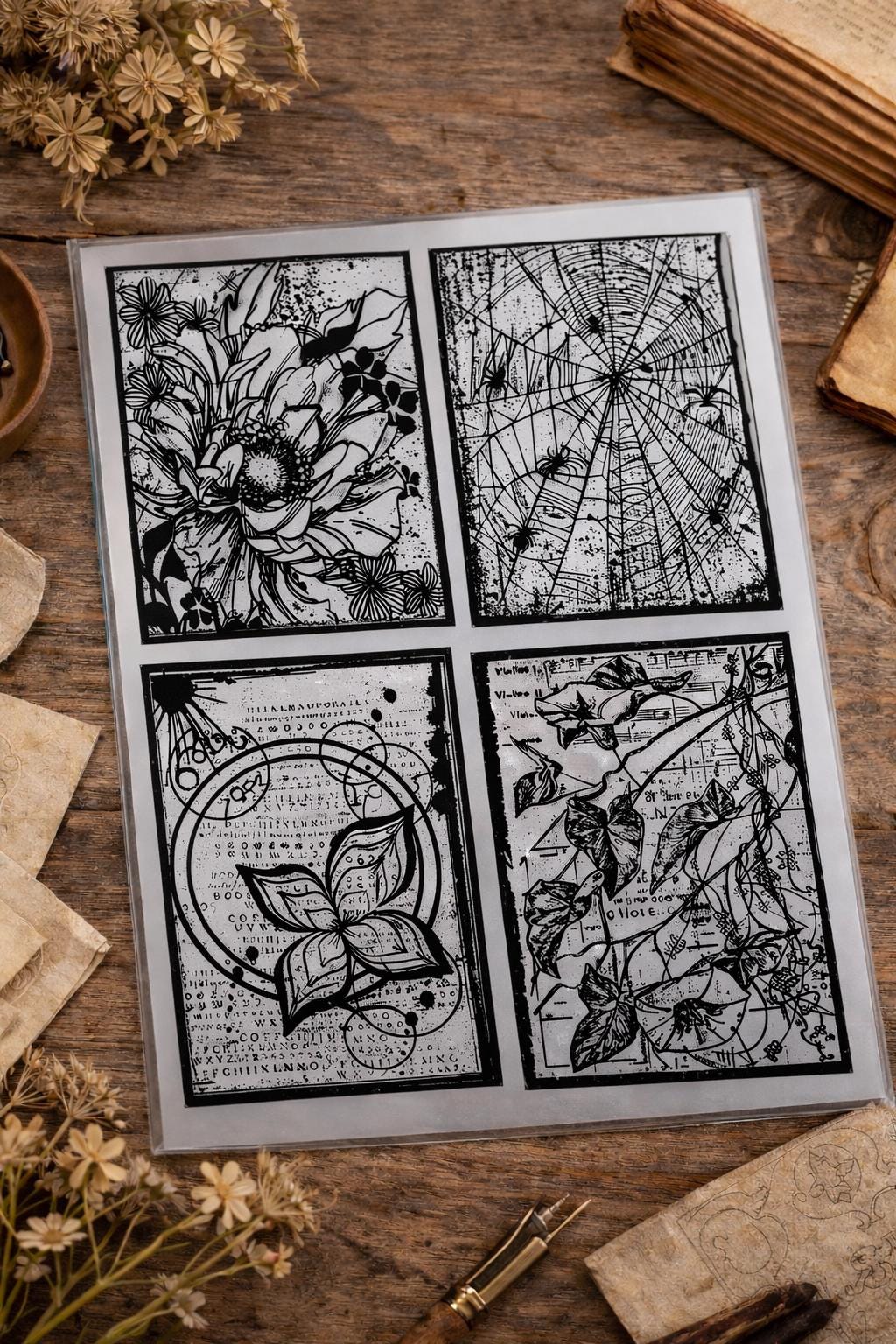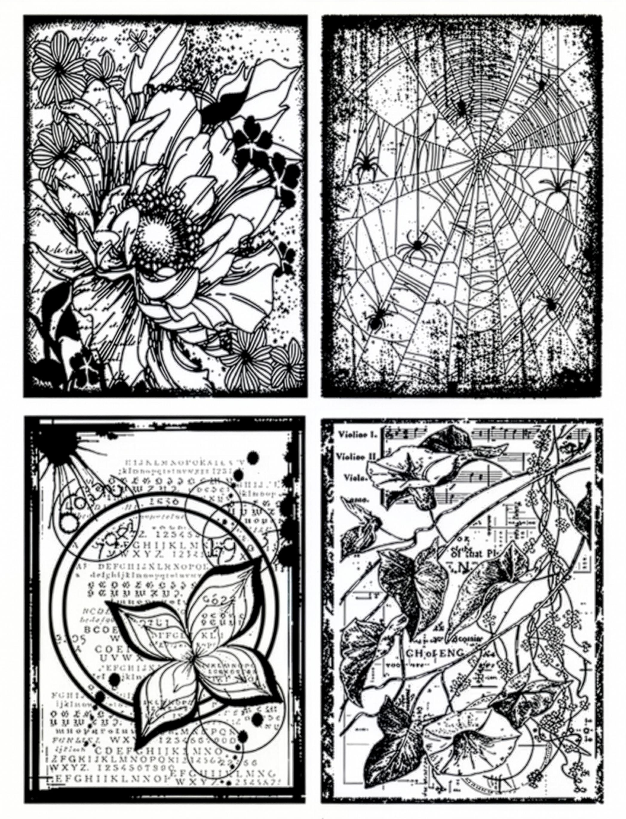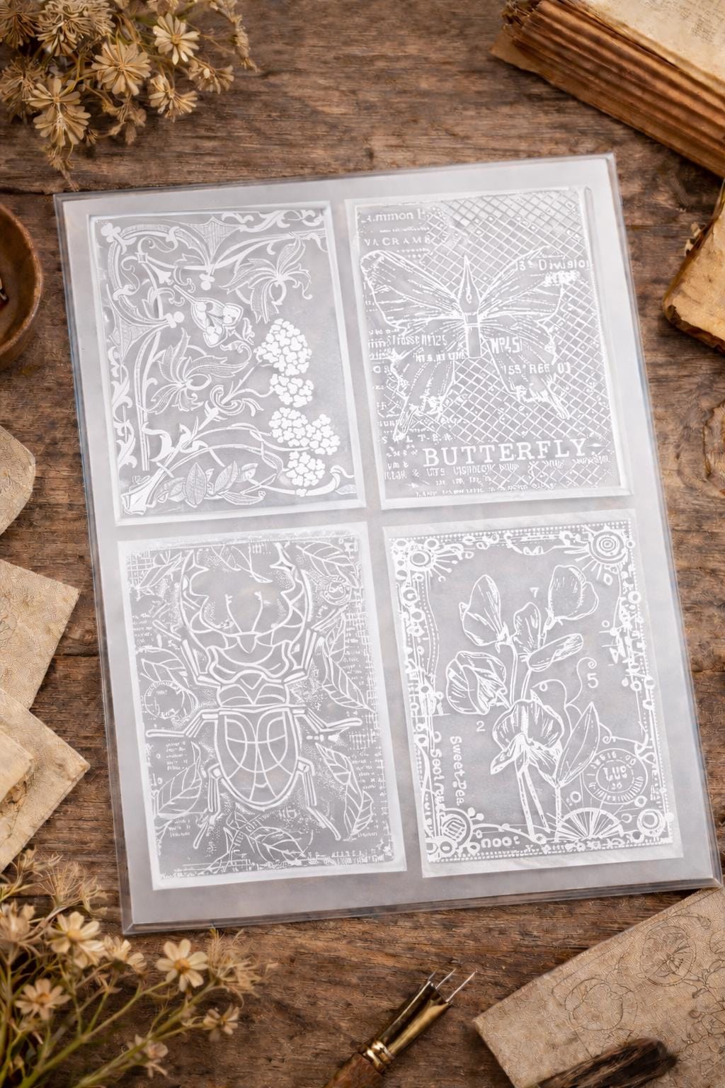 Create beautifully layered artwork with this large-format clear silicone stamp featuring antique botanical illustrations, vintage labels, butterflies, postal marks, and handwritten ephemera. Designed for artists who love old-world charm and expressive texture.