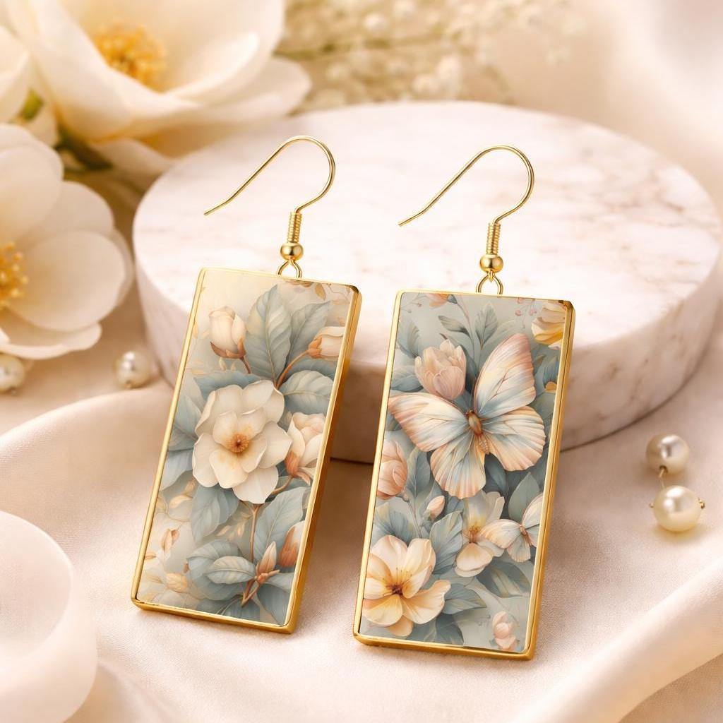 Each earring features a delicate botanical illustration sealed - one earring highlights a blooming magnolia; the other reveals a graceful butterfly among florals — a pairing that feels intentional, romantic, and beautifully balanced rather than identical.