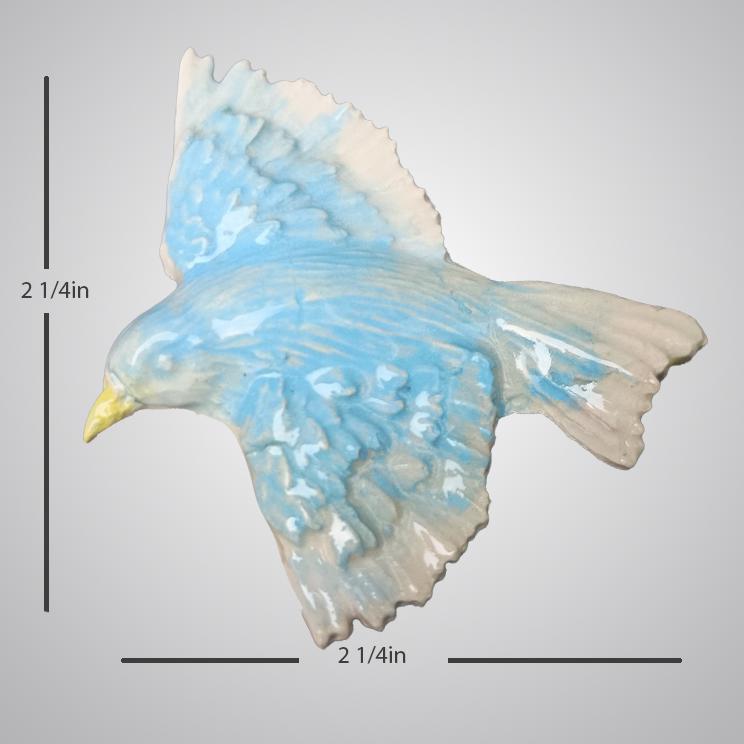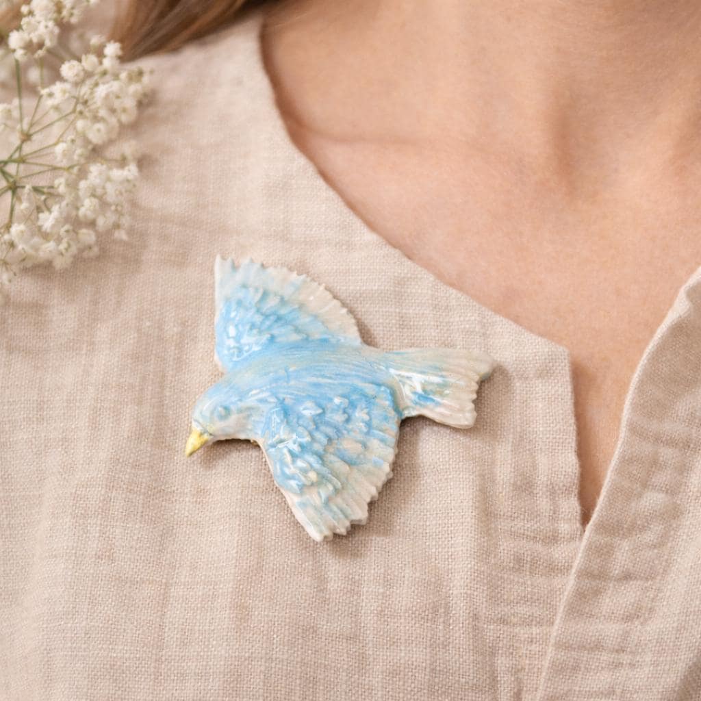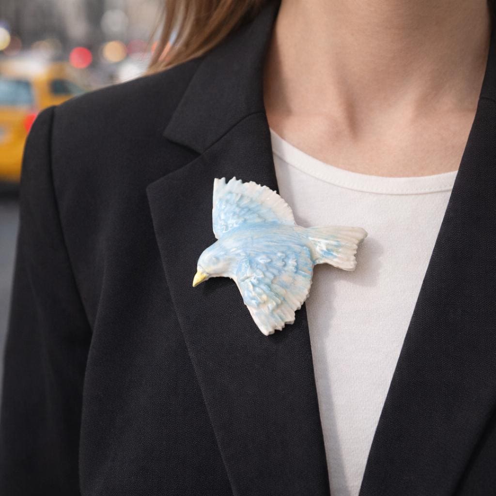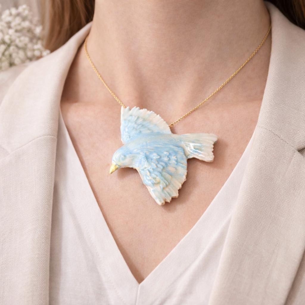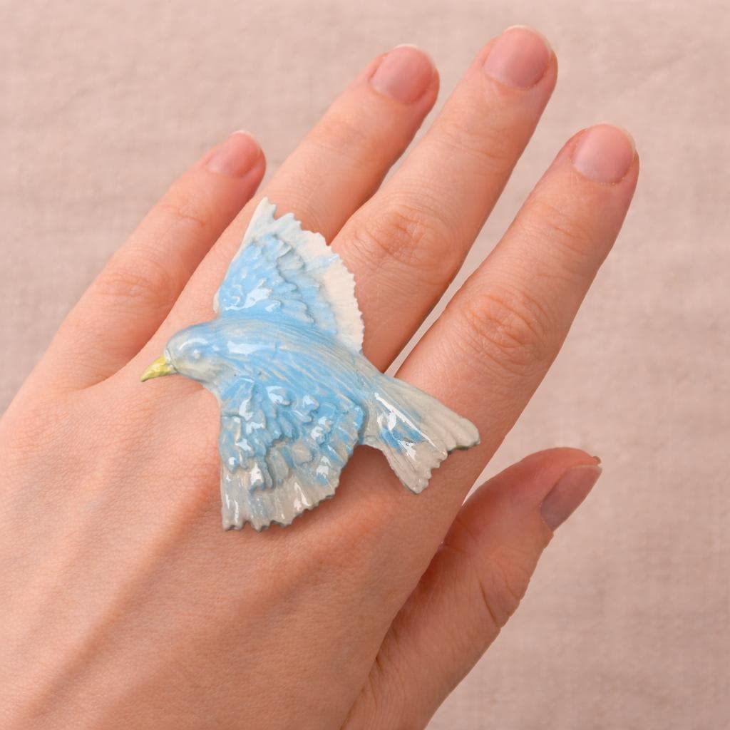 With a wingspan of 2 1/4 inches, the bird makes a striking statement and can be worn as a ring, brooch, or necklace, depending on your preference. The soft blue glaze and feathered detailing give the piece a light, expressive quality—somewhere between jewelry and small wearable sculpture.