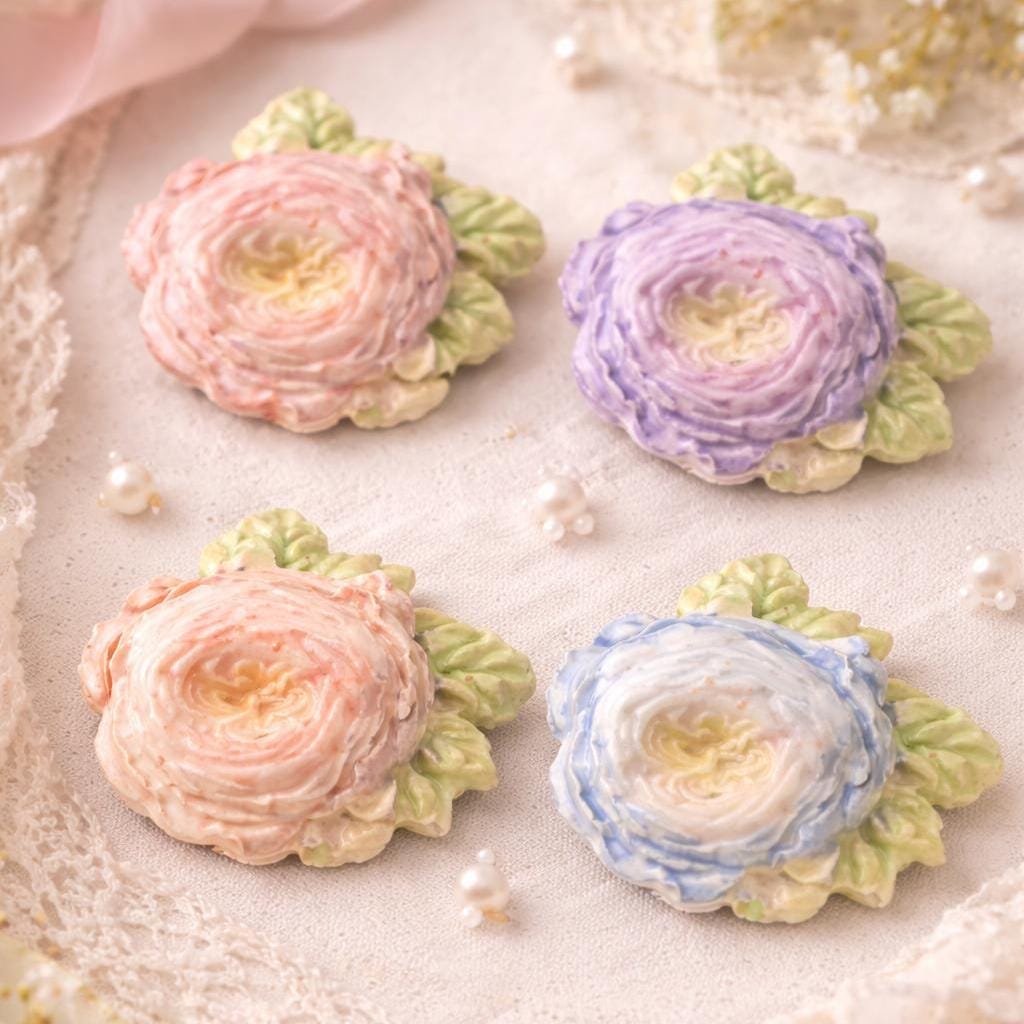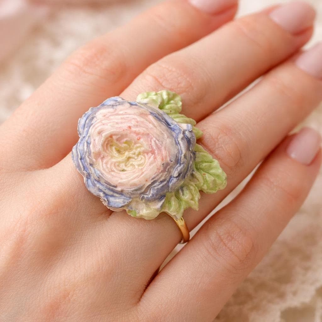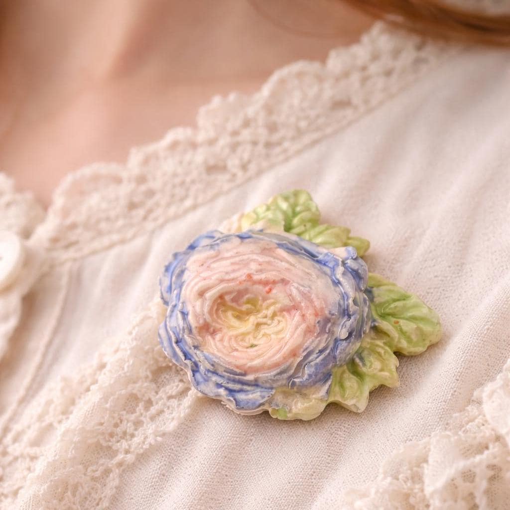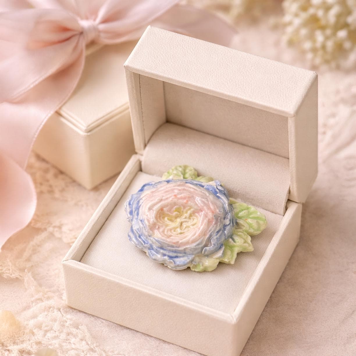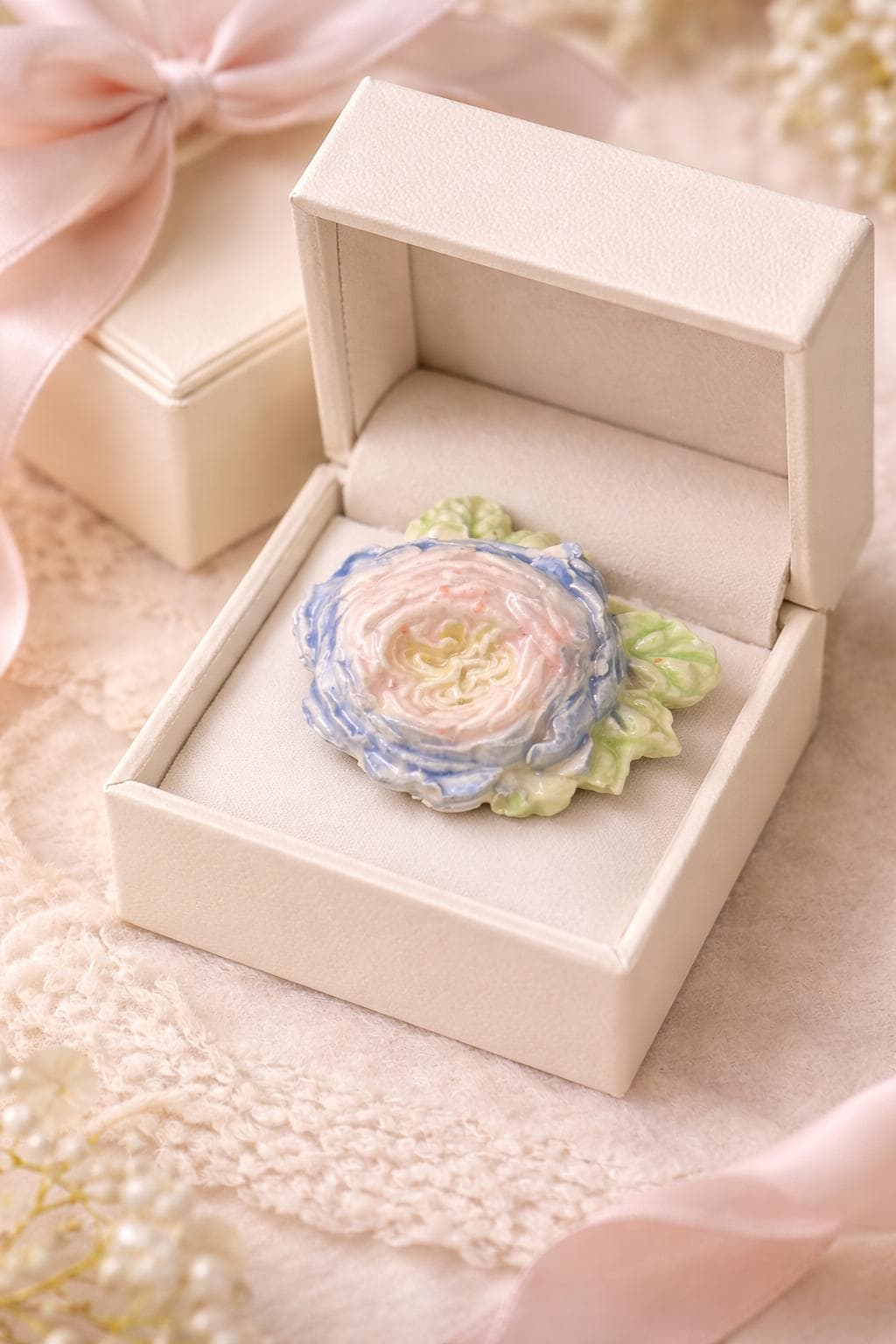 The layered petals form a gentle dome, finished in soft blush, ivory, and blue tones with sculpted green leaves.