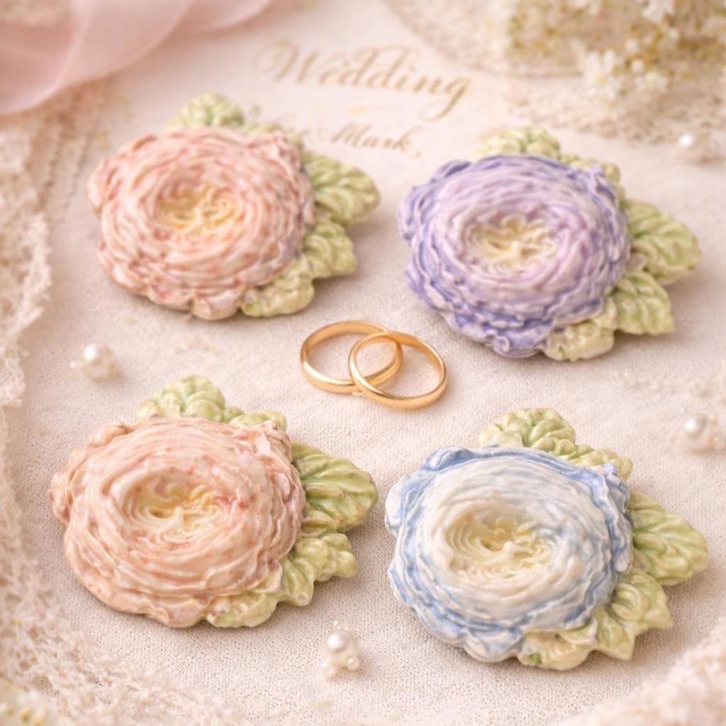 Its delicate palette and heirloom feel make it especially suited for bridal looks, bridesmaid gifts, or wedding favors that last long after the day has passed.