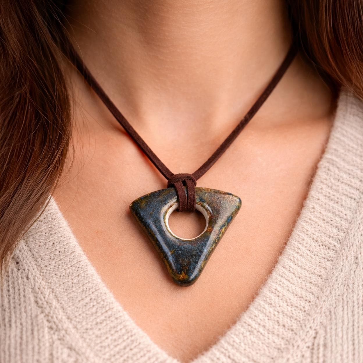 This one-of-a-kind ceramic pendant was entirely handcrafted and glazed by me in my studio. Shaped into a softly triangular, sculptural form with a central opening, it features a rich, organic glaze layered in deep blues, earthy browns, and subtle mineral tones—no two areas of the surface are the same.