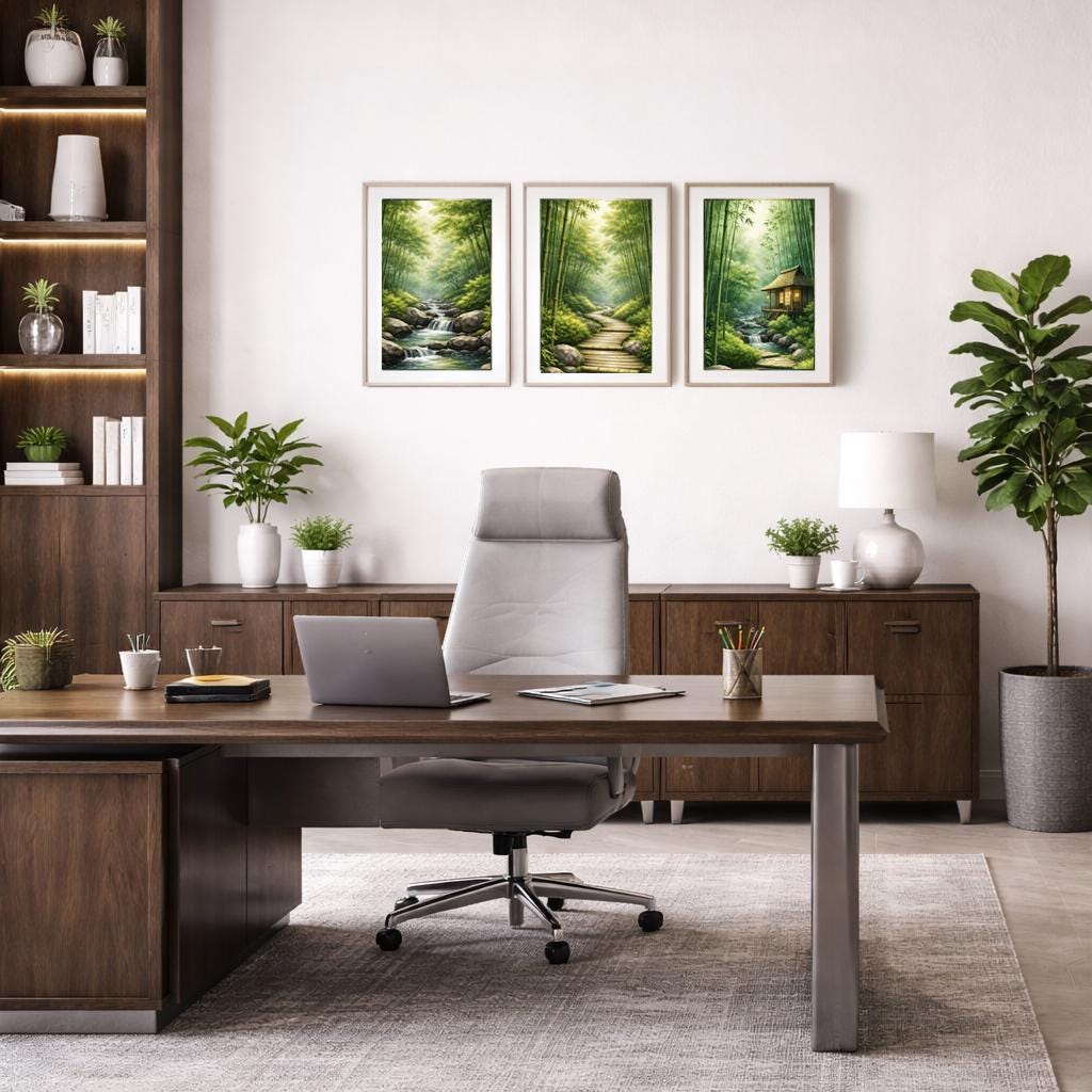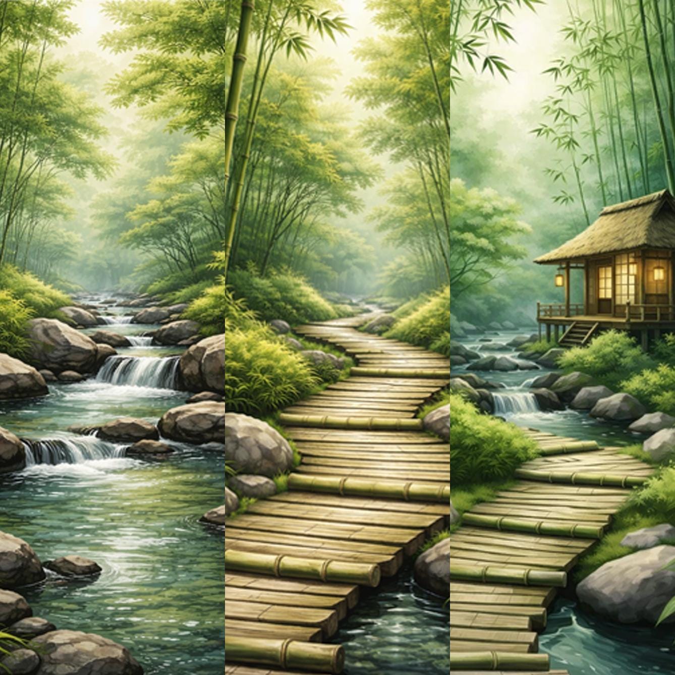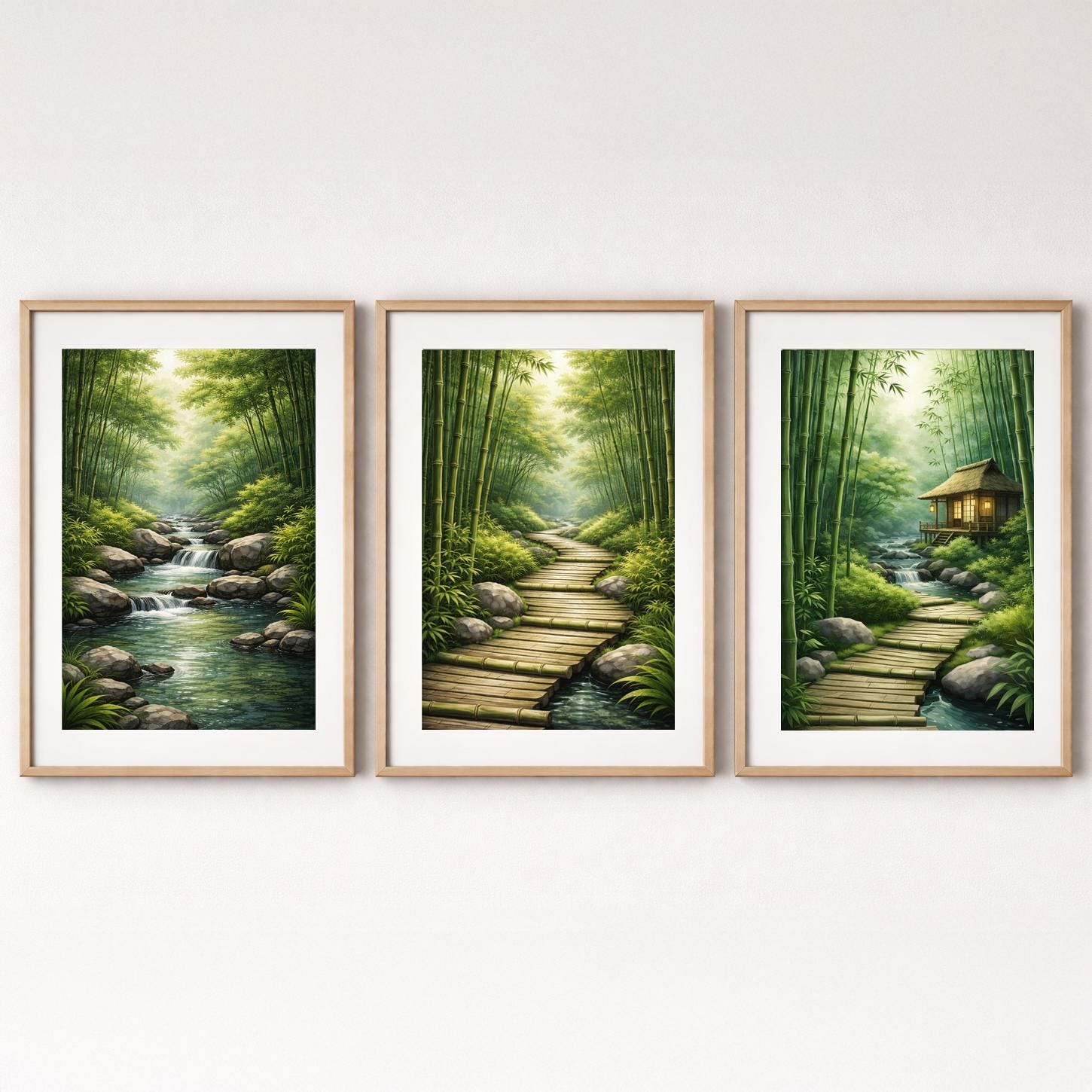 Each canvas features a tranquil bamboo forest scene. Together, the three canvases create a balanced visual rhythm that brings a sense of calm, clarity, and quiet focus to a space.