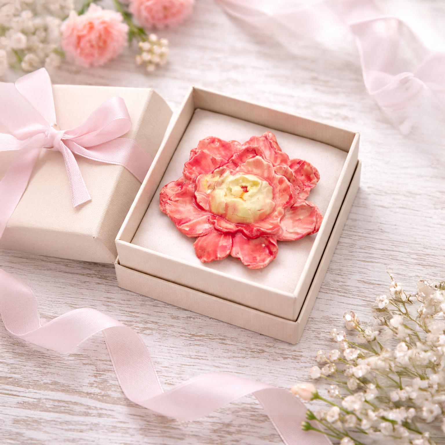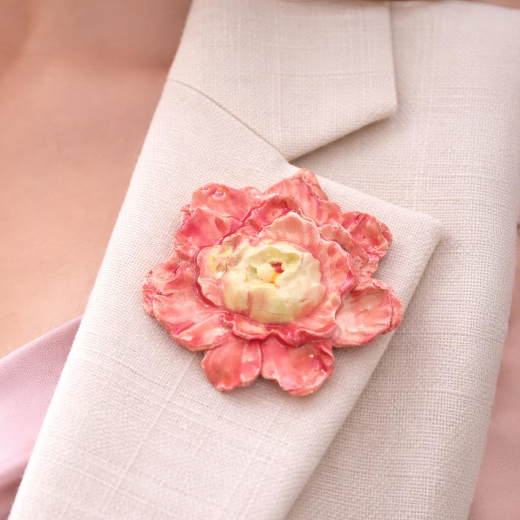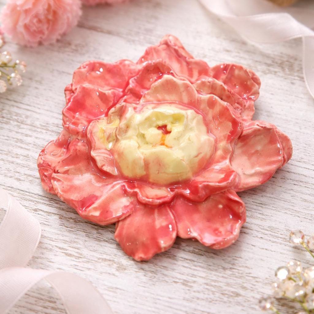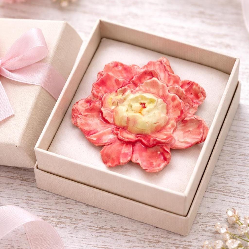 This sculptural ceramic flower is entirely handmade and glazed by hand, petal by petal. Soft blush and rose tones melt into a creamy center, creating a luminous, organic surface that catches the light beautifully. Each piece has subtle variations in color and form—part of its charm and proof of the hand behind it.