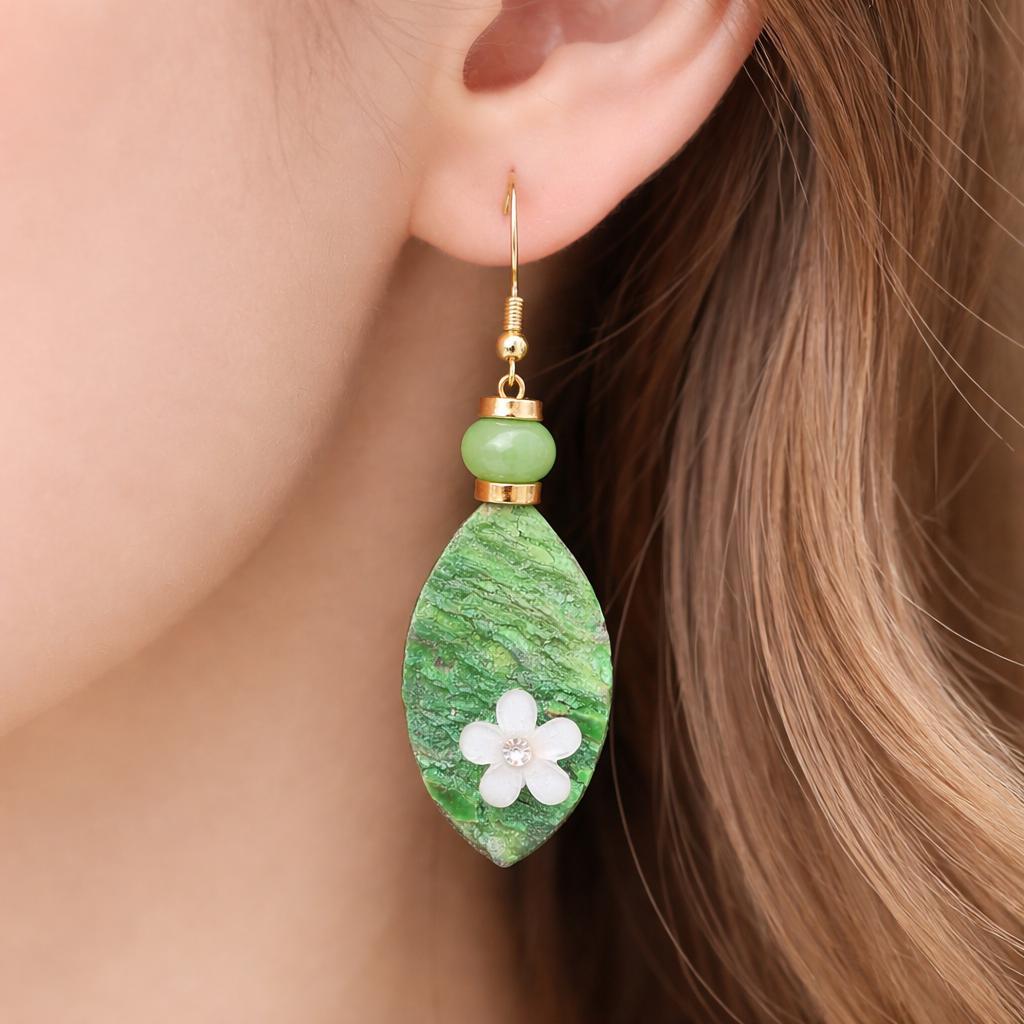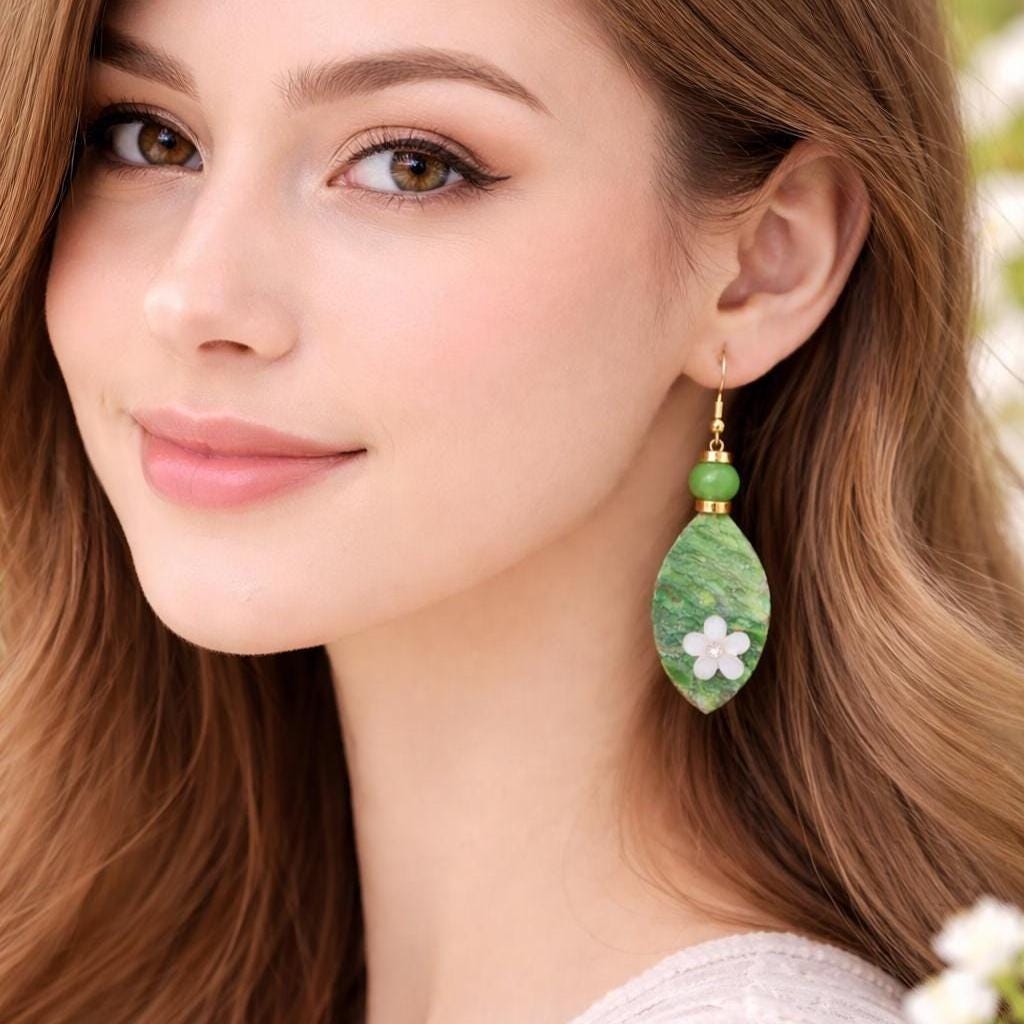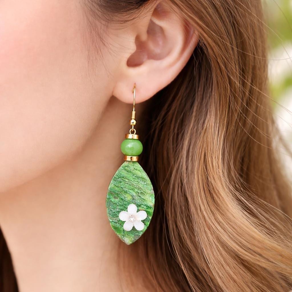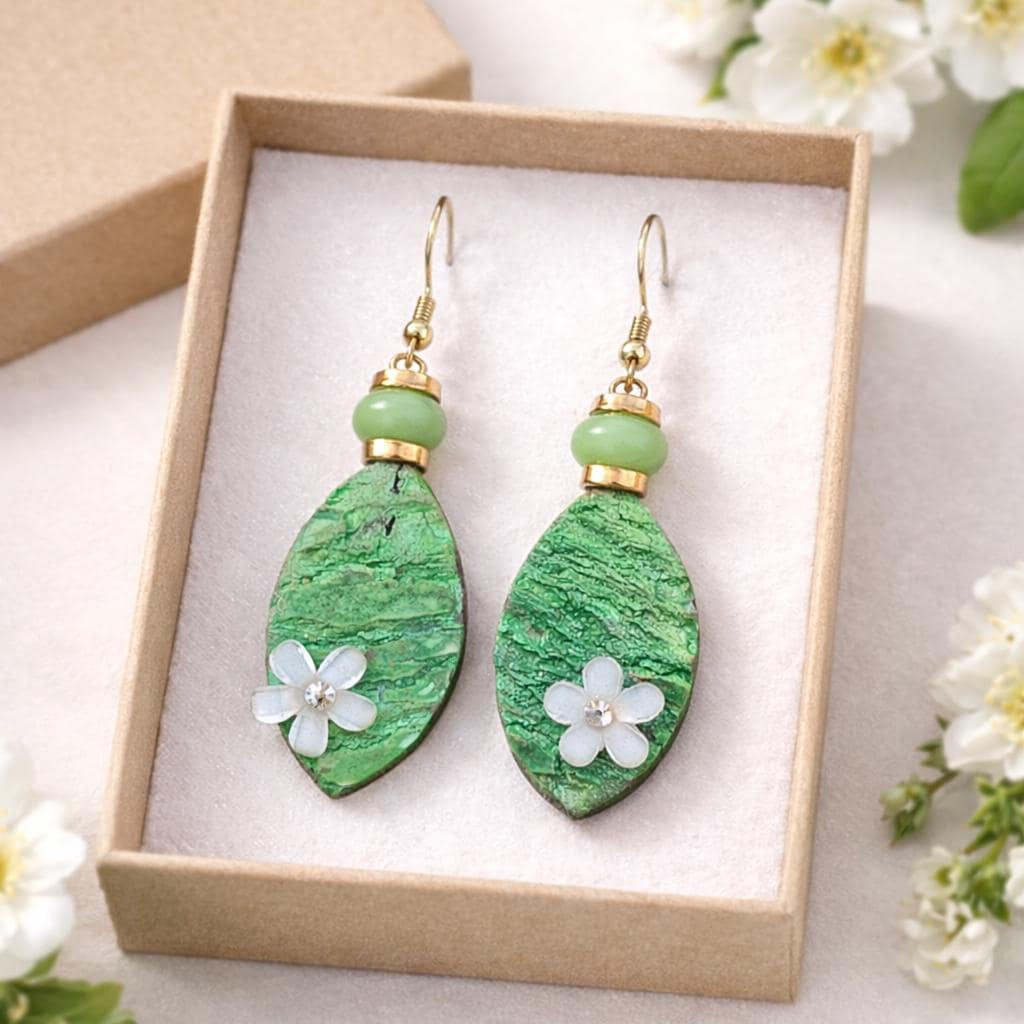 These handcrafted green floral earrings capture the feeling of early spring—fresh leaves, soft blooms, and natural texture brought together in a wearable piece of art.