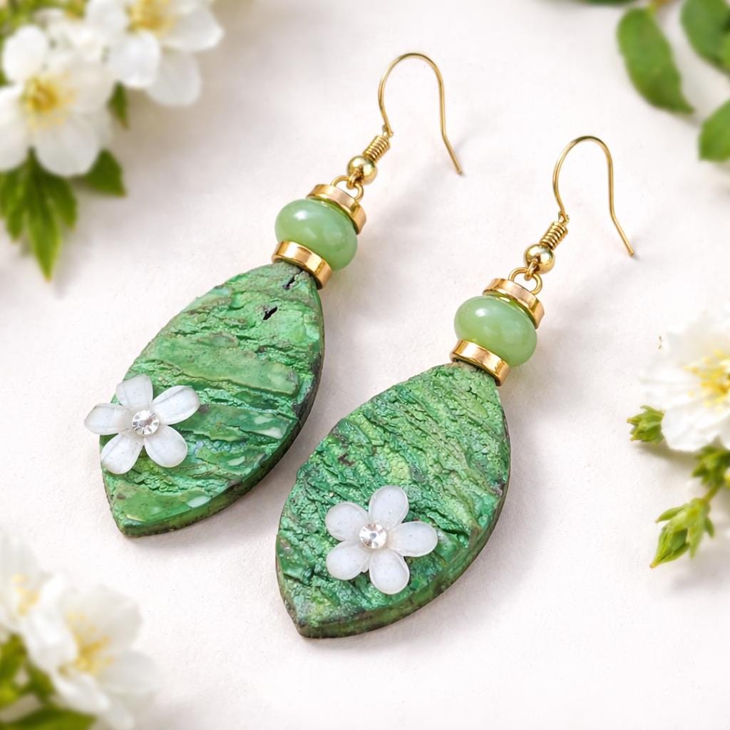Each teardrop is sculpted by hand from polymer clay and finished with a richly textured, stone-like surface in layered greens. A delicate white flower with a crystal center adds a gentle focal point, while pale green glass beads and gold-tone accents complete the design with warmth and balance.