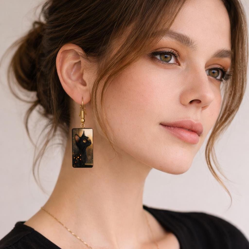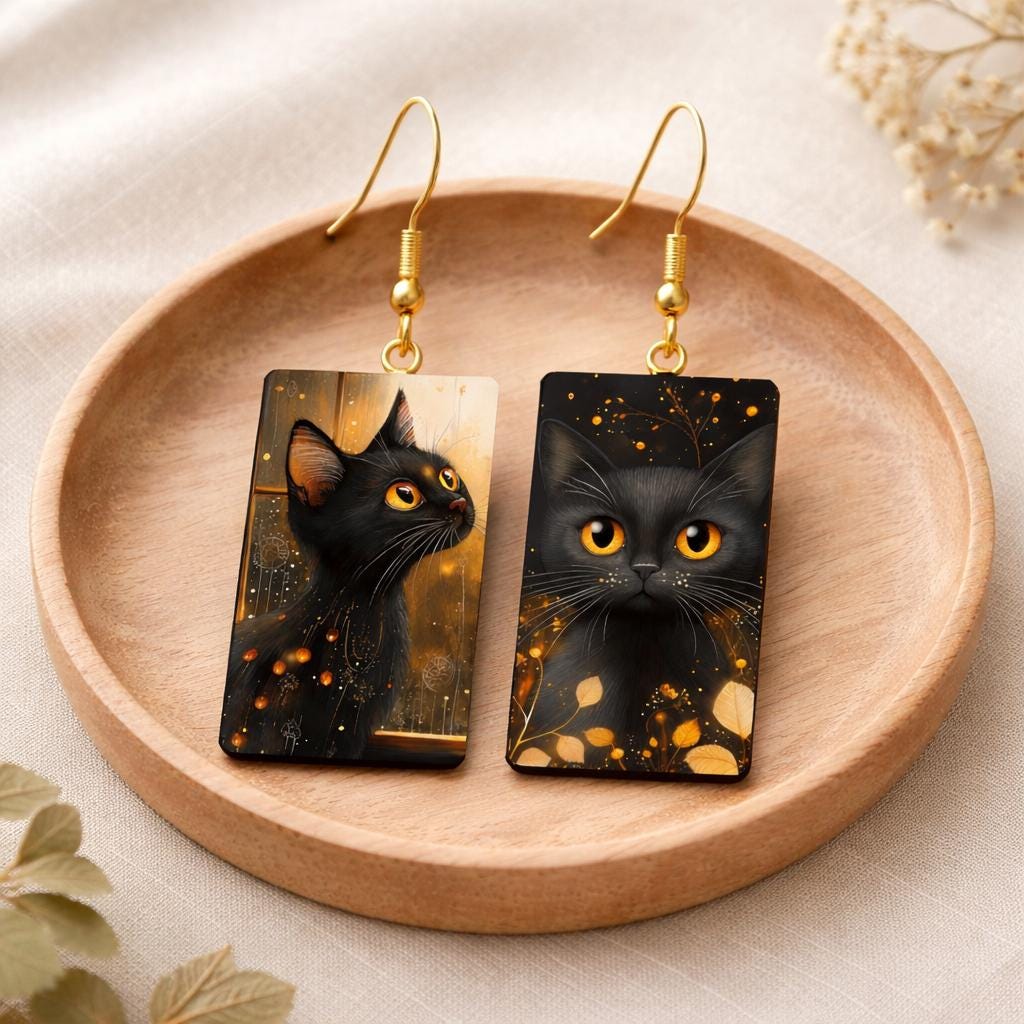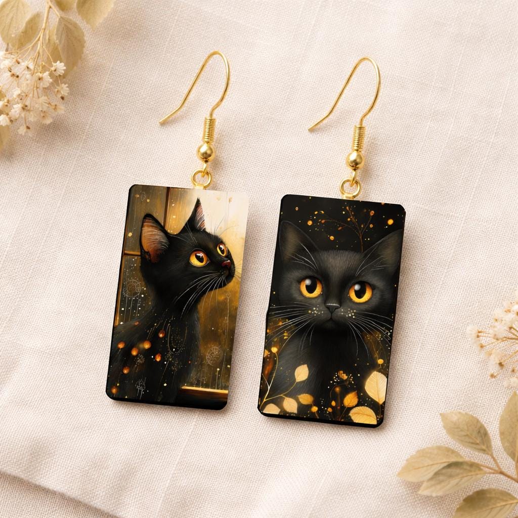 These rectangular black cat earrings feature glowing amber eyes against a dark, atmospheric background, creating a dramatic yet wearable statement. The artwork is rich in detail, with subtle golden accents that catch the light beautifully.