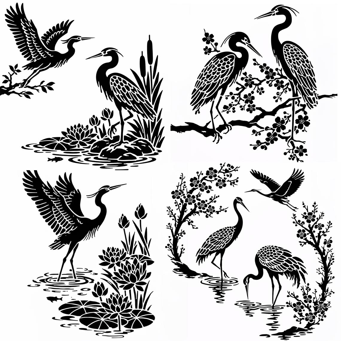 A curated set of 4 elegant heron stencils inspired by traditional Japanese design and natural wetland forms. Each composition is thoughtfully balanced with clean negative space and refined detail, allowing you to create sophisticated results on a variety of surfaces.