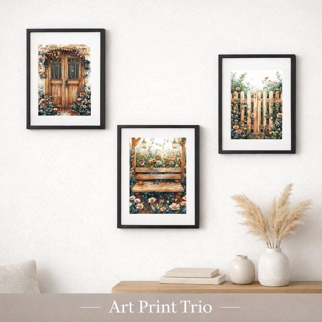 Transform your space with this set of three garden‑inspired art prints, featuring rustic floral scenes that bring warmth, charm, and timeless beauty to any home. Each print captures nature’s serenity — a weathered wooden door, a cozy garden bench, and a blooming picket fence — perfect for farmhouse, cottagecore, or vintage‑style décor.