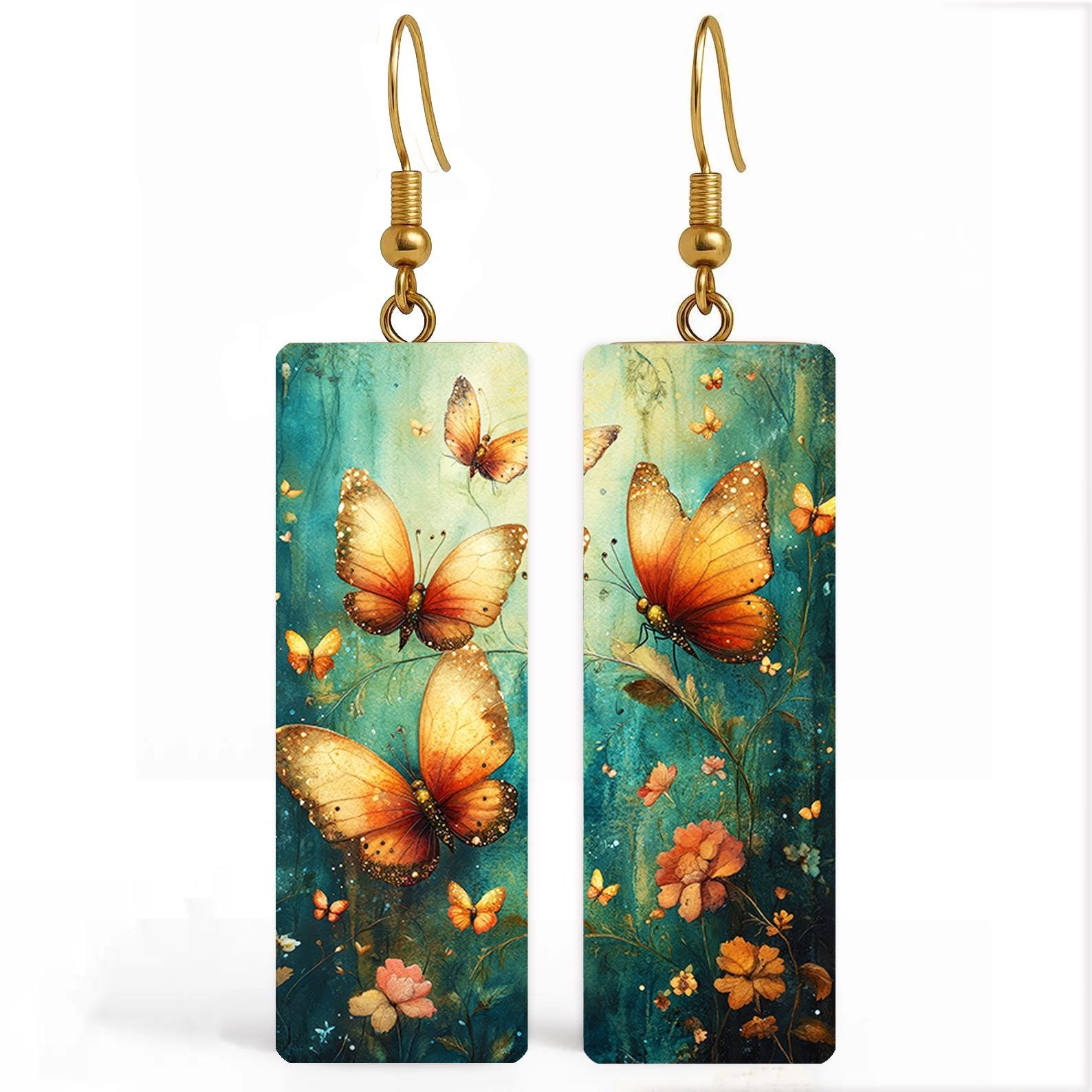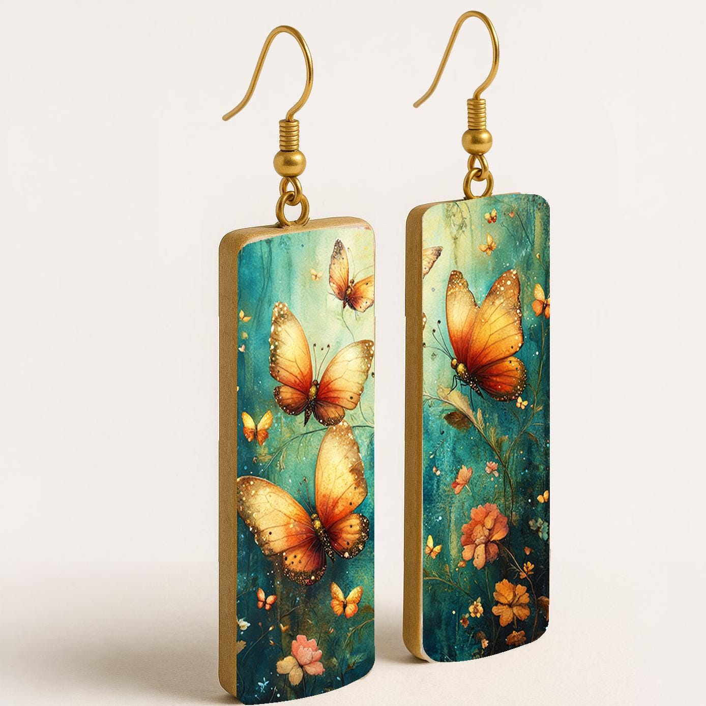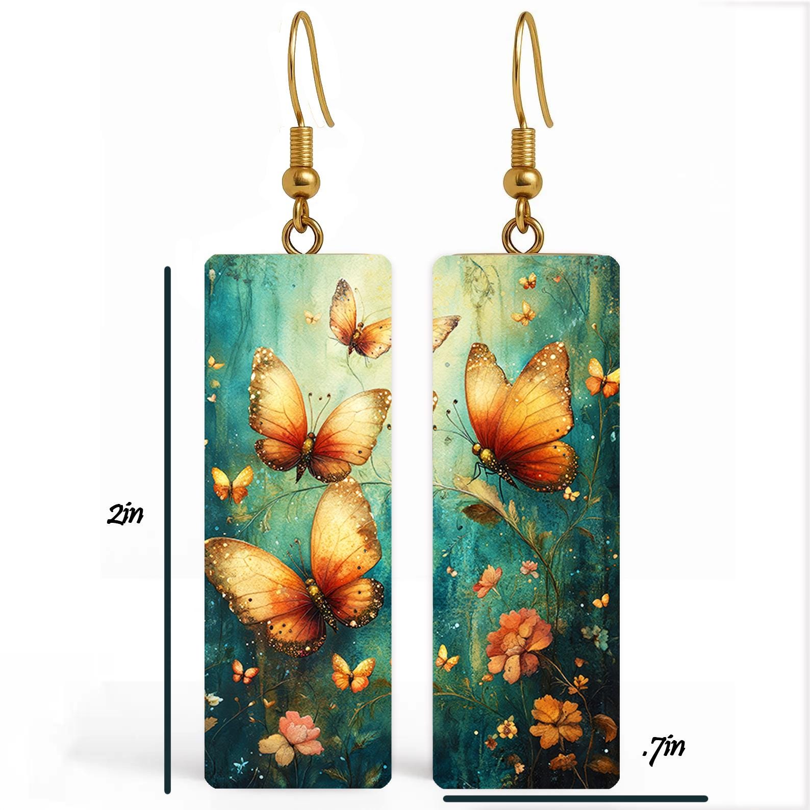 Bring a touch of dreamy nature to your everyday style with these stunning butterfly dangle earrings. Featuring rich teal backgrounds with warm golden-orange butterflies and delicate floral accents, these earrings feel like a tiny piece of art you can wear.