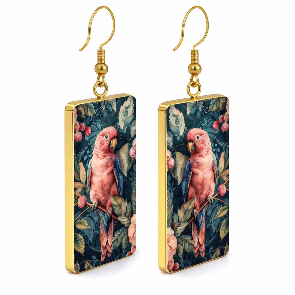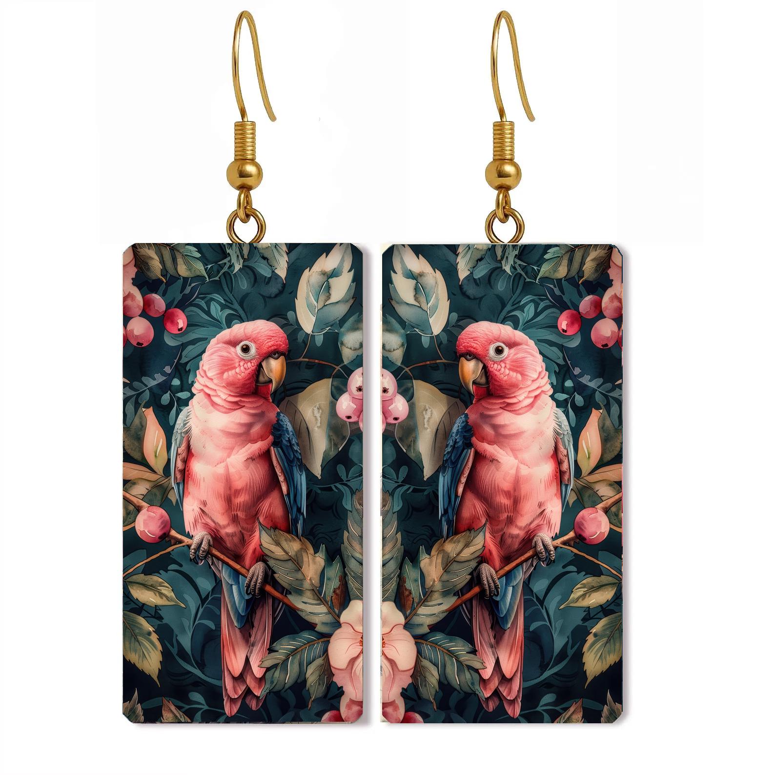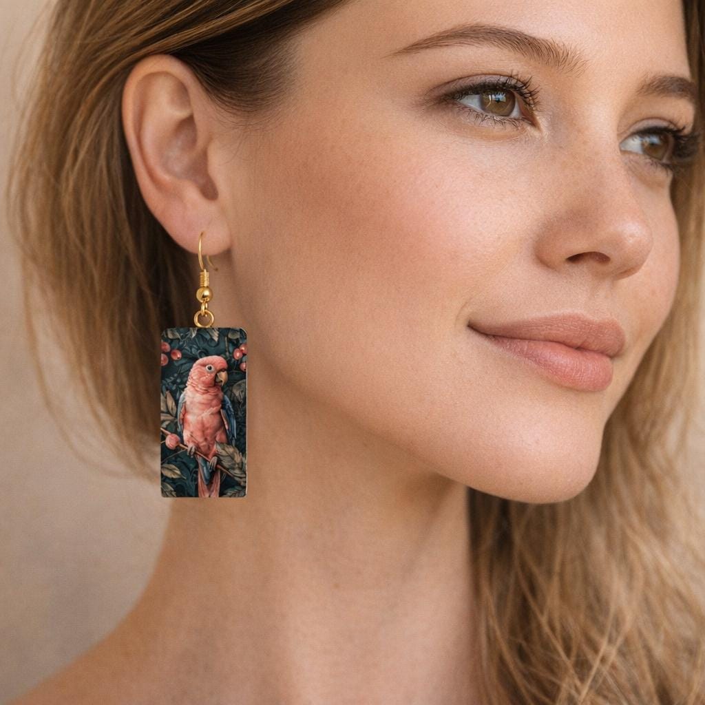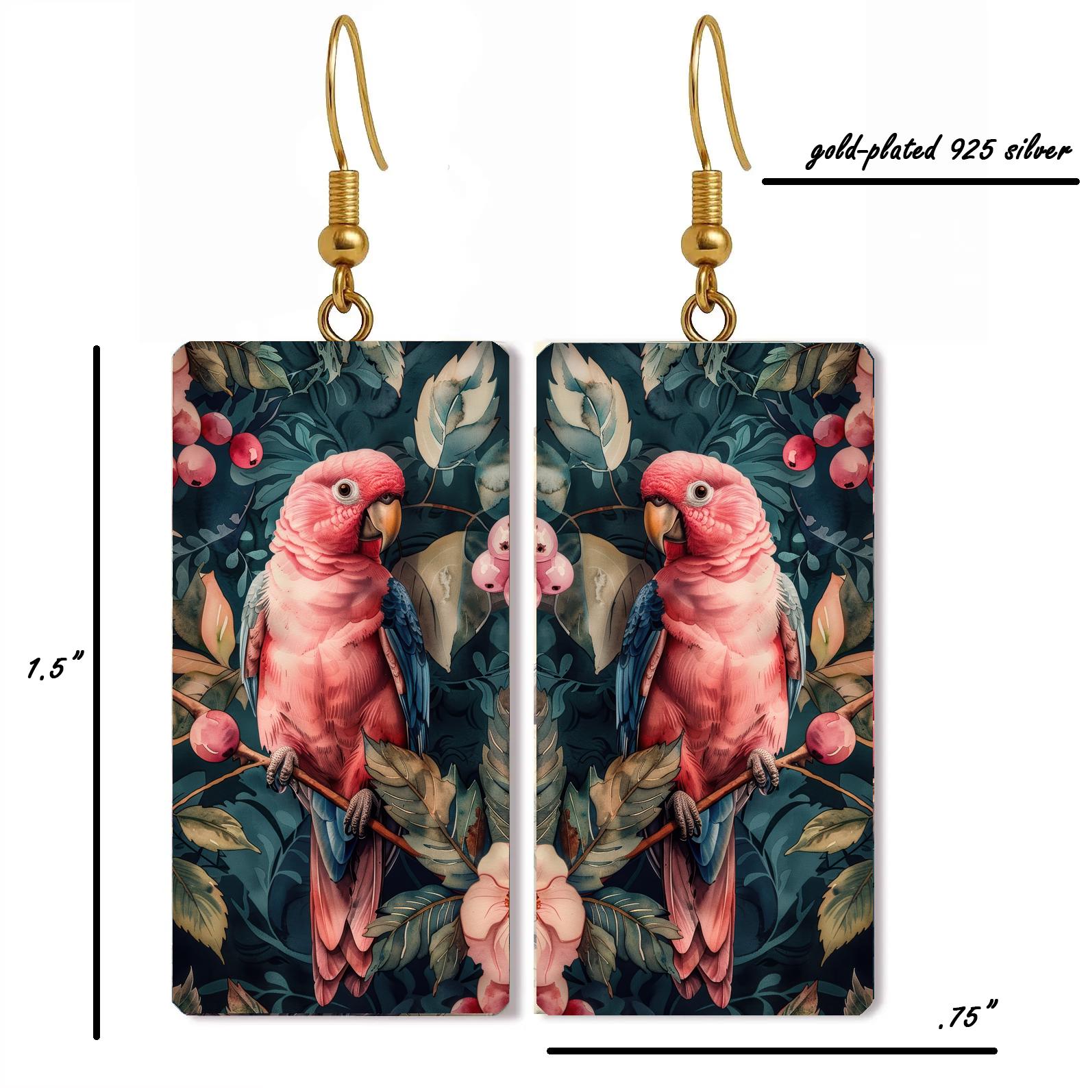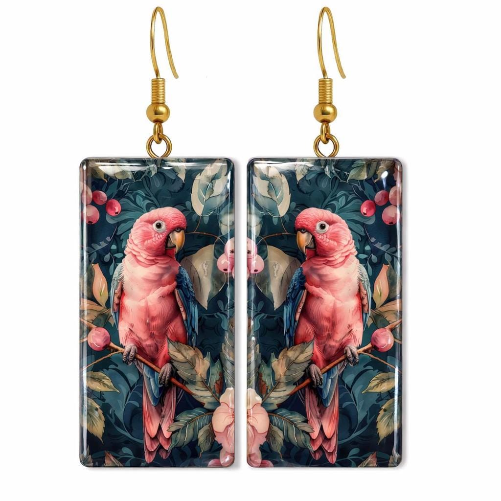Bright, bold, and beautifully tropical—these pink parrot earrings bring a touch of exotic charm to any outfit. Each pair features detailed artwork of pink parrots perched among lush green foliage and berries, creating a miniature piece of wearable art that feels both whimsical and elegant.