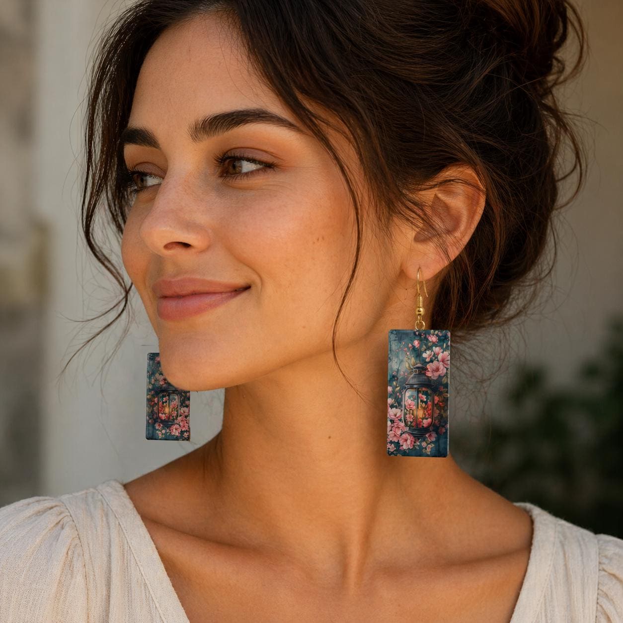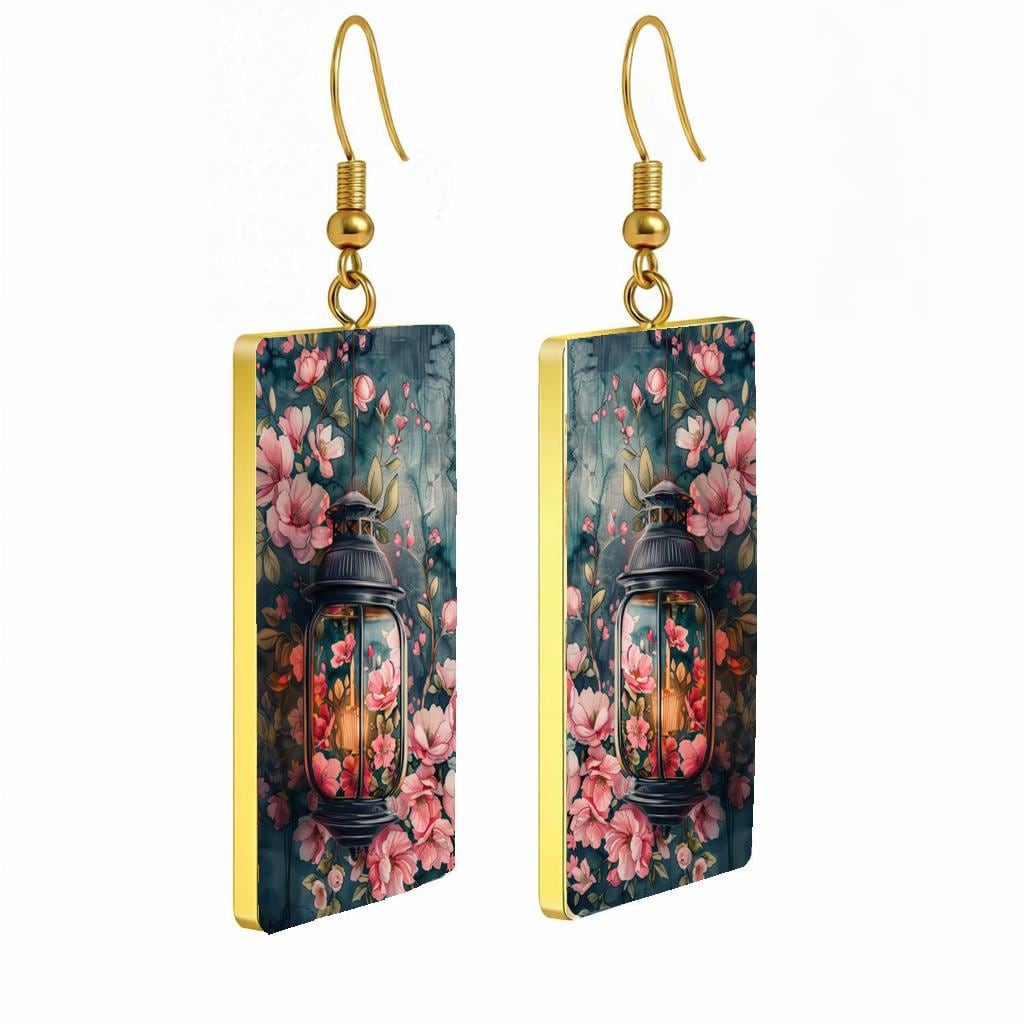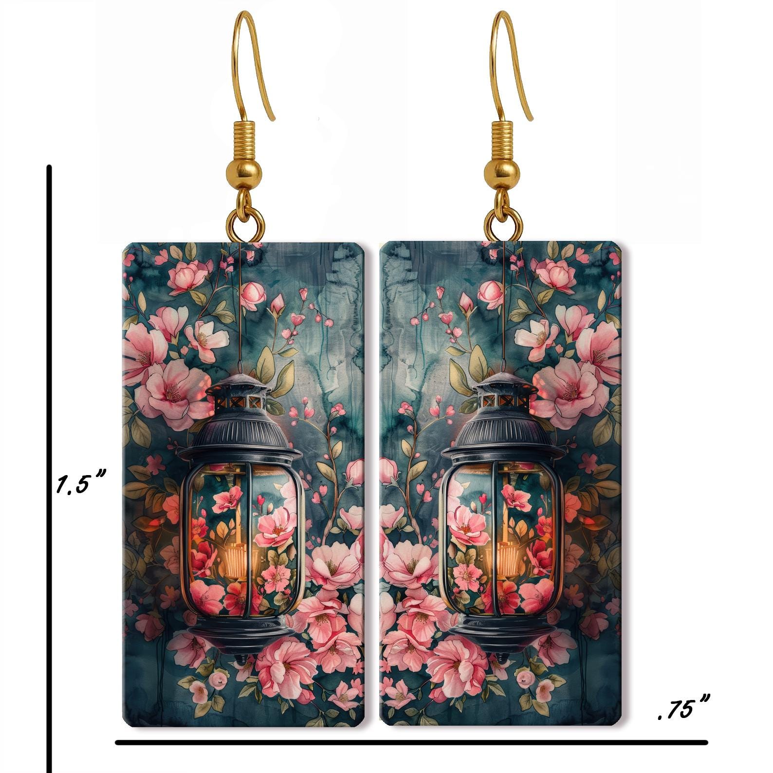 These romantic statement earrings feature a glowing vintage lantern surrounded by soft pink florals, set against a rich teal background. The artwork has a painterly, almost storybook feel—like a quiet evening lit by candlelight and blossoms in bloom.