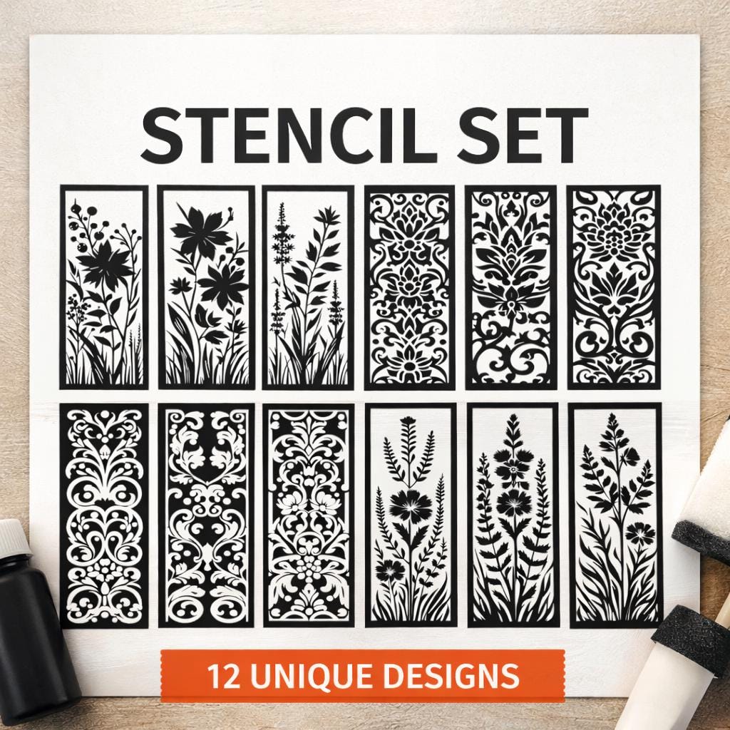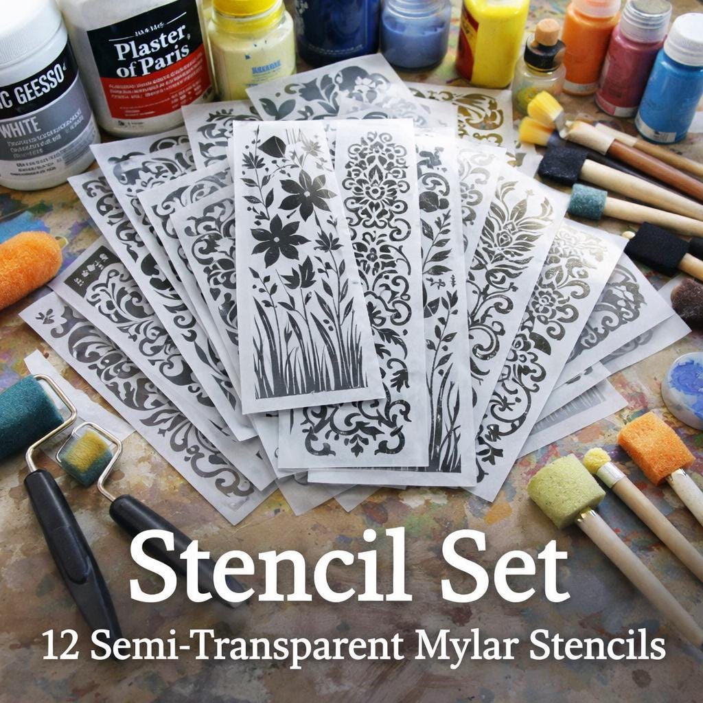 A premium collection of 12 semi‑transparent Mylar stencils featuring intricate floral and ornamental designs. Perfect for mixed‑media art, furniture painting, wall decor, and plaster or gesso projects. Durable, reusable, and compatible with brushes, rollers, sponges, and paints — ideal for artists, crafters, and DIY enthusiasts.