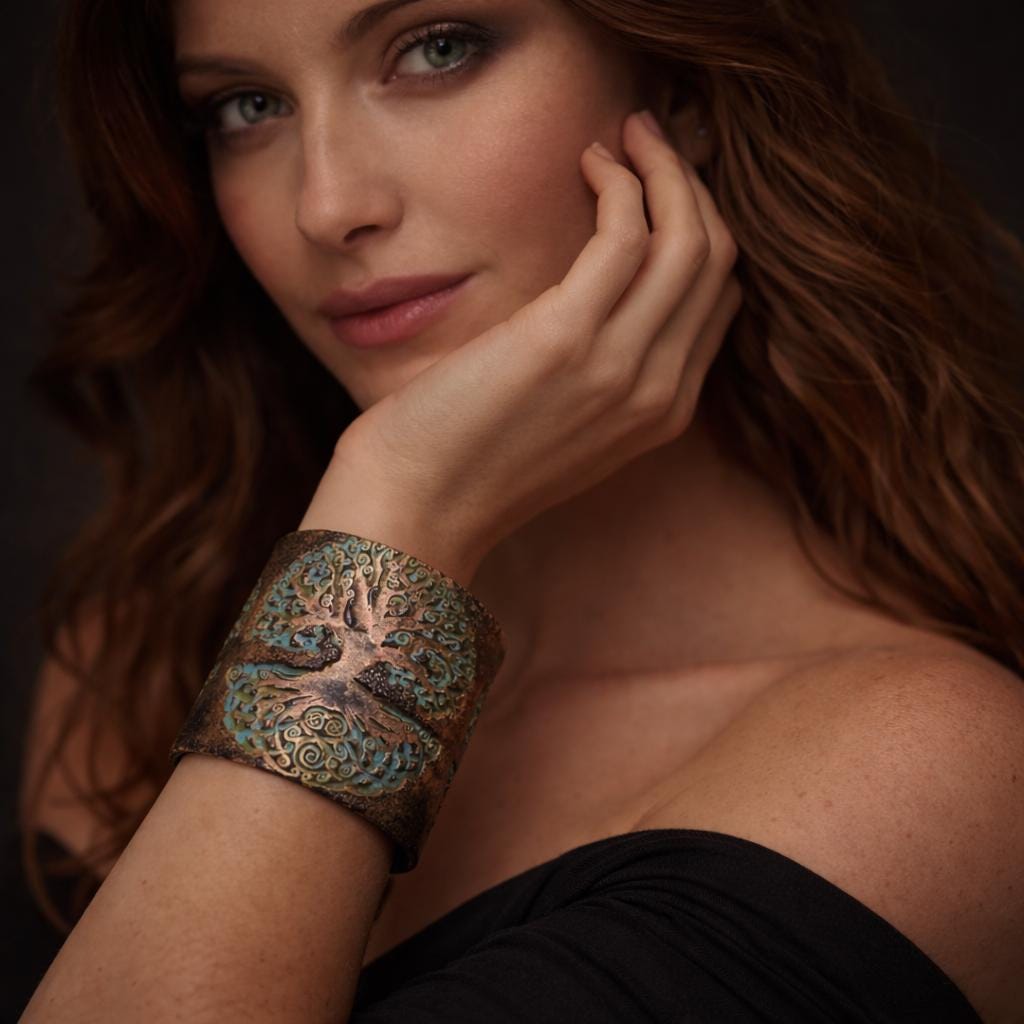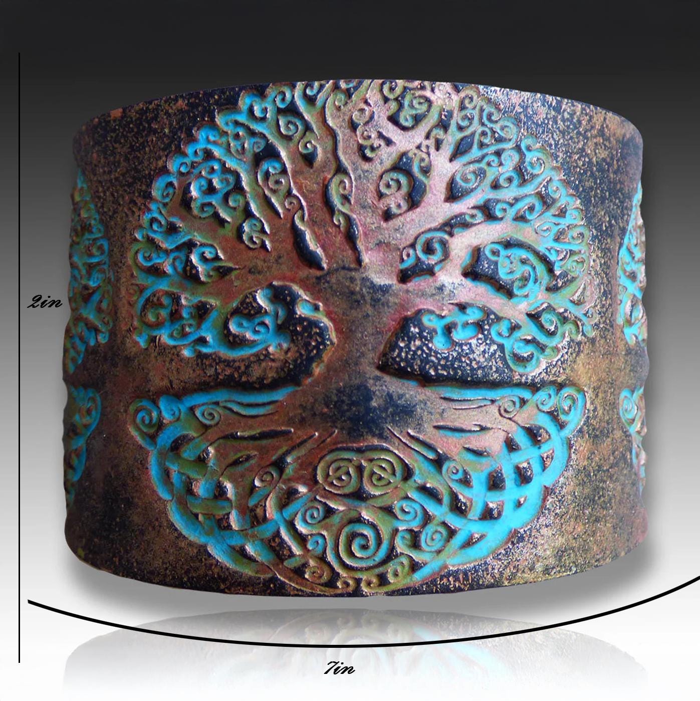 This handcrafted Tree of Life cuff is one of my signature wide statement pieces, designed to sit snug and structured on the wrist. The surface mimics aged rusted copper and bronze, accented with a vibrant turquoise patina that highlights the intricate, flowing tree design.