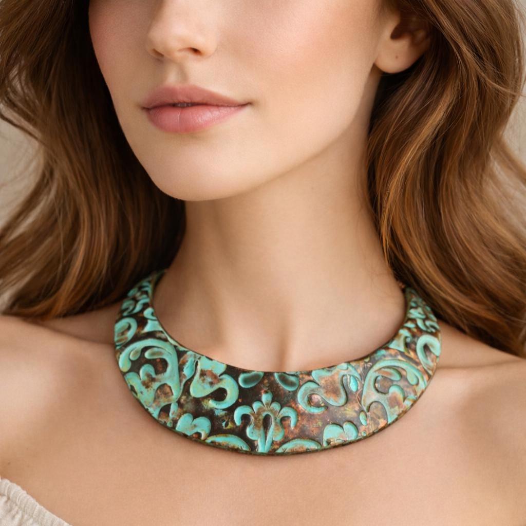 This handcrafted polymer clay necklace looks like it has been exposed to the unforgiving forces of both weather and time. It is aged, it is distressed, the alloy of bronze and copper has rusted and has been covered with verdigris. Yet in spite - or because - of it, it looks just as beautiful, unique, and regal, if not more.